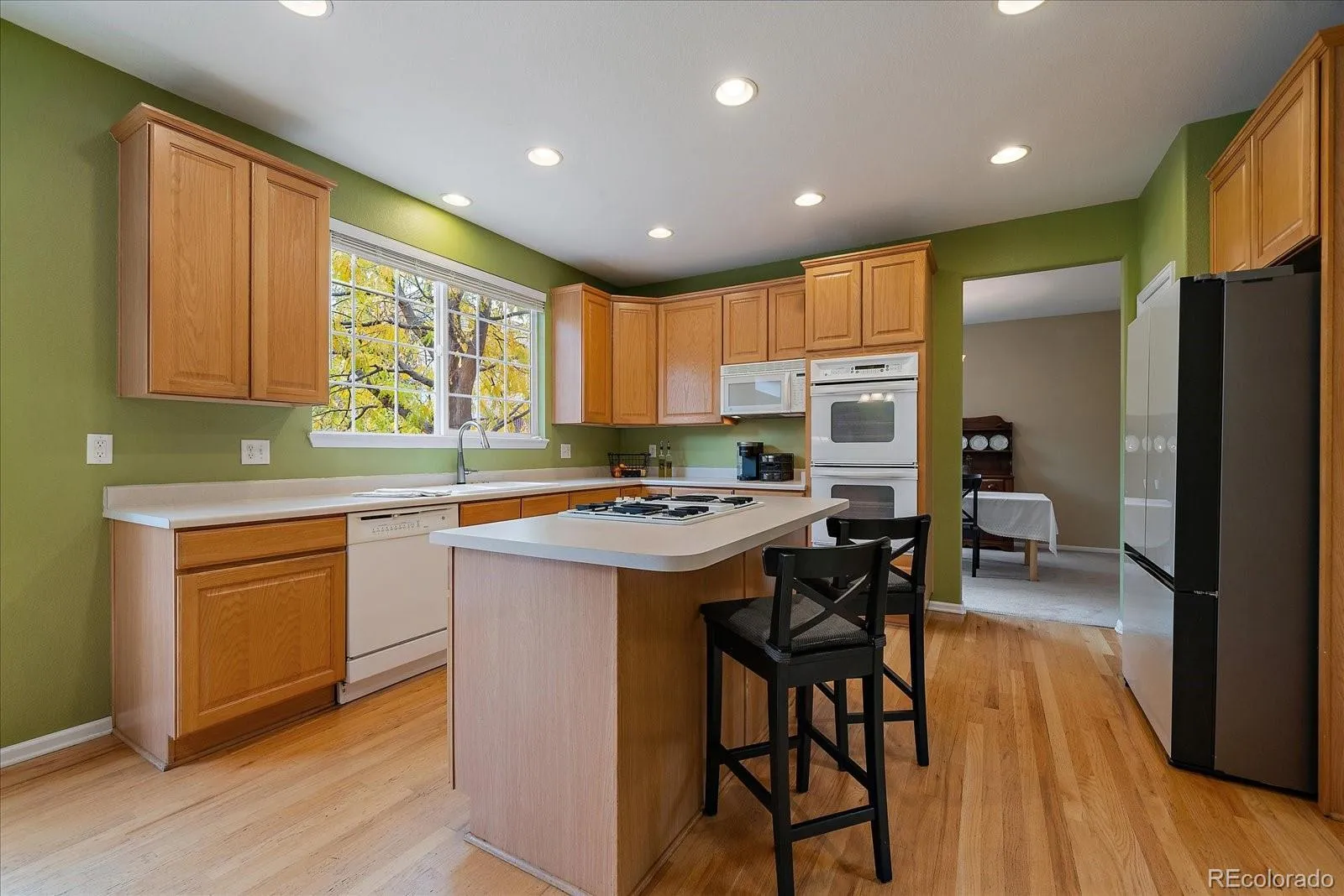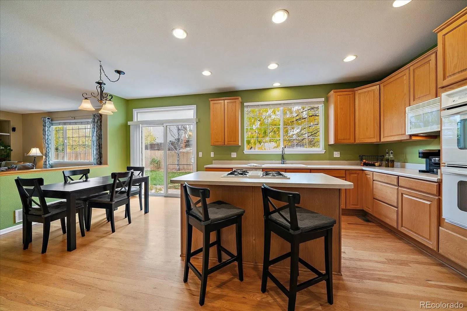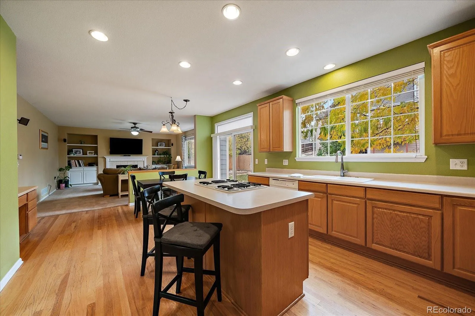 Step inside to discover a bright and open floor plan filled with natural light, high ceilings, and thoughtful design. The kitchen offers abundant cabinetry, stainless steel appliances, and a convenient island — perfect for both casual dining and entertaining. The adjoining living and dining spaces create an easy flow for gatherings, while large windows frame views of the beautifully landscaped yard.
