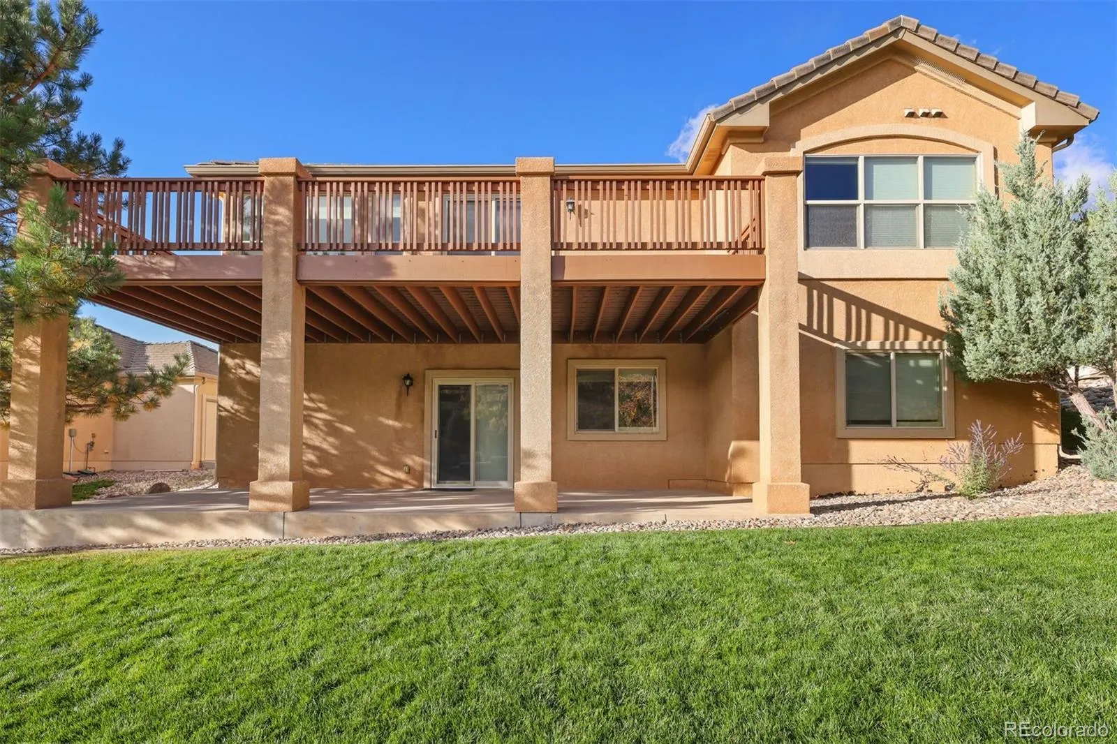 Welcome home to this beautifully appointed ranch-style retreat offering four bedrooms, three bathrooms, and breathtaking views from every angle. The inviting kitchen features gleaming hardwood floors, granite countertops, stainless steel appliances including a gas range, a walk-in pantry, and an adjoining dining space perfect for everyday living or entertaining. The open-concept family room showcases a cozy gas fireplace, hardwood flooring, and seamless flow to the dining nook. The main-level primary suite is a true haven with a luxurious 5-piece bath featuring a walk-in shower and jetted soaking tub. Step out from the main level to the enclosed composite deck and take in the serene scenery of the bluff directly behind the home. A main-level office provides the perfect space for the stay-at-home professional. Downstairs, the finished walk-out basement offers three spacious bedrooms, a full bath, and a large recreation room with a wet bar, ideal for entertaining or movie nights. Walk out to the lower patio and enjoy the private backyard surrounded by natural beauty. Located in the highly desired Peregrine neighborhood, this home is within the award-winning Academy District 20 schools and just a short drive to the Air Force Academy, shopping, restaurants, and entertainment. Experience the perfect blend of comfort, elegance, and Colorado living at its finest.