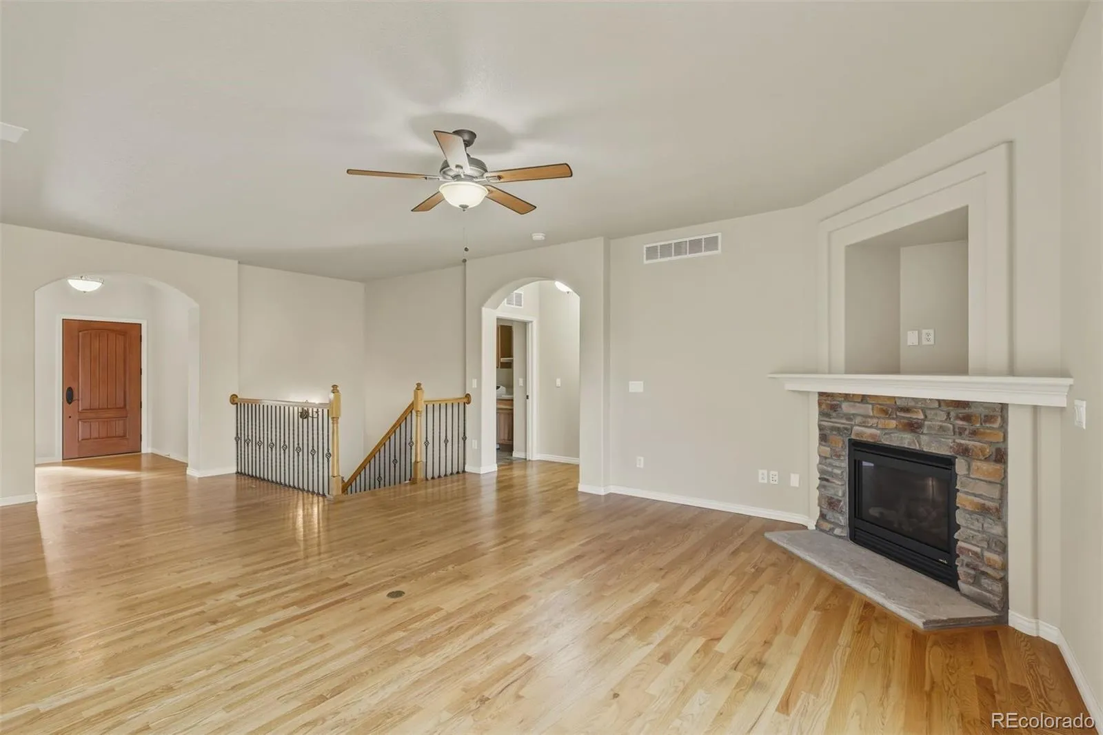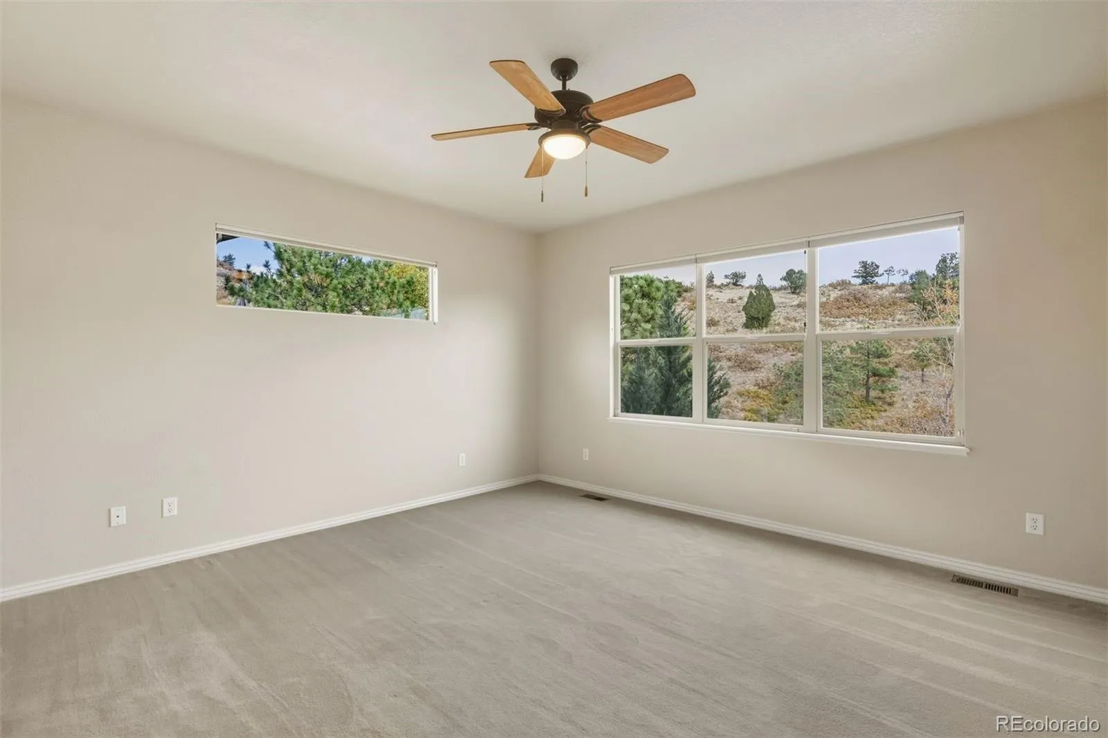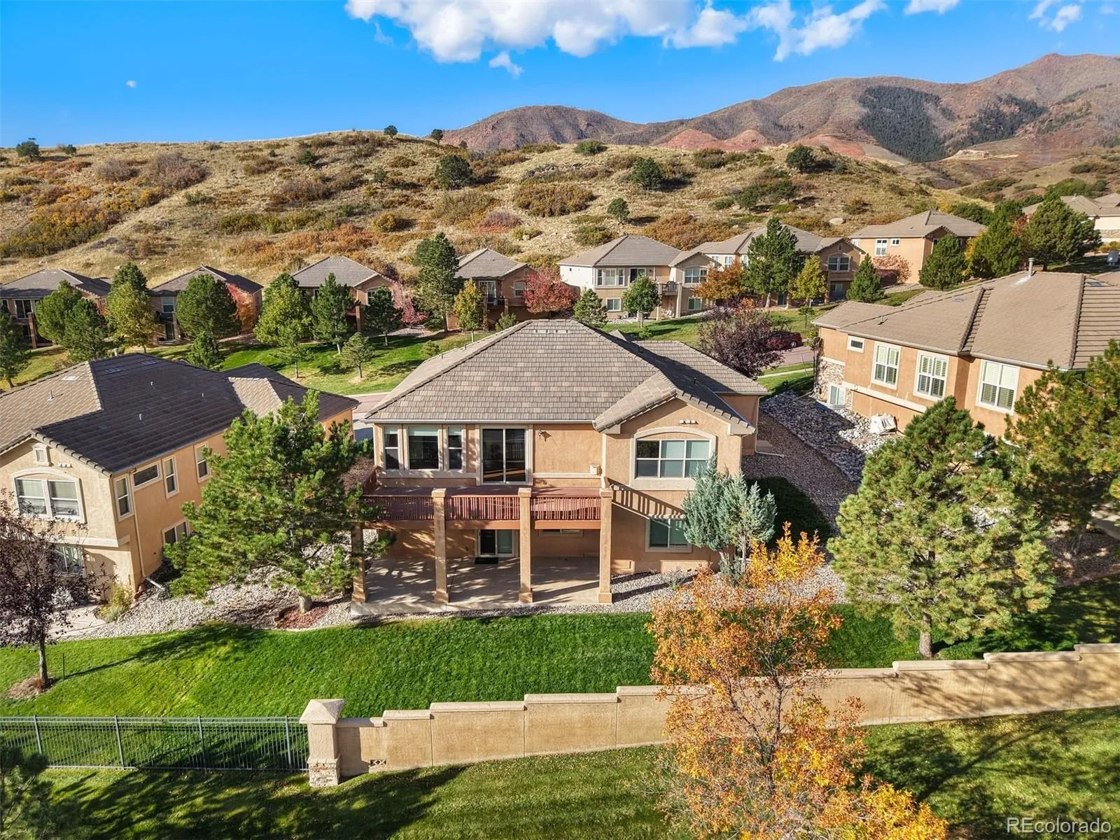 Welcome home to this beautifully appointed ranch-style retreat offering four bedrooms, three bathrooms, and breathtaking views from every angle. The inviting kitchen features gleaming hardwood floors, granite countertops, stainless steel appliances including a gas range, a walk-in pantry, and an adjoining dining space perfect for everyday living or entertaining. The open-concept family room showcases a cozy gas fireplace, hardwood flooring, and seamless flow to the dining nook. The main-level primary suite is a true haven with a luxurious 5-piece bath featuring a walk-in shower and jetted soaking tub. Step out from the main level to the enclosed composite deck and take in the serene scenery of the bluff directly behind the home. A main-level office provides the perfect space for the stay-at-home professional. Downstairs, the finished walk-out basement offers three spacious bedrooms, a full bath, and a large recreation room with a wet bar, ideal for entertaining or movie nights. Walk out to the lower patio and enjoy the private backyard surrounded by natural beauty. Located in the highly desired Peregrine neighborhood, this home is within the award-winning Academy District 20 schools and just a short drive to the Air Force Academy, shopping, restaurants, and entertainment. Experience the perfect blend of comfort, elegance, and Colorado living at its finest.