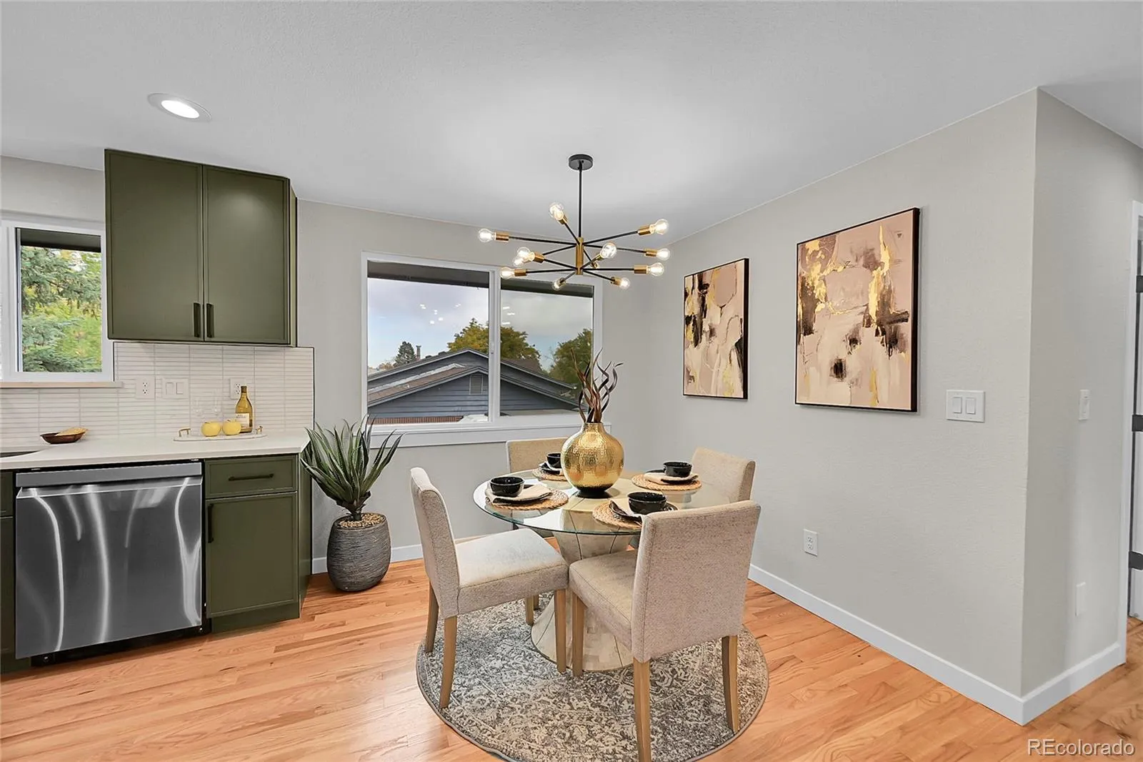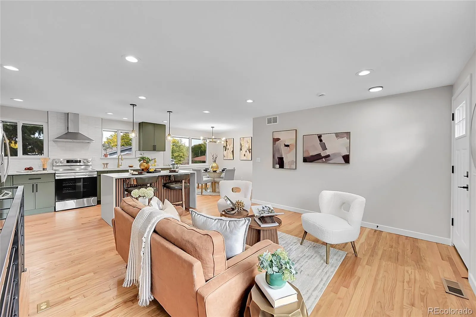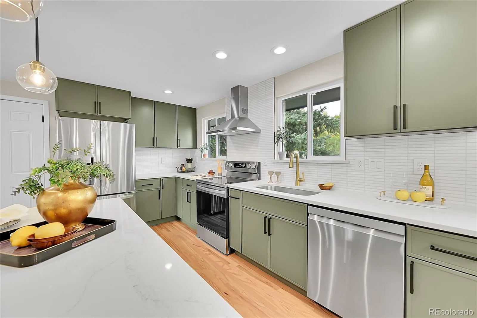 Beautifully updated and on a generous corner lot, this 5-bedroom, 3-bath residence in Denver’s desirable Berkley neighborhood is ready to impress! A wide front porch welcomes you into the bright, 2,000 sq ft interior, featuring an open-concept layout with wood-style flooring, recessed lighting, refined millwork, and soothing neutral hues. Seamlessly flowing from the living and dining areas, your entertainer’s kitchen shines with a pendant-lit waterfall island, abundant cabinetry, and stainless steel appliances.