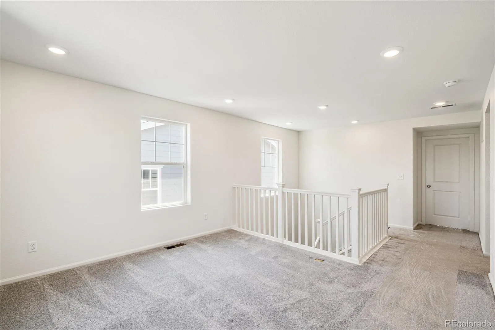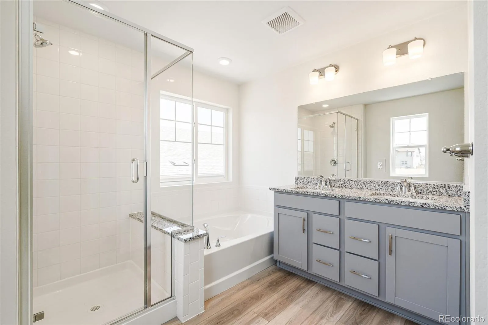 and a soaker tub and shower . From the primary bedroom down the hallway at the top of the stair landing is a spacious