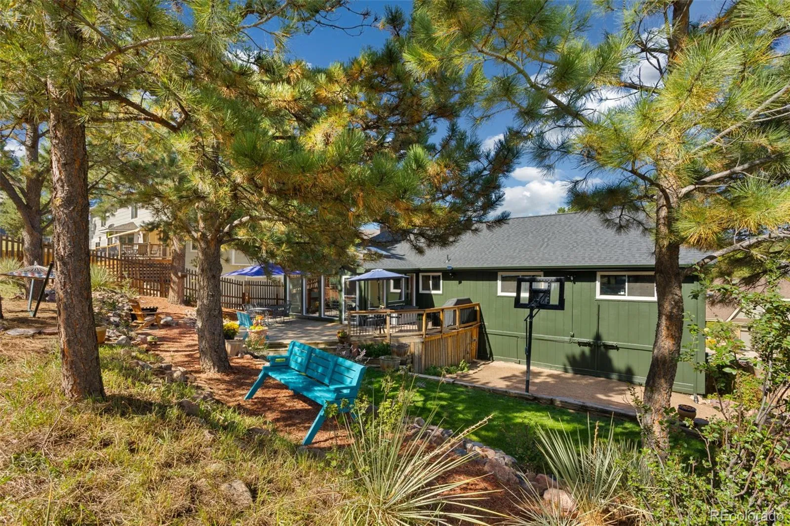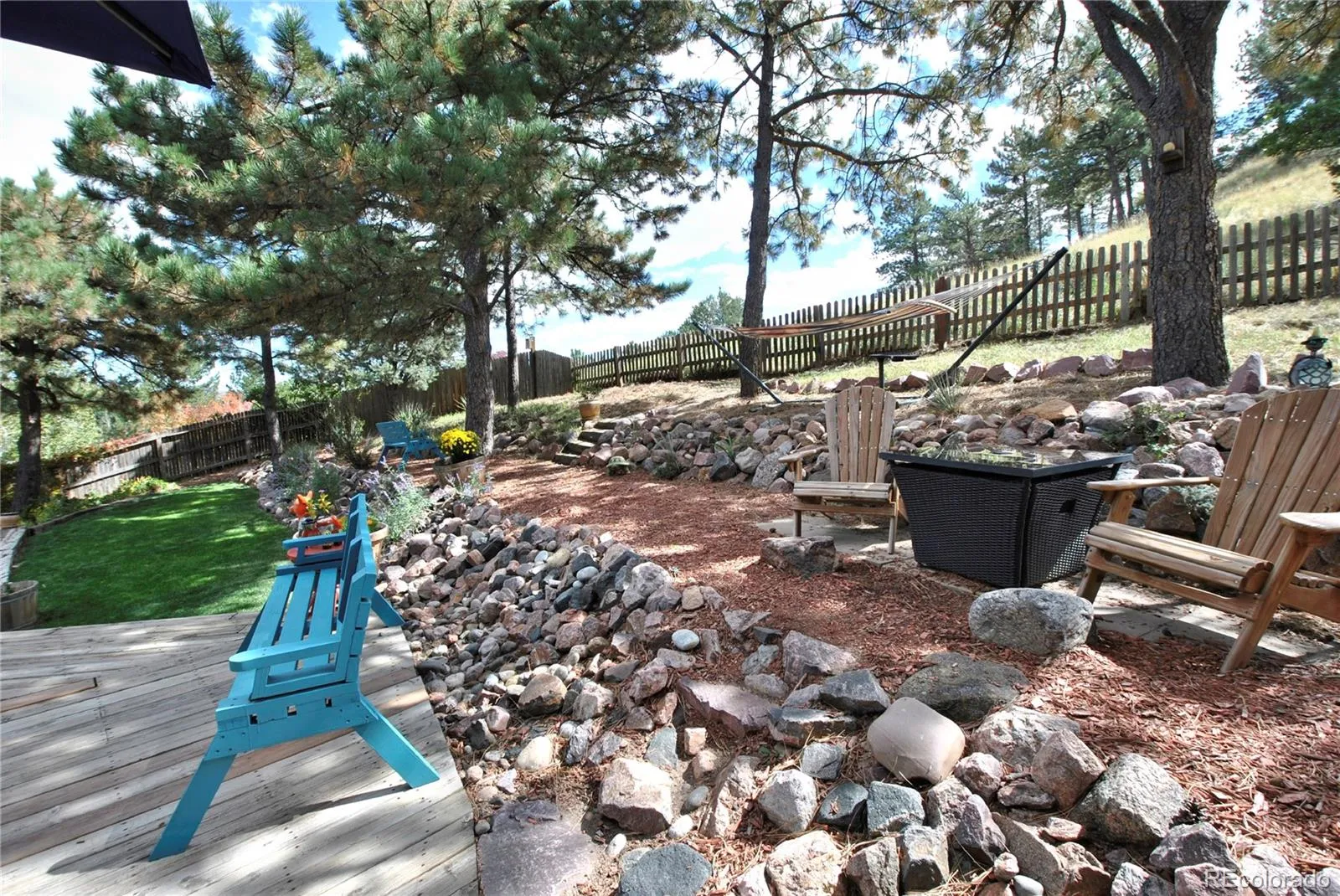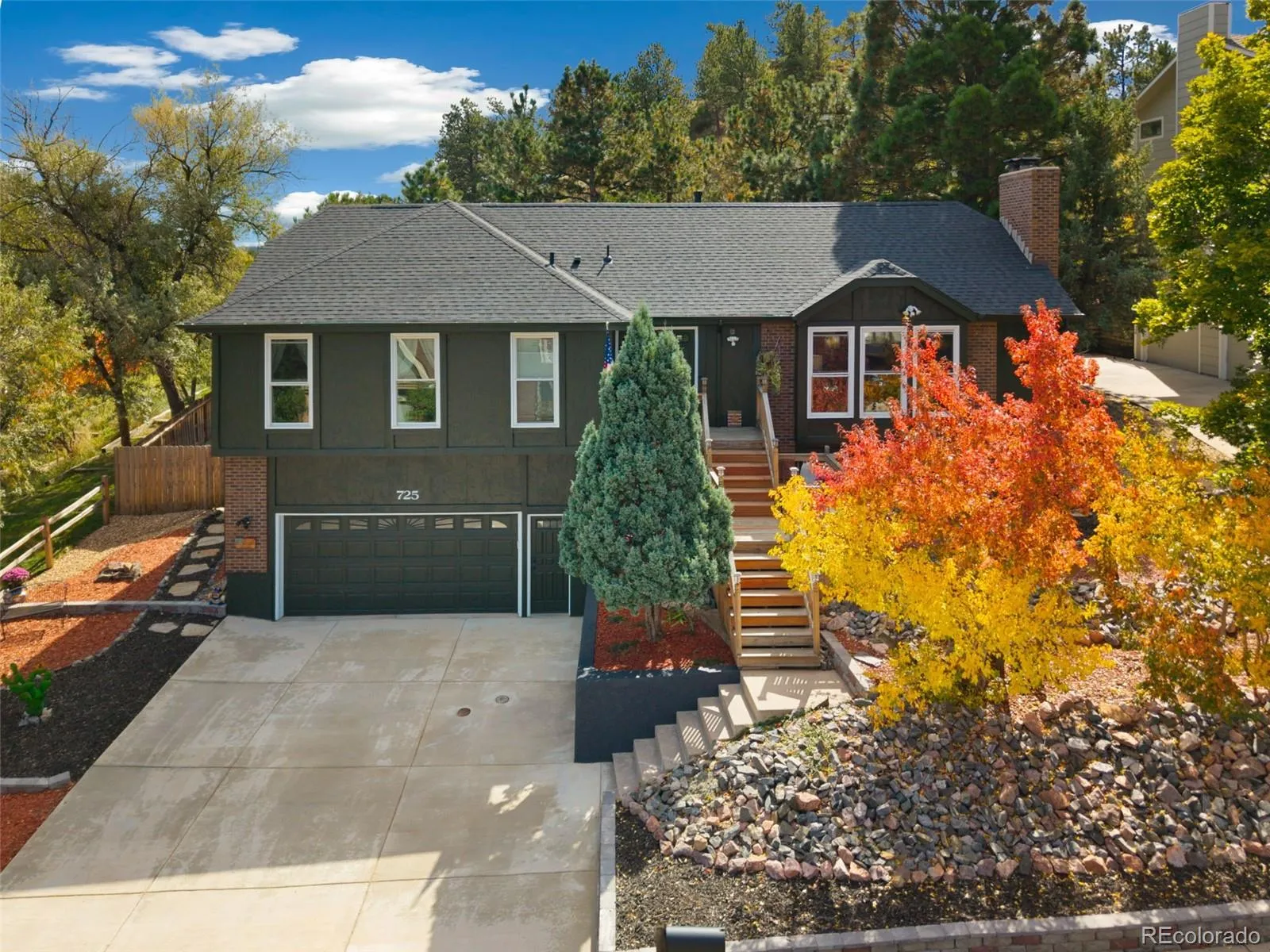 BEAUTIFUL UPDATES!! And remodeling in this raised ranch home that backs to Rockrimmon Open Space. Beautiful zeroscaping with huge wrap around rear deck accented by pine trees and scrub oak. Luxury Vinyl floors and designer paint greet you into this vaulted open house. Gorgeous granite kitchen with gourmet gas stove, Stainless Steel appliances, instant hot water faucet and pullout cabinets. Dining room with built-in Custom bar with beverage refrigerator included. Bright open sunroom walks out of kitchen area and through to the deck and Mountain Views. All tiled baths plus a master suite with full wall of closers. Enjoy the wood brick fireplace in the lower family room with TV included. Brand New Roof, Gutters, exterior paint and driveway, extended oversized 2 car garage, 50 gallon water heater New garage door opener and tons of garage storage shelving. District 20 Schools and easy access to Air Force Academy and I-25.