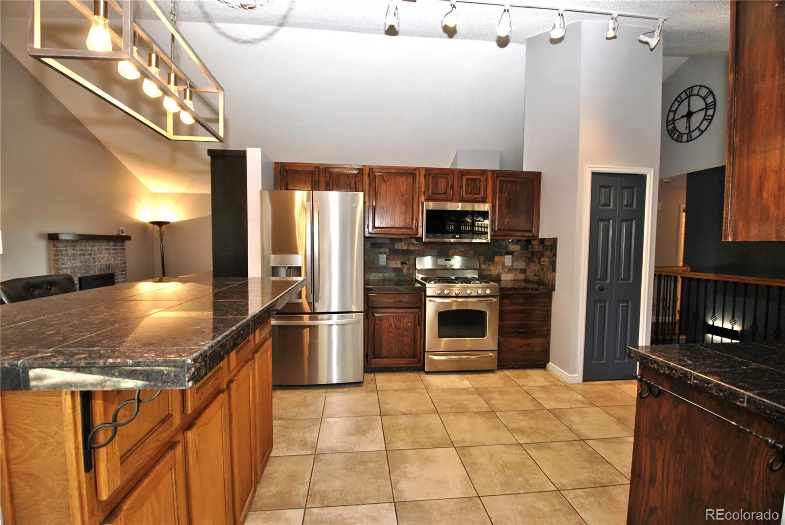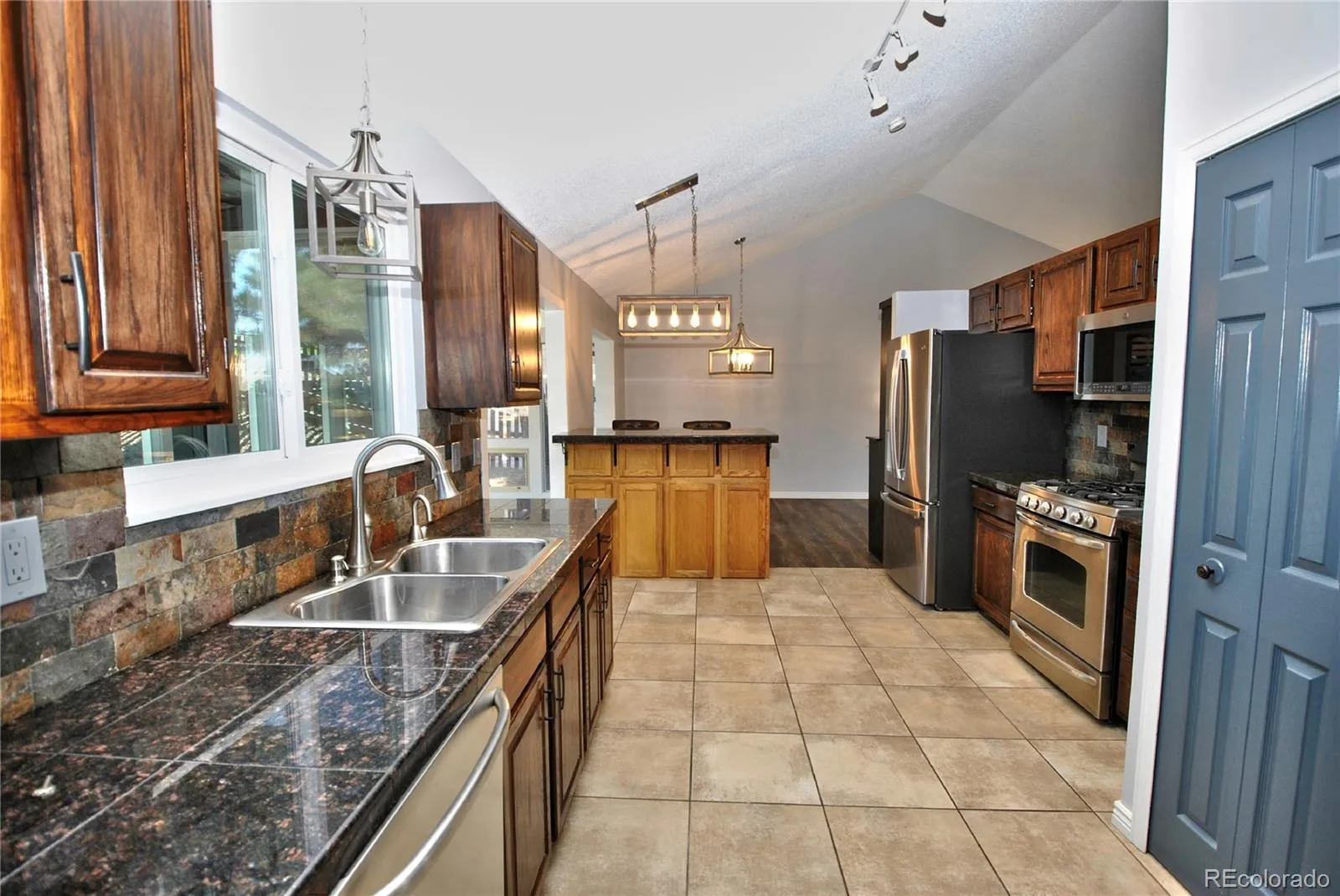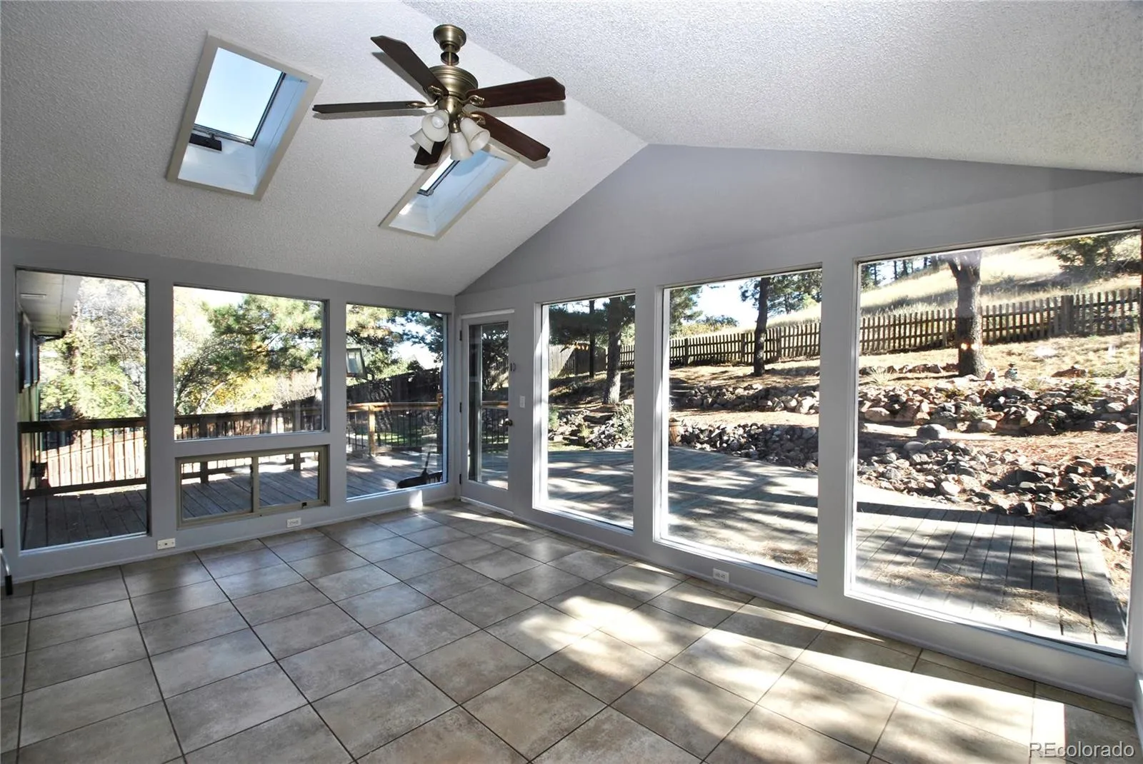 BEAUTIFUL UPDATES!! And remodeling in this raised ranch home that backs to Rockrimmon Open Space. Beautiful zeroscaping with huge wrap around rear deck accented by pine trees and scrub oak. Luxury Vinyl floors and designer paint greet you into this vaulted open house. Gorgeous granite kitchen with gourmet gas stove, Stainless Steel appliances, instant hot water faucet and pullout cabinets. Dining room with built-in Custom bar with beverage refrigerator included. Bright open sunroom walks out of kitchen area and through to the deck and Mountain Views. All tiled baths plus a master suite with full wall of closers. Enjoy the wood brick fireplace in the lower family room with TV included. Brand New Roof, Gutters, exterior paint and driveway, extended oversized 2 car garage, 50 gallon water heater New garage door opener and tons of garage storage shelving. District 20 Schools and easy access to Air Force Academy and I-25.