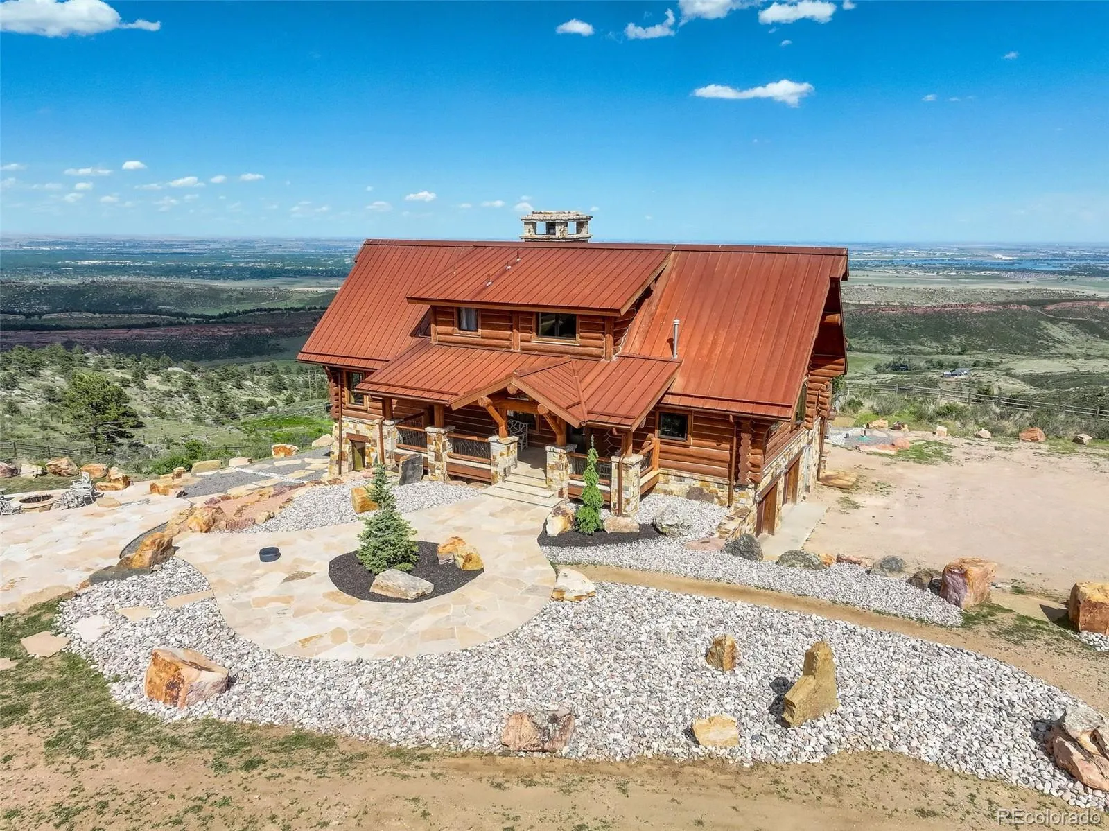 One-of-a-kind, exceptional equestrian estate spanning over 38 acres with 360-degree views. Luxurious indoor/outdoor living at its finest, this estate combines mountain log home grandeur with the refined elegance of top-quality finishes. Utmost exclusion & privacy lie here behind the gates of this exclusive community. Upon entering the property, you will be WOW’d by views framed by the accordion doors creating walls of glass that make up the entire east side of the home. The kitchen has been outfitted with premium appliances, including Subzero, Meile & AGA. Eye-catching copper & reclaimed wood countertops on the large center prep island make up this opulent space. Seamless flow to the great room highlighted by soaring, beamed ceilings. The main level primary suite boasts unbeatable views to Horsetooth Reservoir, deck access, & loft. Sumptuous copper soaking tub in the luxe 5-piece bath which also features a rain shower. The walk out lower level makes for another great entertaining space with wet bar & two secondary bedrooms with outdoor access. The equestrian facilities are state of the art and offer a heated, 2 stall barn with auto water, & comfort mats. 4 fenced horse pastures on the property. Full-size dressage riding arena with round pen & plenty of warm up space. You will love the outdoor entertaining space in this breathtaking setting that has every amenity imaginable: a huge, well-appointed kitchen with Viking appliances, wood pizza oven, wood fire pit, lighting & sound system. The city lights below provide a priceless backdrop for sophisticated entertaining & stylish living.