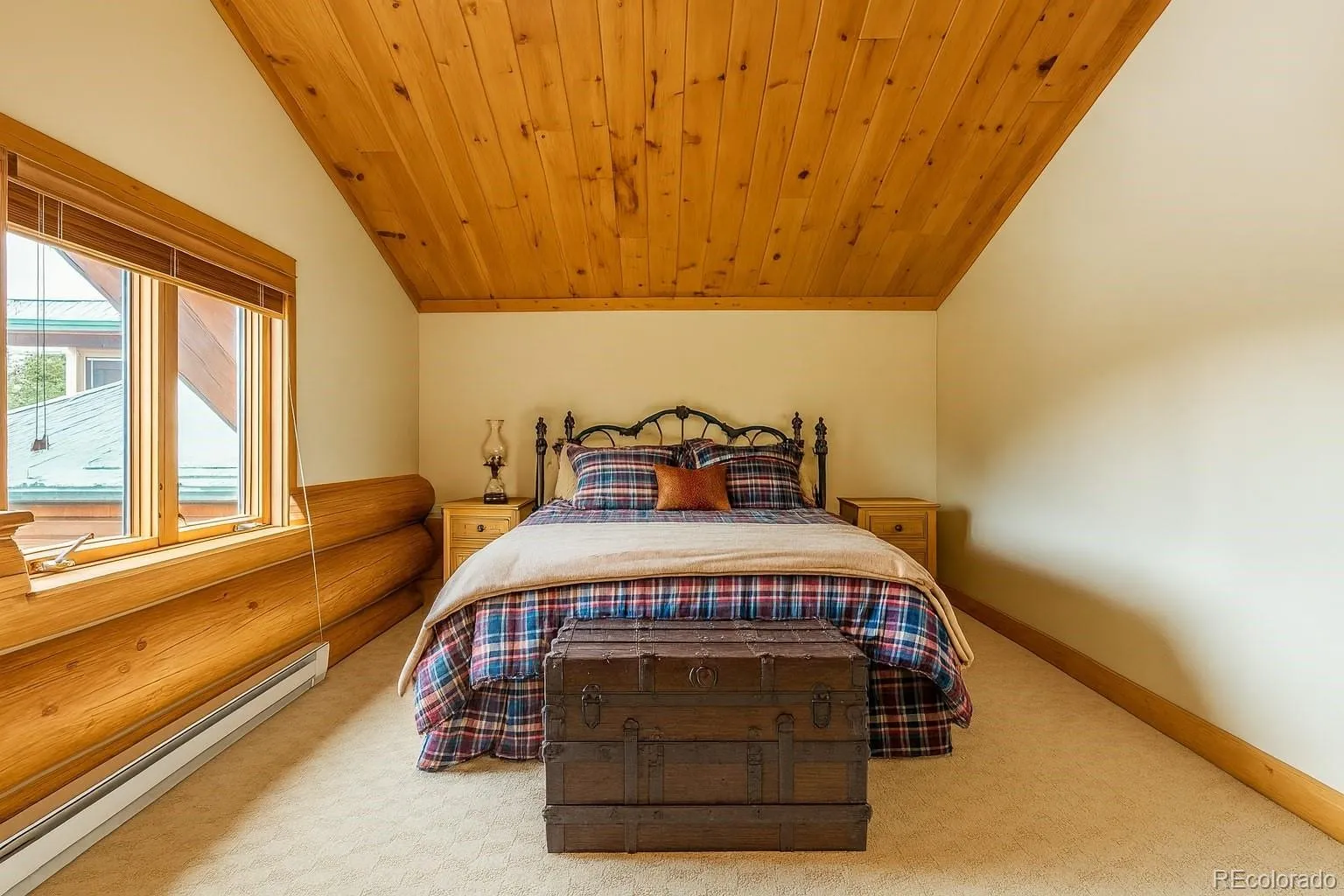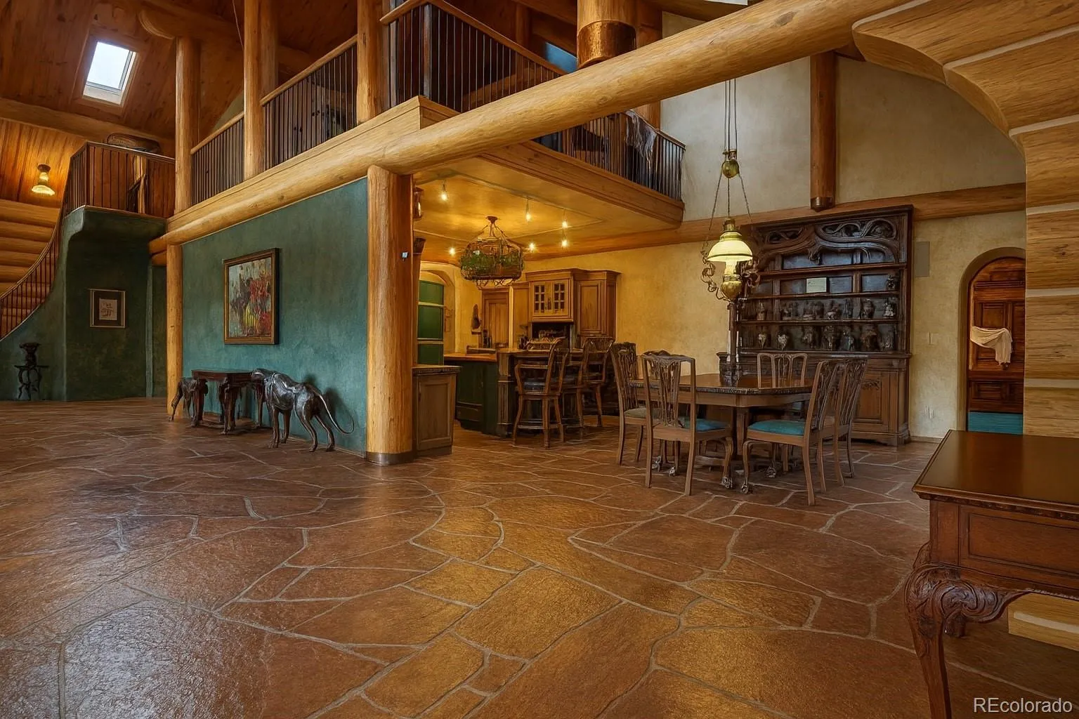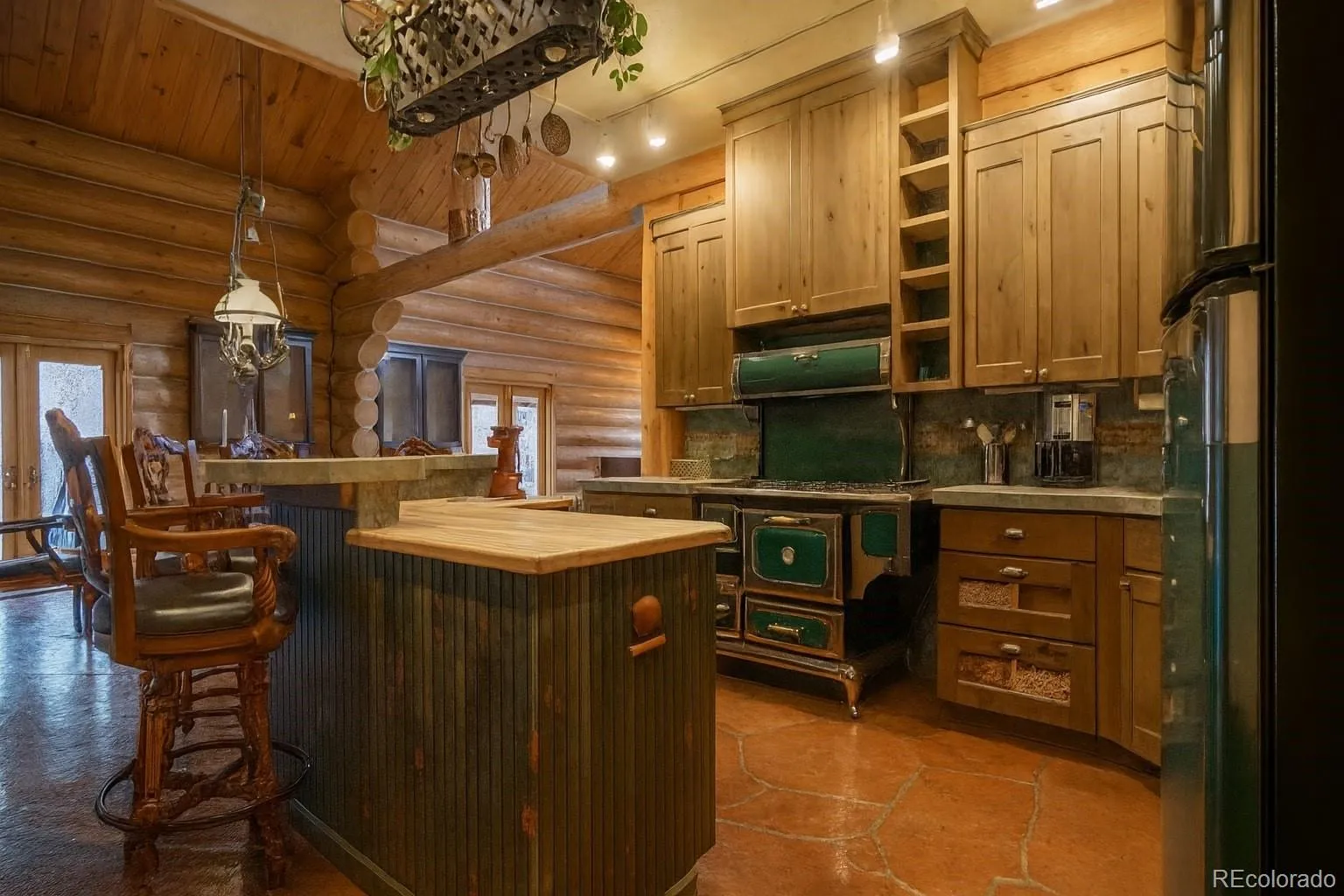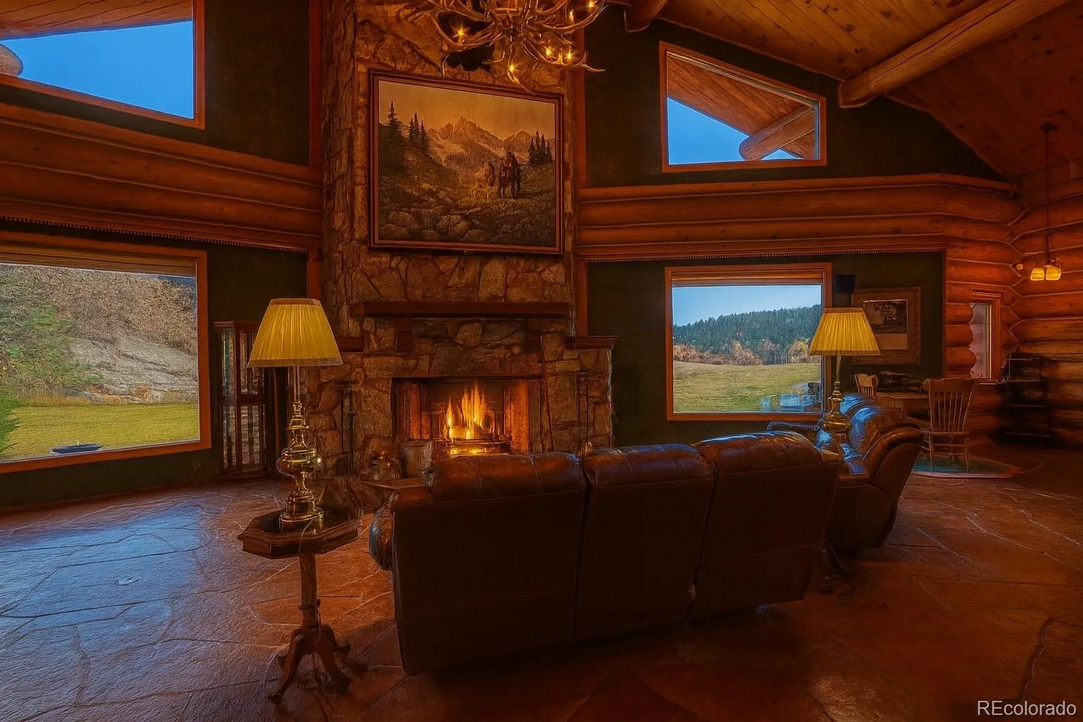The heart of the home is the magnificent great room featuring a massive stone wood-burning fireplace, an antler chandelier, stone floors, and T&G ceilings. The gourmet kitchen boasts custom tile & butcherblock countertops, a Heartland refrigerator & stove, & an antique breakfast bar. Throughout the home, T&G ceilings, log vigas and in-floor radiant heat create a cozy yet sophisticated ambiance, complemented by antique furnishings in select rooms and striking rock outcroppings visible on the property.