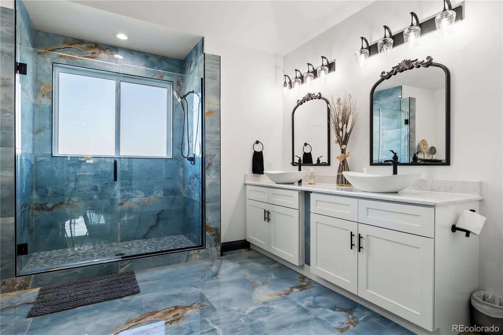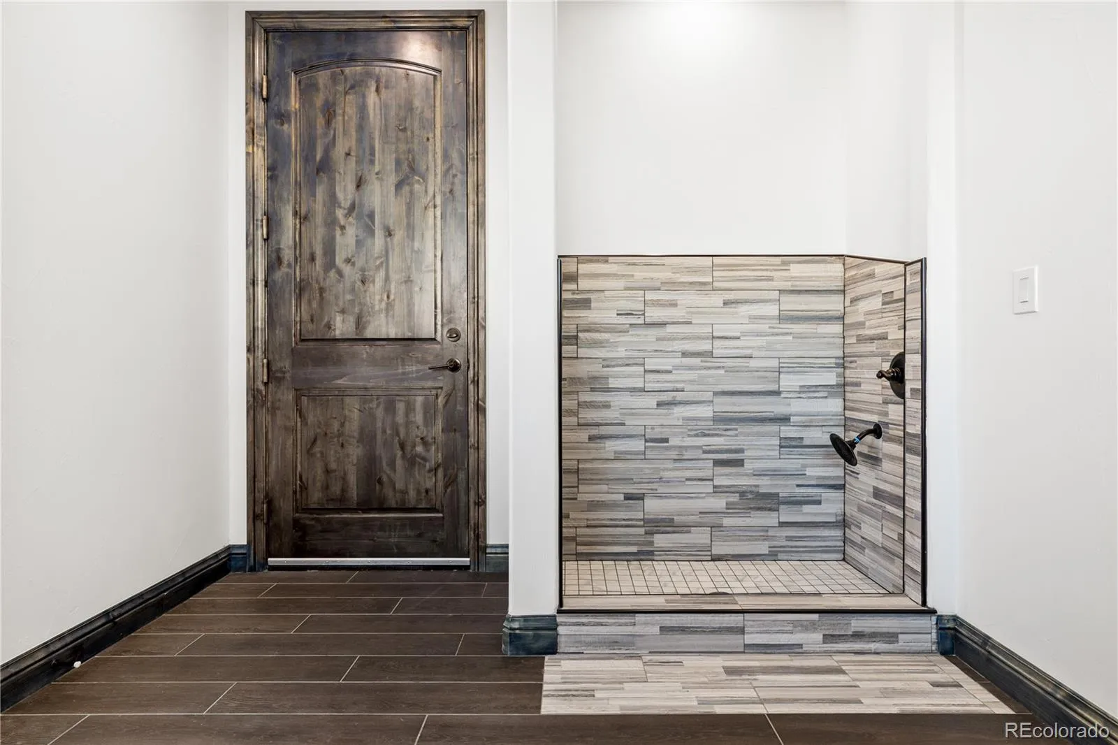 The main level showcases an exquisite primary suite with his-and-hers closets, a serene hot tub, and an oversized walk-in shower. Two additional bedrooms, each with their own private ensuite and walk-in closet. A spacious main-level laundry room with a built-in dog shower adds thoughtful convenience to daily life.