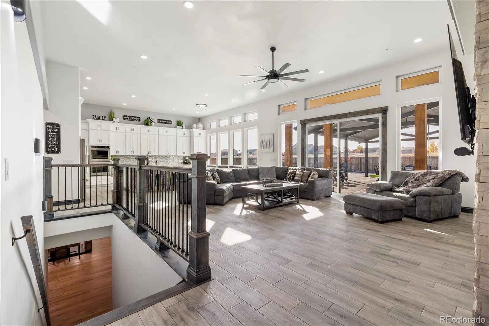 Bathed in natural light, the open-concept living area is framed by large windows that highlight the surrounding landscape. A grand fireplace creates a striking focal point in the living room, setting the tone for cozy gatherings and relaxed sophistication.