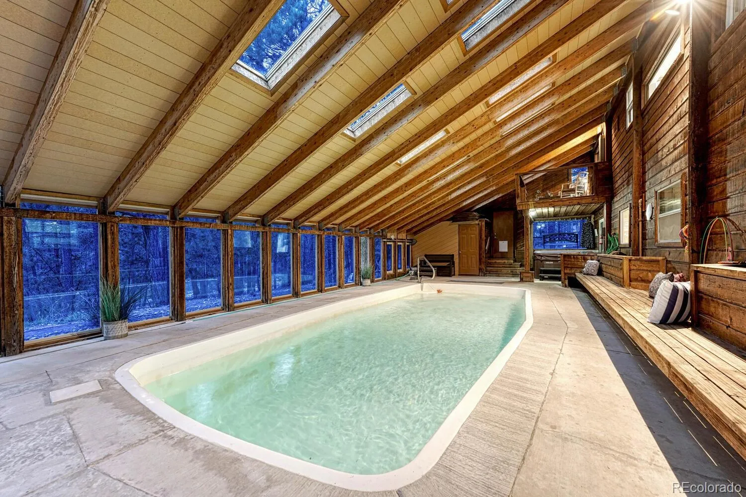 Amazing private sanctuary w/ 3BRs & 4BAs tucked away at the end of a peaceful cul-de-sac in the highly sought-after Pleasant View Estates. Set on a tree filled, 0.64-acre lot, this exceptional home blends tranquility & amenities, offering the perfect balance of comfort & outdoor living. Inside, you’ll find a spacious retreat w/ 2587sf of well-designed living space for year-round enjoyment. The Liv Rm has neutral carpet & offers a wood-burning fireplace w/ brick surround to cozy up on chilly nights. The Fam Rm, Din Rm, stairs, & upper hallway feature wood floors. The Din Rm has access to the Kitchen & a slider to an interior balcony overlooking the indoor swimming pool. Whether you’re relaxing in the indoor heated pool or soaking in the new hot tub, this home invites you to unwind in style. The beautifully updated Kitchen offers a tile floor, planning desk, abundant cabinets w/ granite countertops, & quality stainless steel appliances. Convenient Powder Bathroom for guests. The Primary BR is a private retreat w/ neutral carpet, a slider to a private balcony, a walk in closet, & adjoining updated Full Bathroom w/ vanity, mirror, & tub/shower. 2 more UL BRs share a Full Bathroom. The versatile Walk-Out Basement incl a flexible space ideal for a 2nd Family Rm, Gym, or Rec Rm w/ walk out to the pool & hot tub. A Murphy bed w/ built-in shelves & Shower Bathroom provide privacy for family or overnight guests. A large brick patio provides glorious views of the surrounding woods, creating a serene backdrop for morning coffee or evening gatherings. 2-car attached heated garage w/ built-in storage. For the outdoor enthusiast, Fox Run Regional Park is just 3 min away w/ nature trails, a playground, picnic areas, & ball courts. Golfers will appreciate the proximity to the prestigious Flying Horse Golf Club. Families will love the Discovery Canyon Campus, offering top-tier IB education from PreK-12th grade. Don’t miss the opportunity to make this mountain beauty your new home!