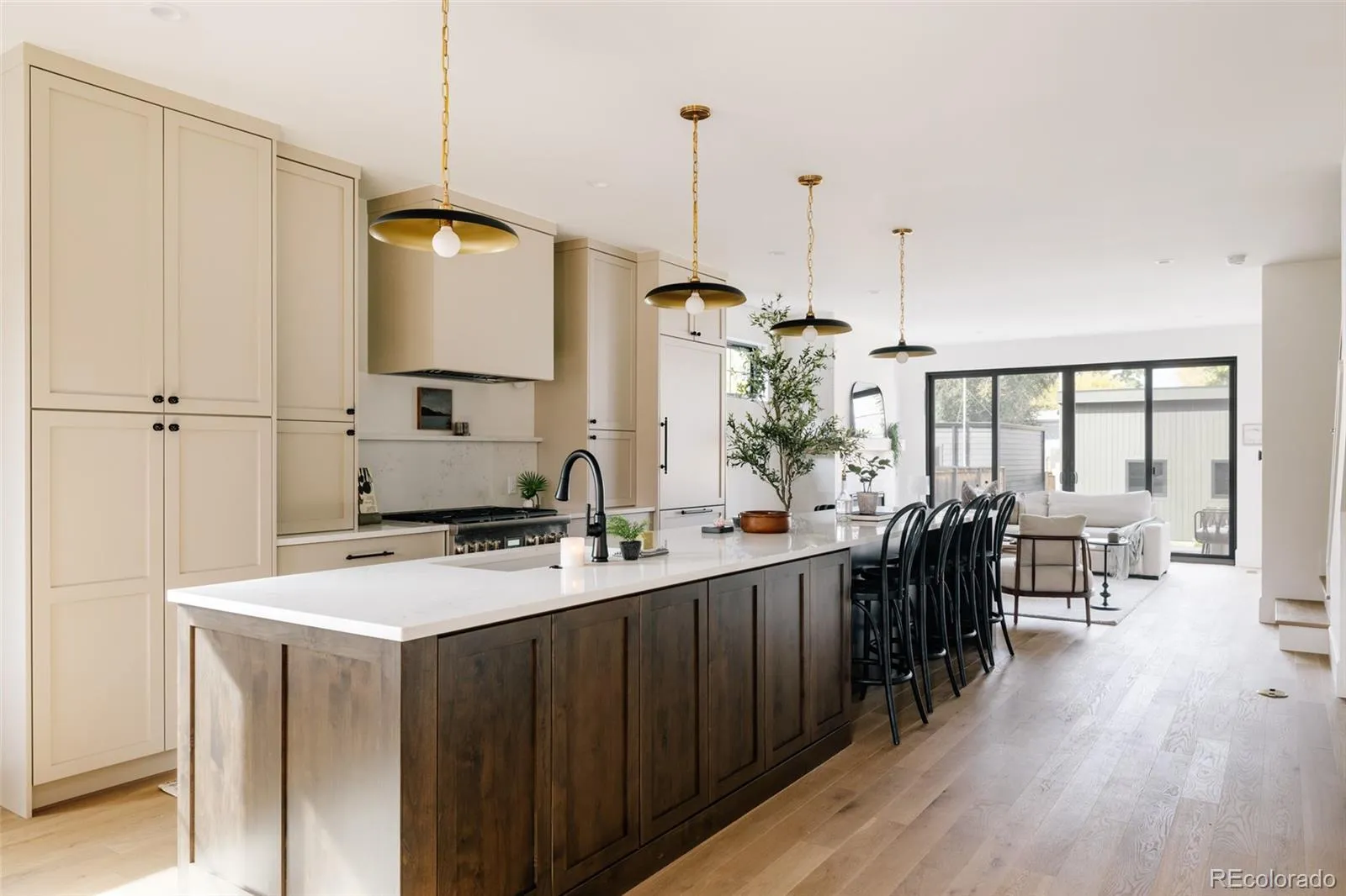 Distinctive design, refined craftsmanship, and exceptional attention to detail define this newly completed residence in the heart of Sunnyside. Five years in the making, this custom home showcases a one-of-a-kind floor plan designed for the way people live today. The extraordinary chef’s kitchen features paneled Thermador appliances and bespoke Tharp cabinetry, setting the stage for memorable meals and culinary creativity. The adjacent dining room provides an elegant setting for gatherings large or small, while the comfortable living room seamlessly connects to the expansive backyard through custom glass double sliders—perfect for enjoying Colorado’s beautiful days and evenings from the covered patio. A thoughtfully designed mudroom keeps everyday gear neatly organized and out of sight. Upstairs, you’ll find three generous bedrooms and two beautifully finished bathrooms, including a serene primary suite with vaulted ceiling, private balcony, large walk-in closet, and a spa-like five-piece bath. The third level offers a flexible retreat ideal for a home office, gym, media room, or art studio—complete with a dry bar, private bath, and peaceful rooftop patio for fresh air and inspiration. The full basement adds even more living space, with a cozy media area ideal for movie nights or game-day celebrations, along with a stylish guest suite that ensures comfort and privacy for visitors. A two-car garage with a custom storage loft provides additional functionality rarely found in the city. Located just blocks from Sunnyside’s premier dining and shopping destinations, this home also offers effortless access to LoHi, I-25, I-70, and downtown Denver—placing all of Colorado’s best experiences within easy reach. A one-year builder warranty offers added peace of mind. The Quivas Block represents a curated collection of 8 custom homes, designed by 3 different architects under the unified direction of Qualitas Homes. This is contemporary Denver living at its finest. Welcome home.