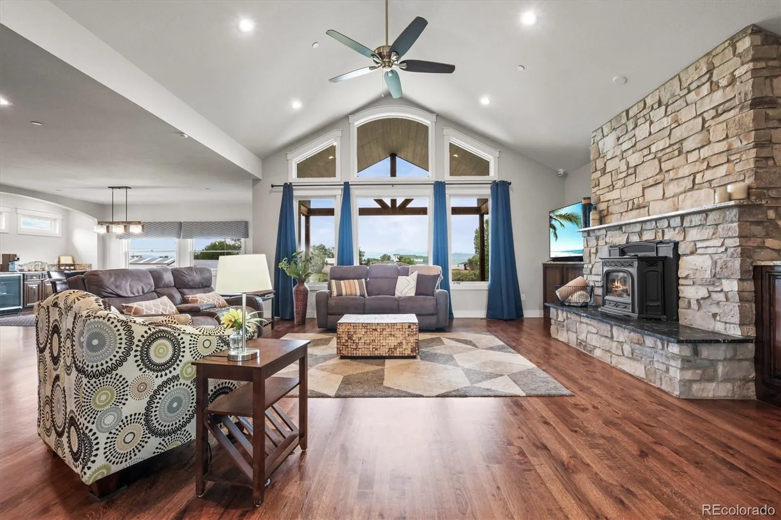 Experience the perfect blend of modern luxury and country living with 2 exceptional properties on County Road 32 in Platteville. Together, they offer over 8,500 sq ft of living space, sweeping mountain views of Longs Peak, freedom of 3.2 acres of serene Colorado countryside, 3 car garage, 4 car garage, and huge outbuilding, minutes from the conveniences of town. 6331 County Road 32 is a custom ranch home with comfort, craftsmanship, and lifestyle. The inviting great room flows seamlessly into a gourmet kitchen featuring Viking appliances, pot filler, large island, wet bar, cup washer, butler’s pantry with sink, dishwasher, dining area. The primary suite private retreat features a with a spa-inspired 5-piece bath, walk-in closet, laundry area. Enjoy mountain sunsets from the covered back porch with hot tub. The finished basement was created for fun and fitness with a recreation room, climbing wall adventure room, 2nd laundry, exercise room, safe room, direct access to the heated 3 car garage. 3 additional bedrooms, 2 bathrooms, an upstairs loft. A heated outbuilding (68’ x 42’) with three 14’ garage doors, one 10’ door, 15½’ ceiling height (17’ at the peak), 50-amp RV plugs on both sides – store vehicles, equipment, a semi-truck can drive through and turn around with ease.