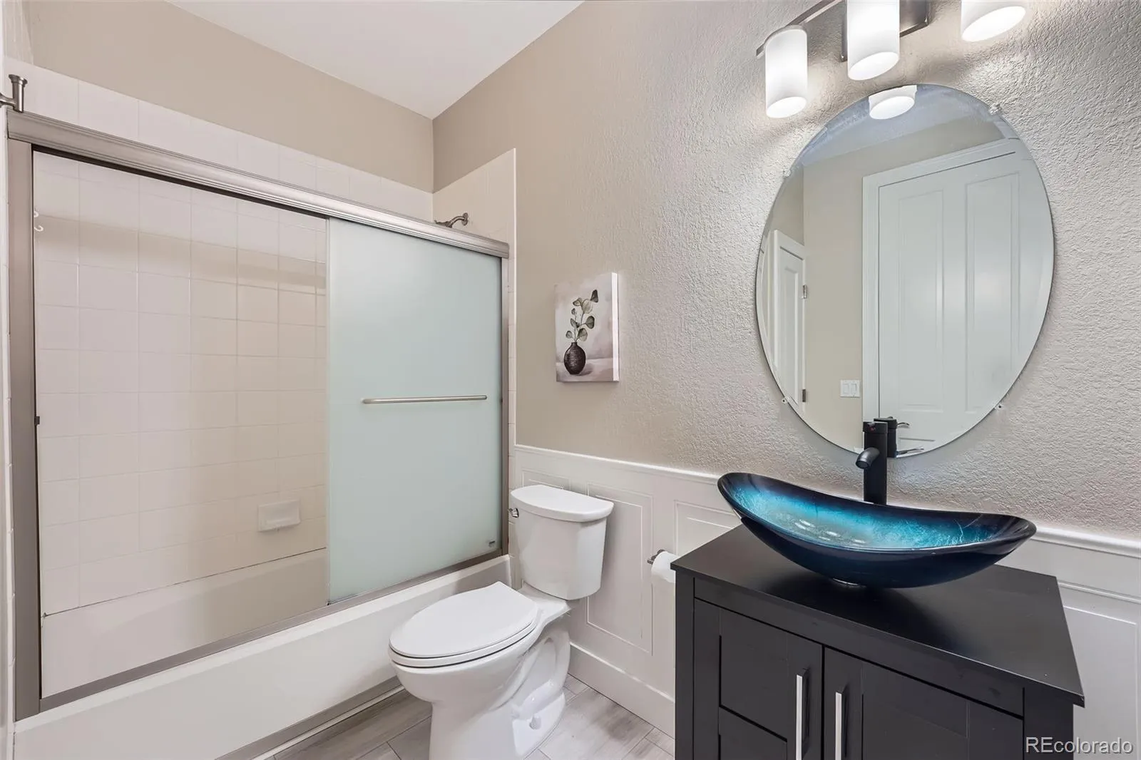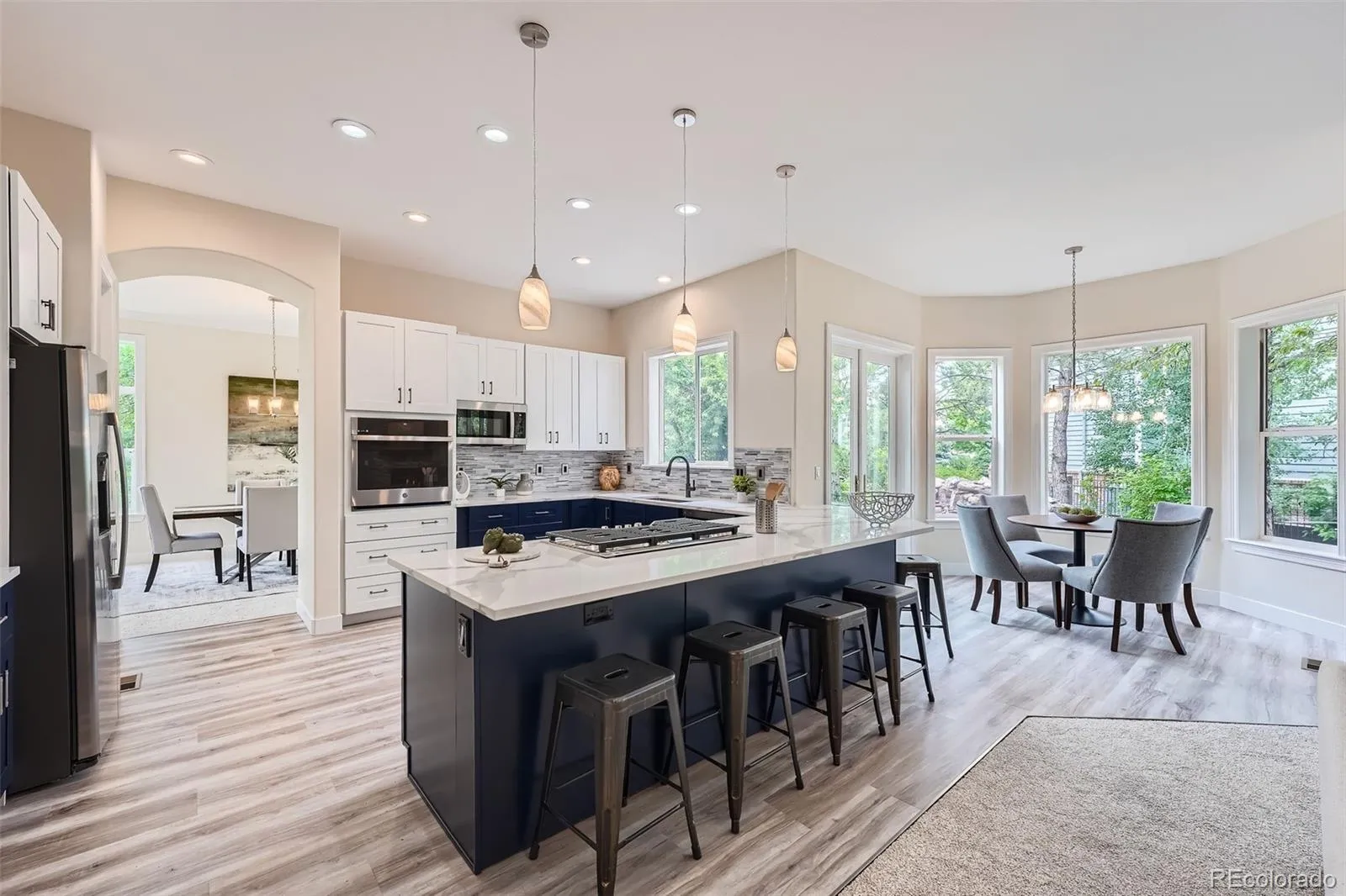 This stunning remodeled 6-bedroom, 4-bathroom home is move in ready and nestled in the desirable Saddle Rock North community. Featuring over 6,100 sq ft of beautifully updated living space. The fully renovated kitchen is a chef’s dream—with sleek new countertops, high-end appliances, custom cabinetry, and striking custom lighting. The adjoining family room has been tastefully remodeled and flows seamlessly into the kitchen, creating the perfect space for entertaining. The main level also offers a formal dining room, large living room, a stylish office, and a main level bedroom (or second office), along with a full updated bathroom. The laundry/mud room has been beautifully updated and provides convenient access from the oversized garage with ample storage. Upstairs, retreat to the luxurious primary suite complete with a cozy gas fireplace and a private bonus room overlooking the main floor. The stunning five-piece en-suite primary bathroom showcases elegant tilework, dual vanities, a soaking tub, and a large walk-in closet. Two additional spacious bedrooms share an remodeled Jack and Jill full bathroom with brand new tile floors, fresh paint, lighting and counters. The finished basement is designed for entertaining with a large rec room and a brand new custom built-in bar. Two more bedrooms, a ¾ bath, a bonus room and ample storage complete the basement lower level. Outside, enjoy a professionally landscaped backyard with a brand new custom concrete patio. Located in the award-winning Cherry Creek School District, this home also includes access to fantastic community amenities such as a pool and clubhouse.