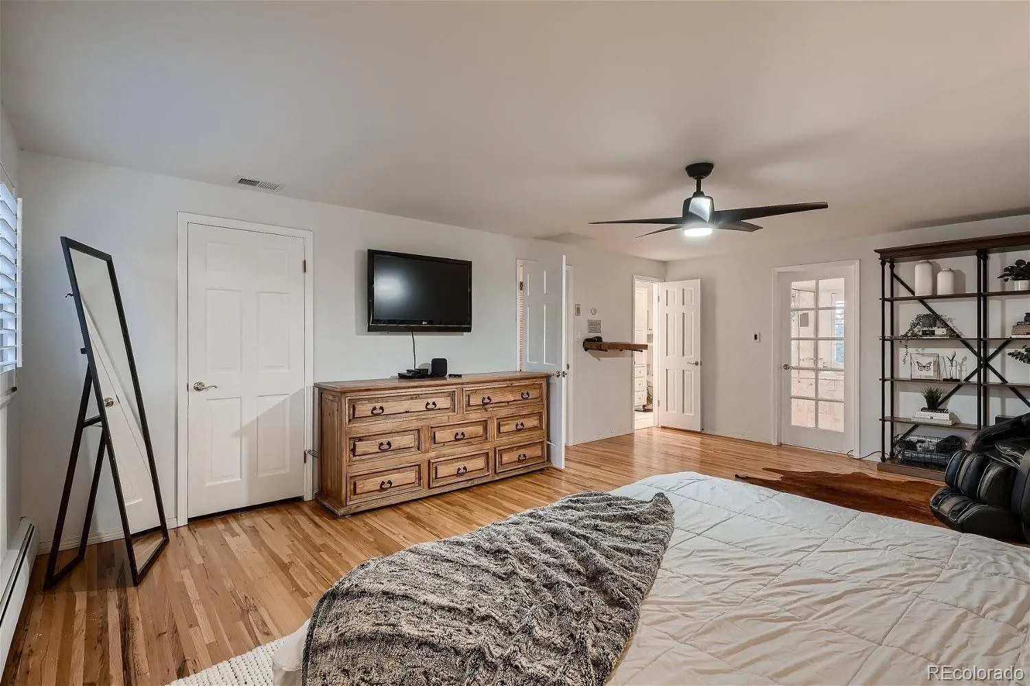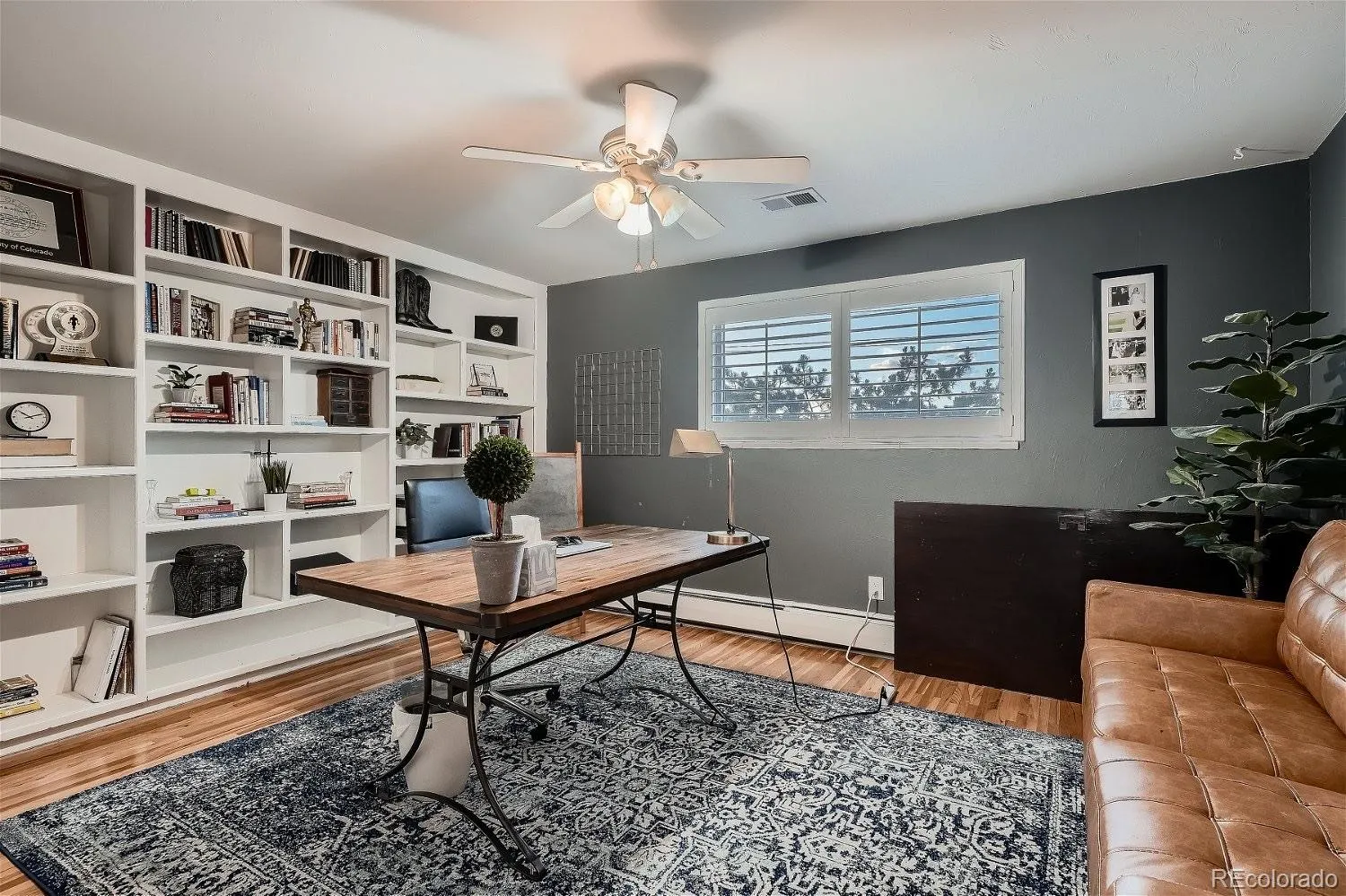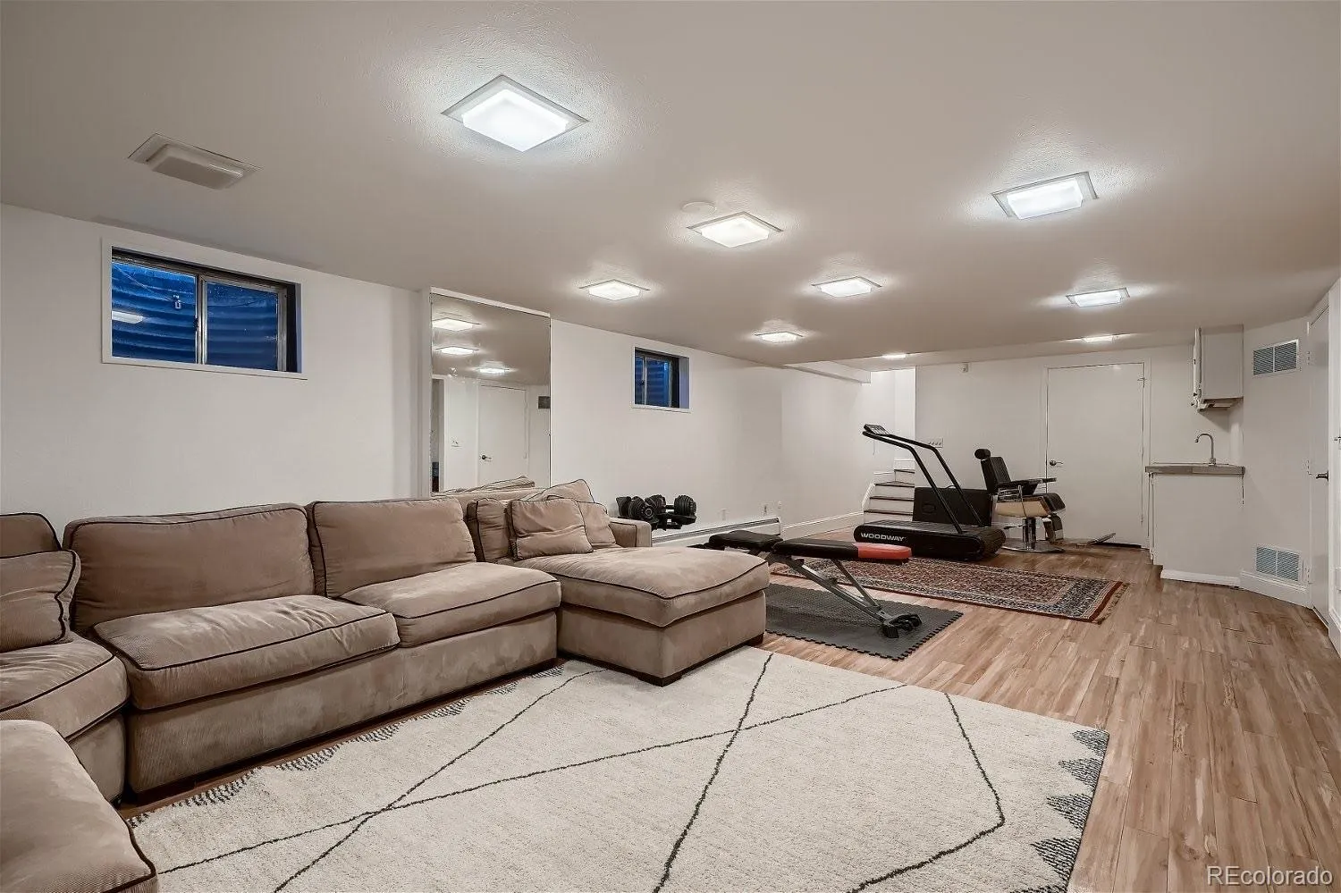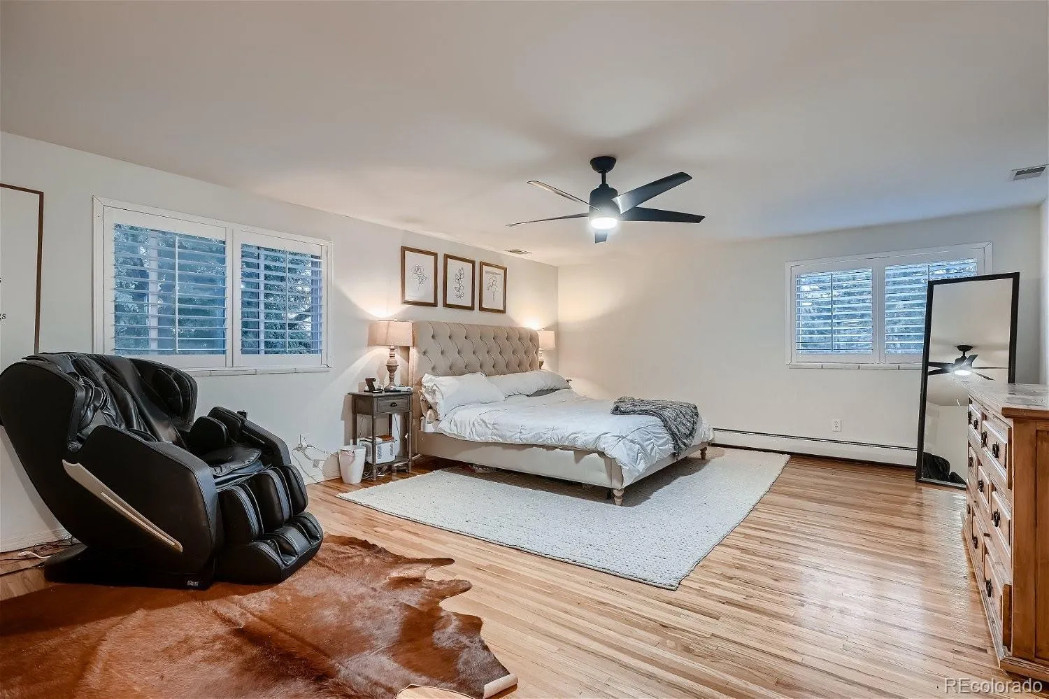 Upstairs are four bedrooms, including a spacious primary suite with a massive walk-in closet, laundry nearby, and a private balcony with mountain views. The finished basement offers nearly 1,200 square feet with a recreation room, nonconforming bedroom, en suite closet, full kitchen, wet bar, and a three-quarter bath. Outside, the south-facing yard is large and beautifully maintained with multiple garden beds and mature trees throughout the neighborhood. Additional features include beautiful wood floors, a whole-house attic fan, and a motor home pad with electrical hookup. No HOA. Convenient to light rail, Whole Foods, and DTC.