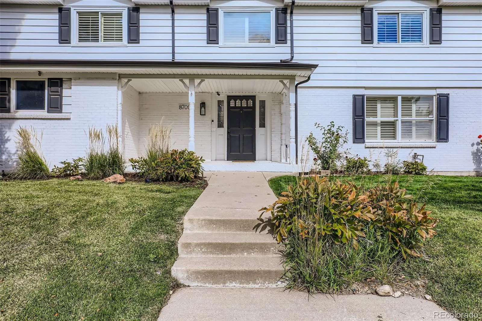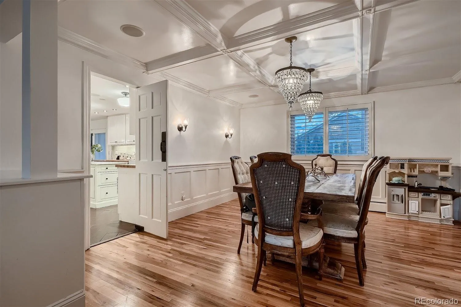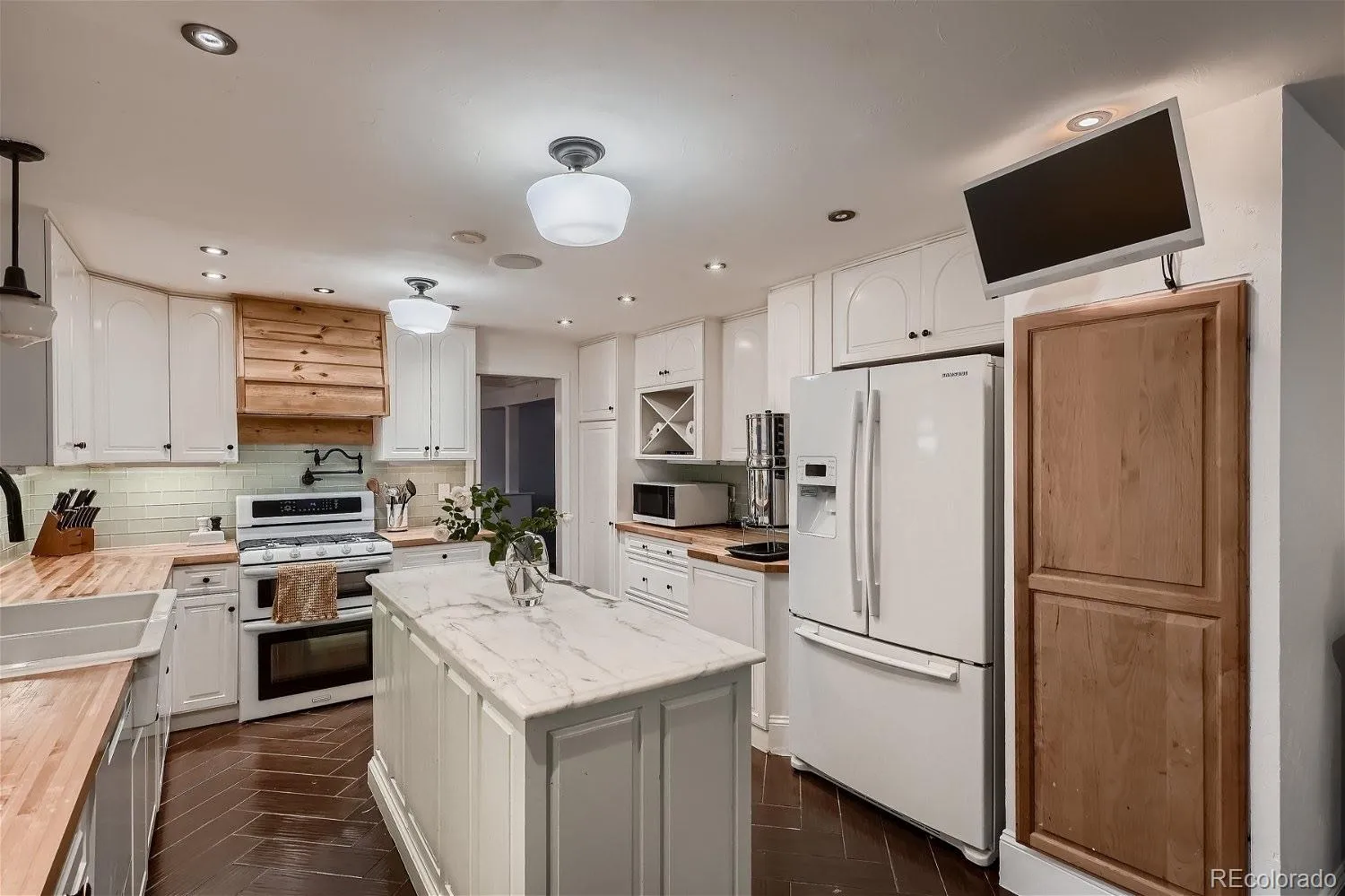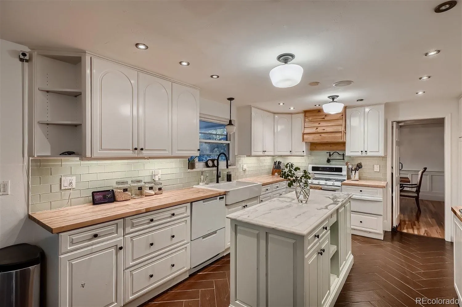 Located in Denver’s Hutchinson Hills neighborhood, this two-story home has been updated throughout. The main level includes a welcoming entry, living room, and formal dining room with wainscoting and box beam ceiling. The kitchen features white cabinetry, glass tile backsplash, farmhouse sink, marble and butcher block counters, and connects easily to both the dining and family room.