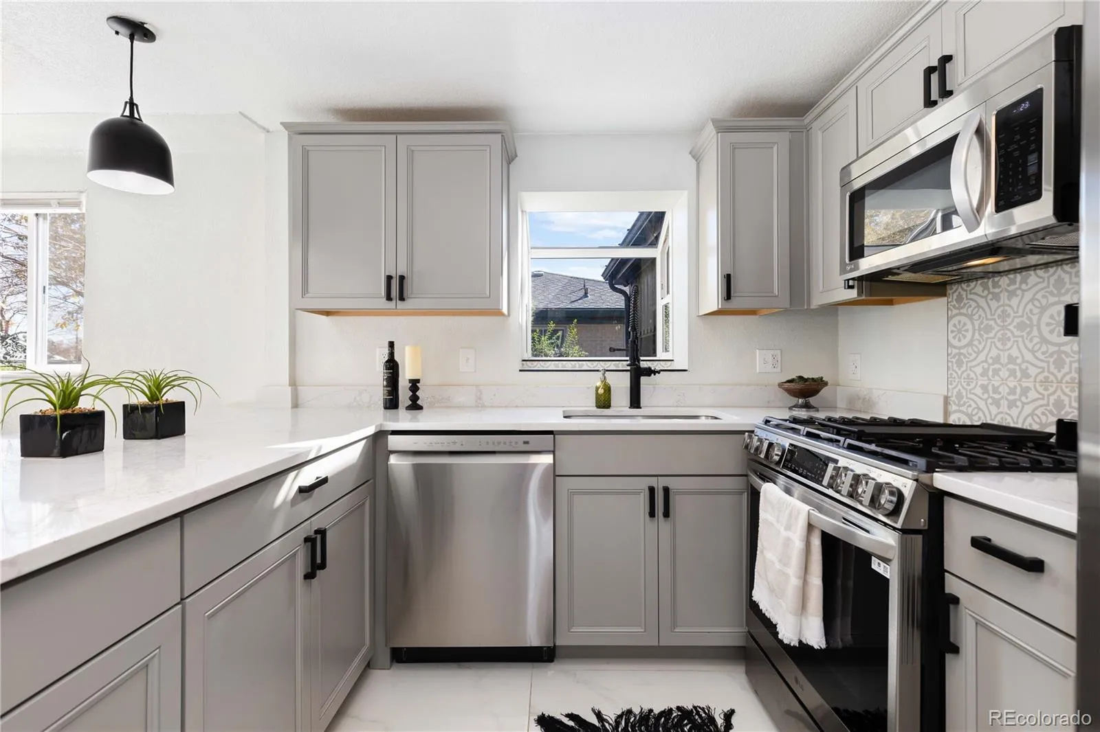 The remodeled kitchen is a showstopper with sleek quartz countertops, stainless steel appliances, a breakfast bar, and modern tile floors that pull the space together. Every detail feels intentional, from the clean lines to the cohesive, modern design.