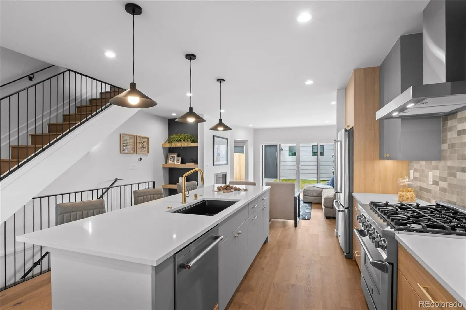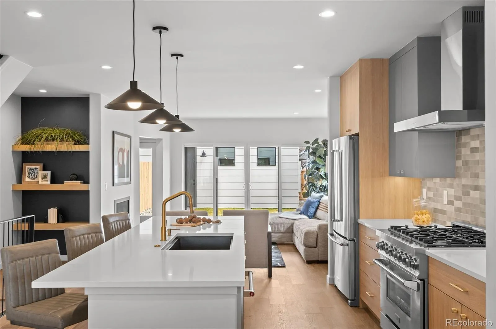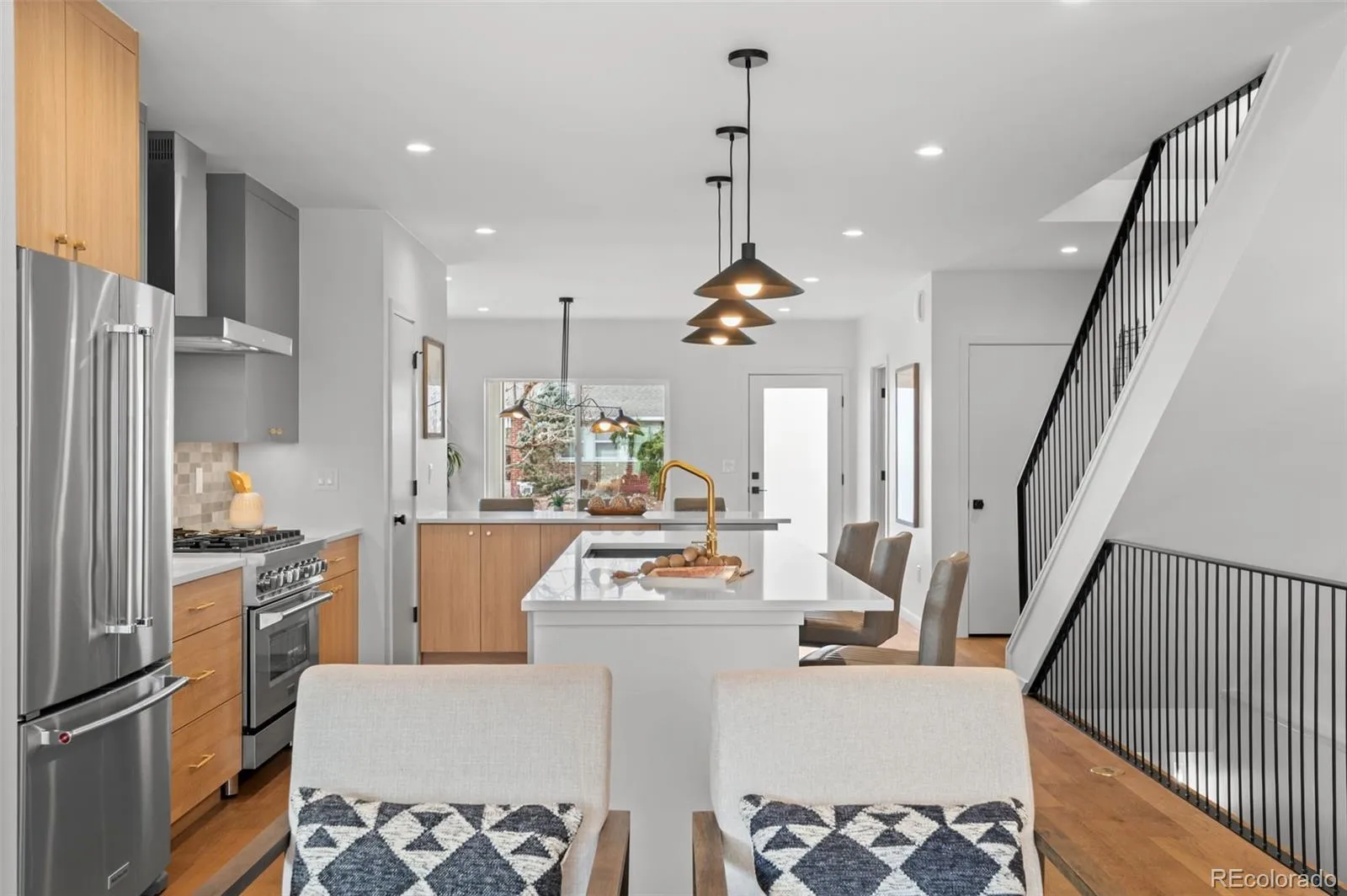 showstopper, with a large center island, pull-up seating, sleek quartz countertops, and high-end stainless steel appliances,