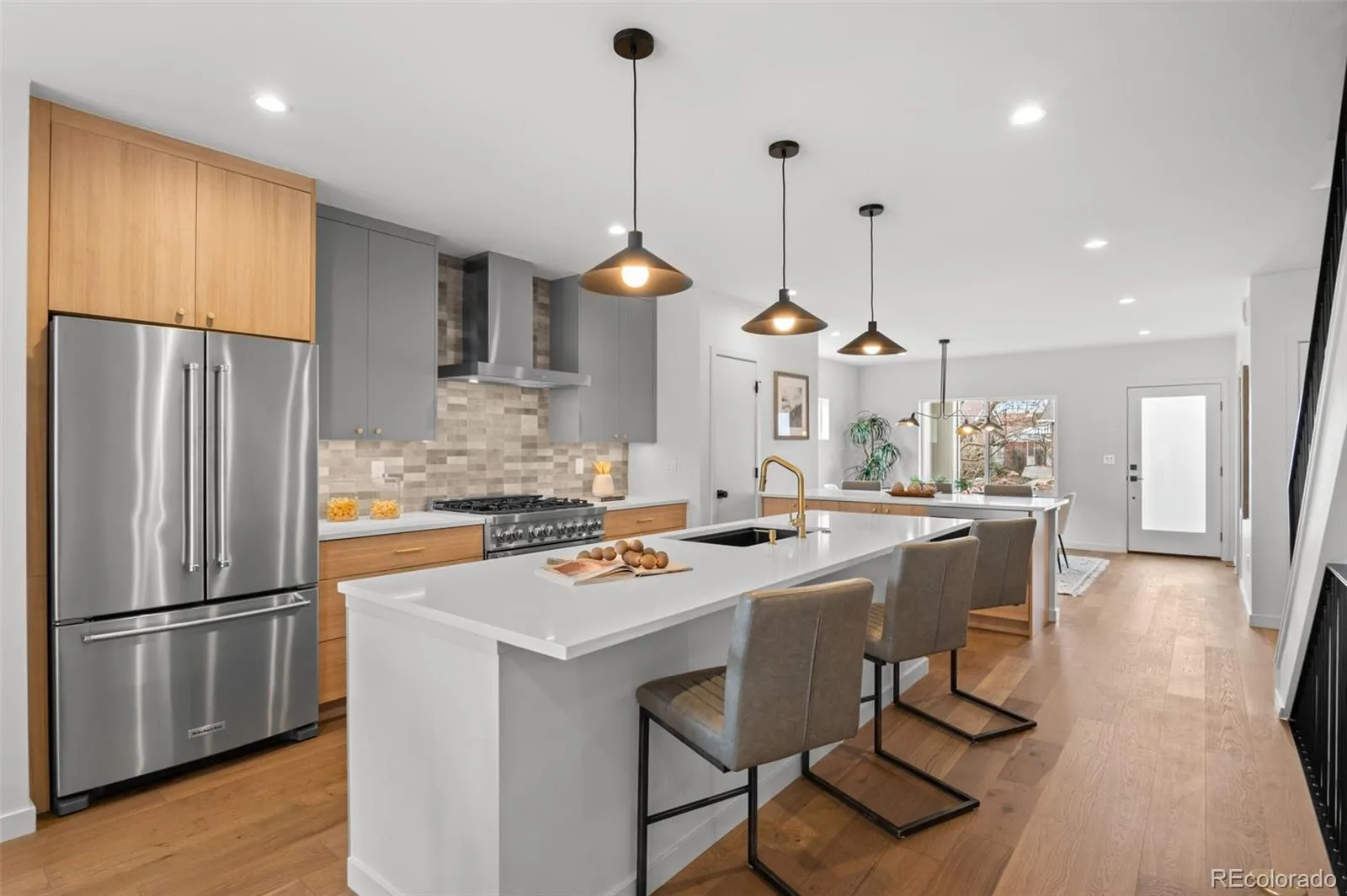 plank oak wood flooring throughout the main floor, complementing the open-concept design. The chef’s kitchen is a