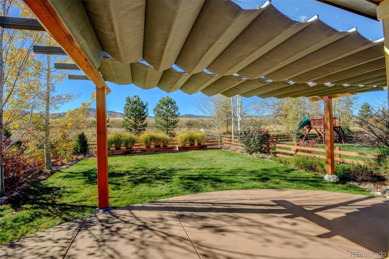 Step outside to an entertainer’s dream backyard and outdoor oasis—fully fenced and beautifully landscaped with mature aspens and raised garden beds. Relax under the heavy timber pergola with a retractable Infinity Canopy, perfect for unwinding or hosting gatherings. Enjoying sweeping views and unbeatable mountain sunsets.