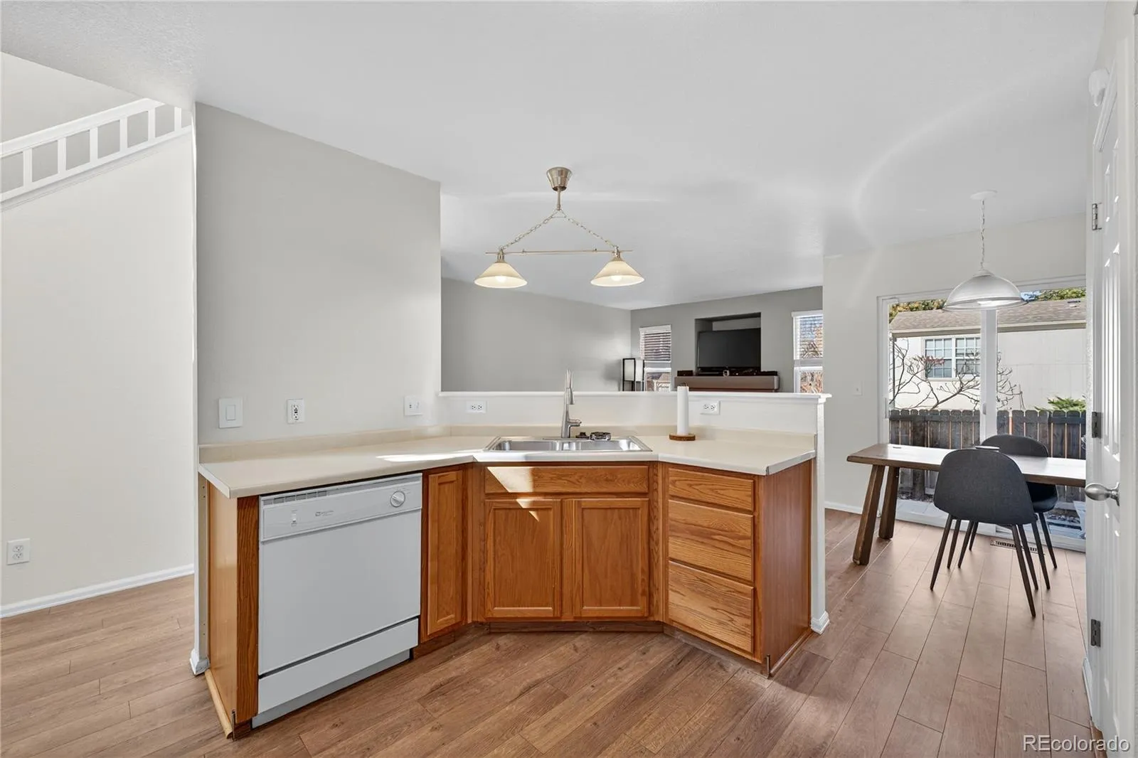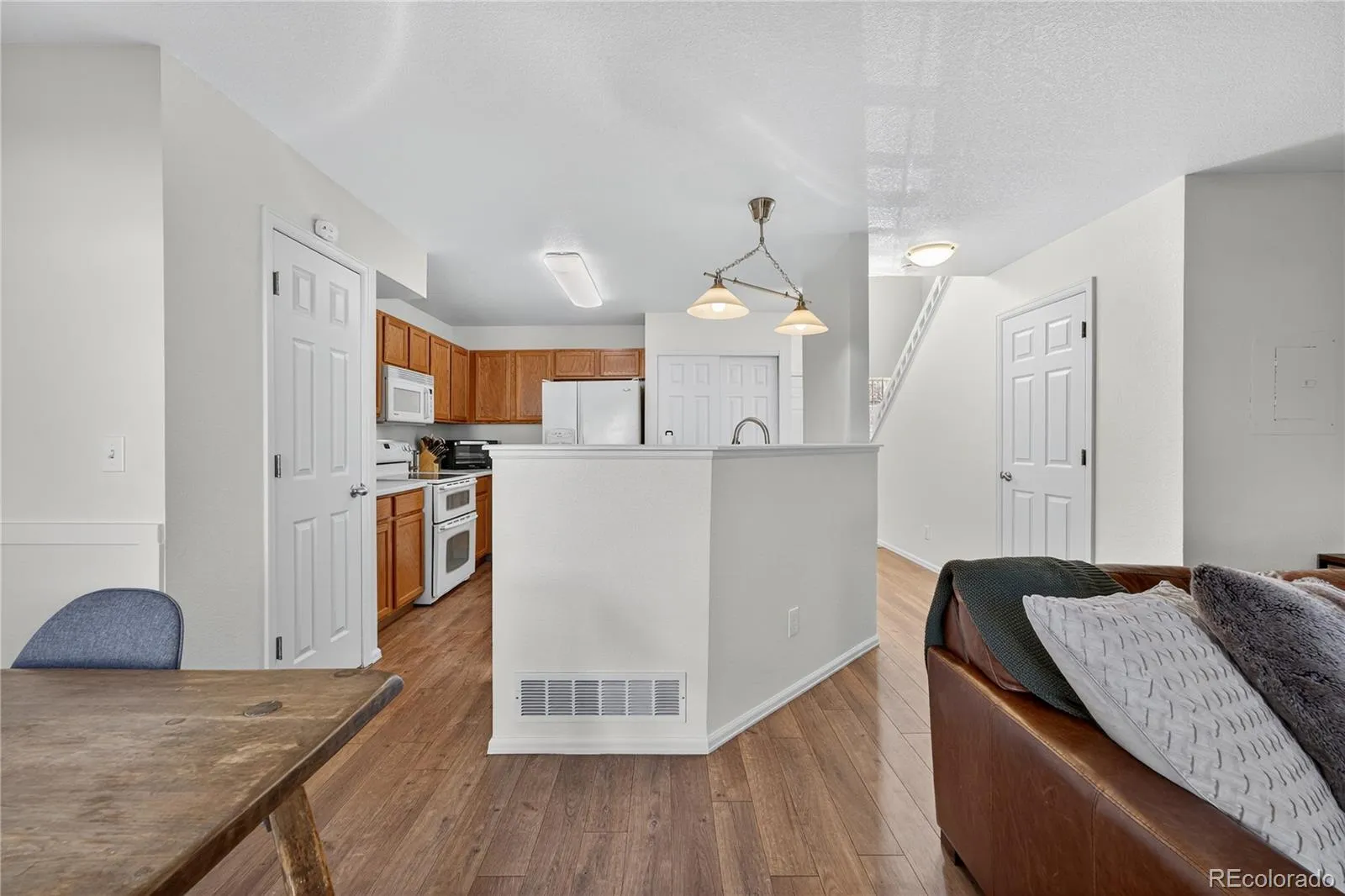 Charming, turn-key, 2-story, 2-bedroom townhome in the quiet Quail Run community. Enjoy a private fenced patio and yard that backs to open space and a peaceful greenbelt, with Highland Hollows Park just a block away. An inviting front porch welcomes you into a bright, open layout featuring new durable laminate wood floors. The cozy living room with a fireplace flows seamlessly into the dining area and spacious kitchen, perfect for entertaining or relaxing. The dining area opens to the private backyard with a new patio and artificial grass—ideal for outdoor dining or unwinding. A convenient gate off the patio provides direct access to greenbelt trails throughout the community. The kitchen offers ample countertop space, a pantry, and double ovens. The main level also includes laundry, a half bath, and plenty of storage. Upstairs, two generous bedrooms with new carpeting await, including a primary suite with a walk-in closet. A designated parking spot adds everyday convenience. Fantastic amenities including a pool and tennis courts, and the HOA covers water, trash, exterior maintenance (roof, siding, and gutters), and lawn care. Conveniently located near major highways, Buckley AFB, DIA, and a variety of shops and restaurants, this move-in-ready gem is waiting for you to call it home.