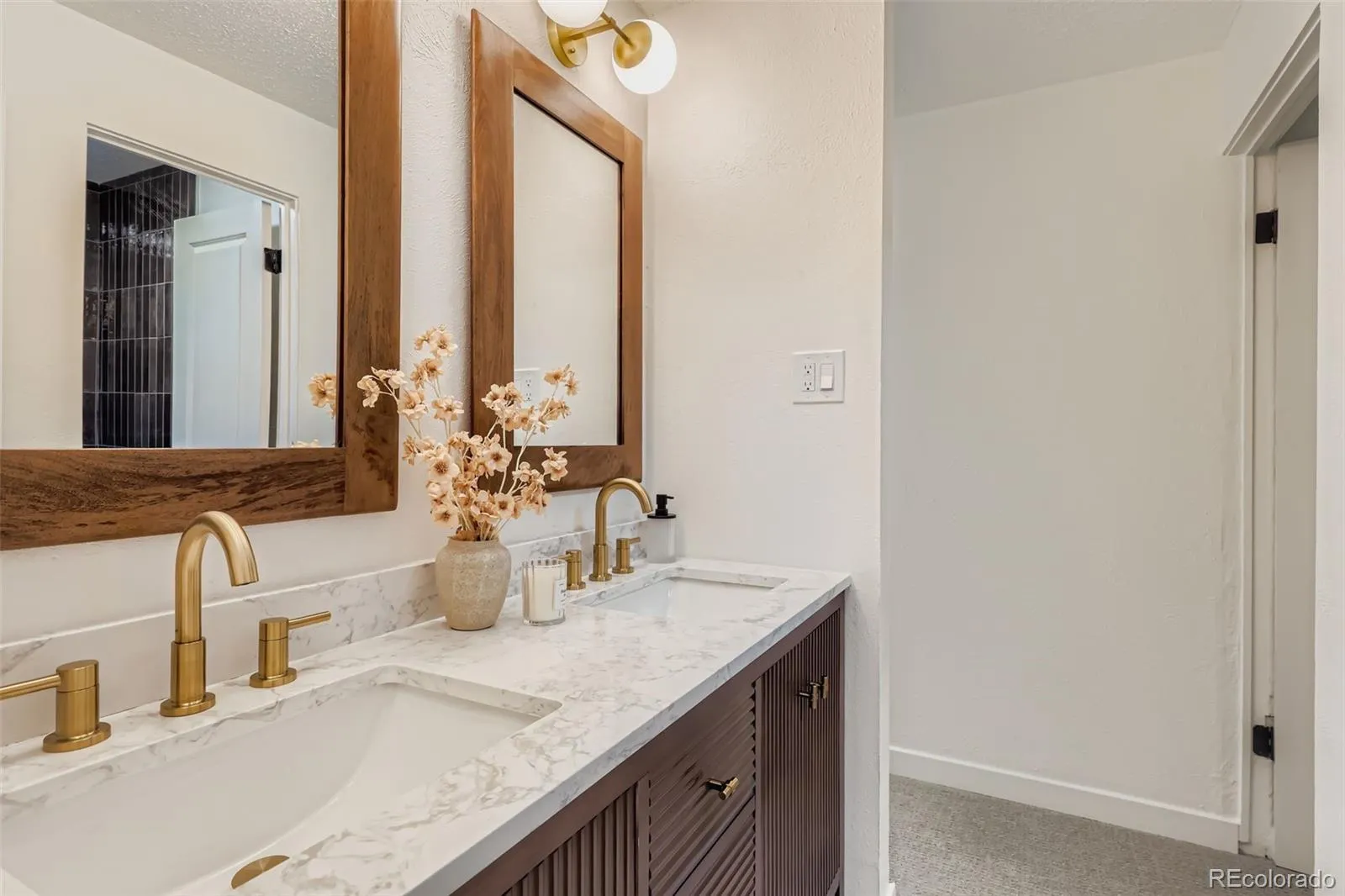The main floor also includes a laundry closet and a tastefully updated half bath. Upstairs, the large primary suite offers a sitting area, walk-in closet, and direct access to a remodeled full bath with new cabinetry, quartz counters, and stylish fixtures.