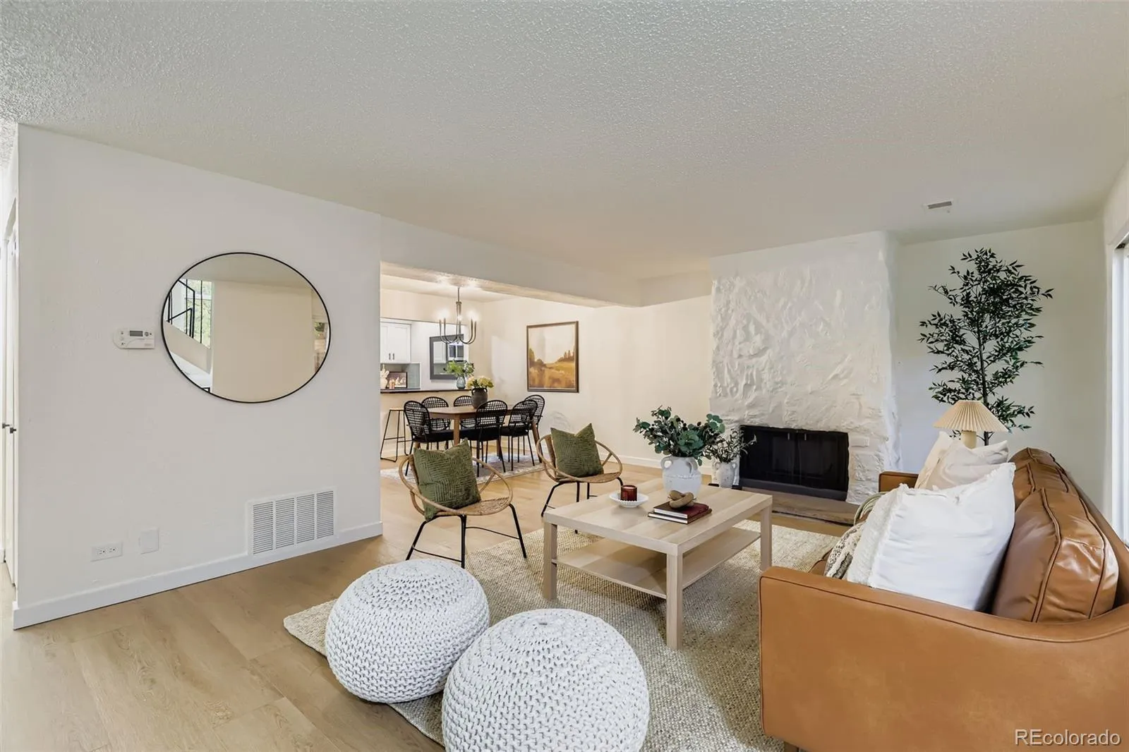 Step into this beautifully refreshed 2-bedroom, 2-bath home featuring two reserved garage spaces. The open layout includes a spacious living room, a generous dining area with a cozy fireplace, and a bright, modern kitchen. The kitchen shines with white cabinetry, quartz counters and stainless steel appliances.