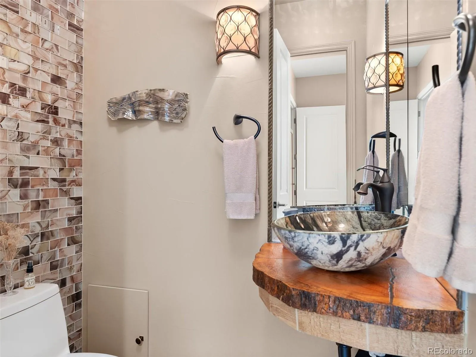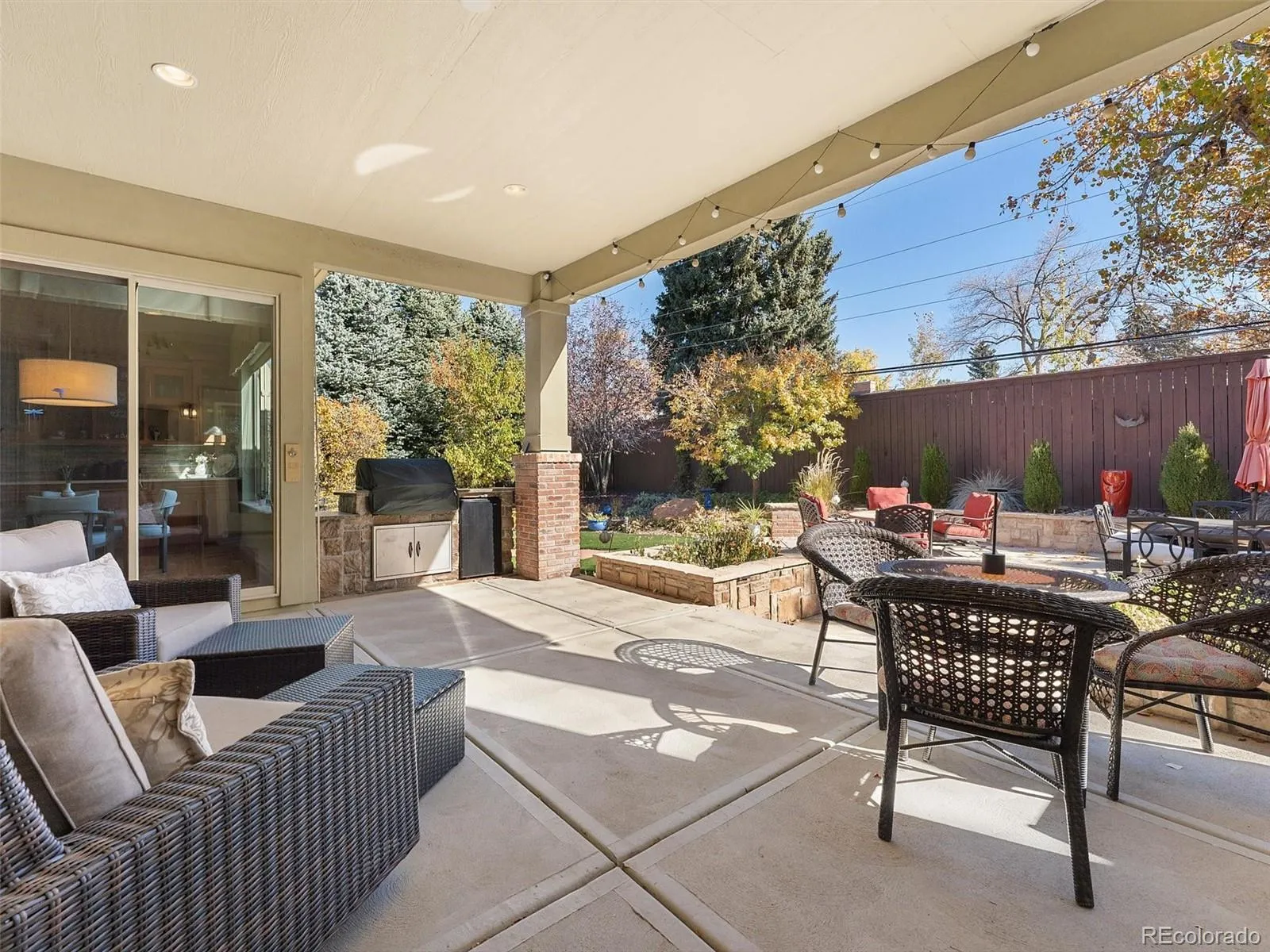 Experience luxury living in this stunning open-concept home with soaring 10-foot ceilings, gleaming hardwood floors, and a cozy fireplace—perfect for relaxing or entertaining. The main floor features a chef’s kitchen with granite countertops, a spacious island, abundant cabinetry, and a breakfast nook overlooking lush gardens. The adjacent bar area includes illuminated cabinetry, a beer fridge, and a wine chiller, ideal for gatherings. The primary suite offers a picturesque yard view, direct patio access, and a spa-inspired ensuite with a huge shower, soaking tub, double vanities, and two custom closets. Additional main floor highlights include a guest bedroom, elegant 3/4 bath, mudroom, laundry, and a unique half bath with a handcrafted Canadian Oak shelf. The expansive, light-filled basement is an entertainer’s dream, boasting a custom-built English pub with a statement bar made from a vintage railroad car side door, a keg, wine closet, and a spacious great room with surround sound and a fireplace. There’s ample space for a large TV, pool table, and game area. Two more bedrooms and a full bath provide comfort for visitors, while decorated egress window wells add style and natural light. Step outside to a private backyard oasis with mature trees, shrubs, a fountain, and perennial flowers for year-round beauty. Green turf ensures visual appeal even in winter. Entertain on the covered patio with a built-in gas grill, TV (included), and extended patio—ideal for parties or intimate dinners. Located in an exclusive gated community, HOA services include front lawn mowing, snow removal from the street all the way to your doorstep. Enjoy nearby High Line Canal trails, shopping, dining, and entertainment. This home offers the perfect lock-and-leave lifestyle—vibrant for entertaining, peaceful for retreat. Schedule your private tour today!