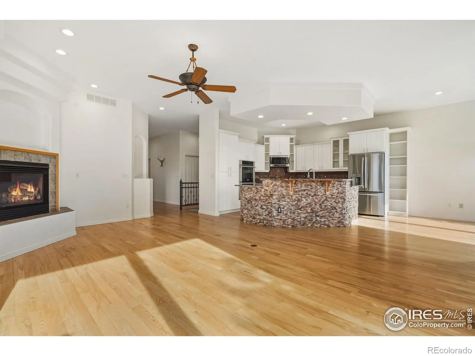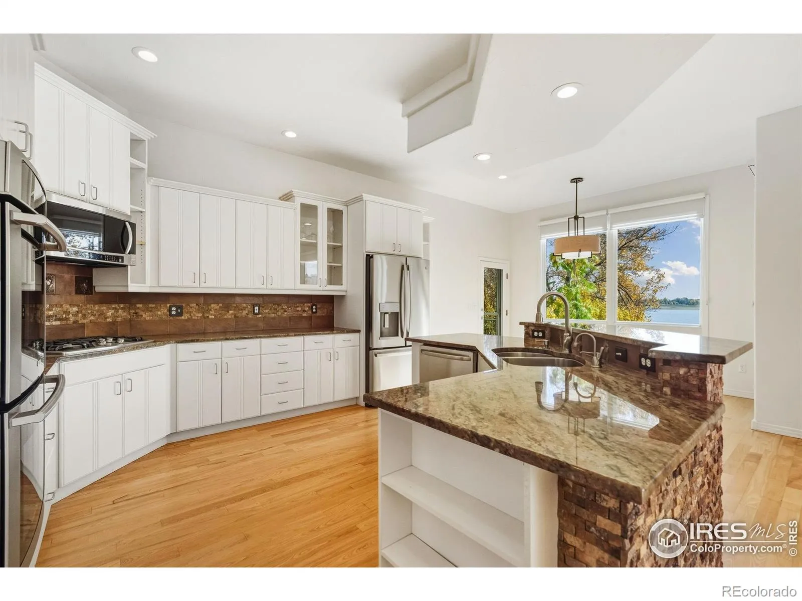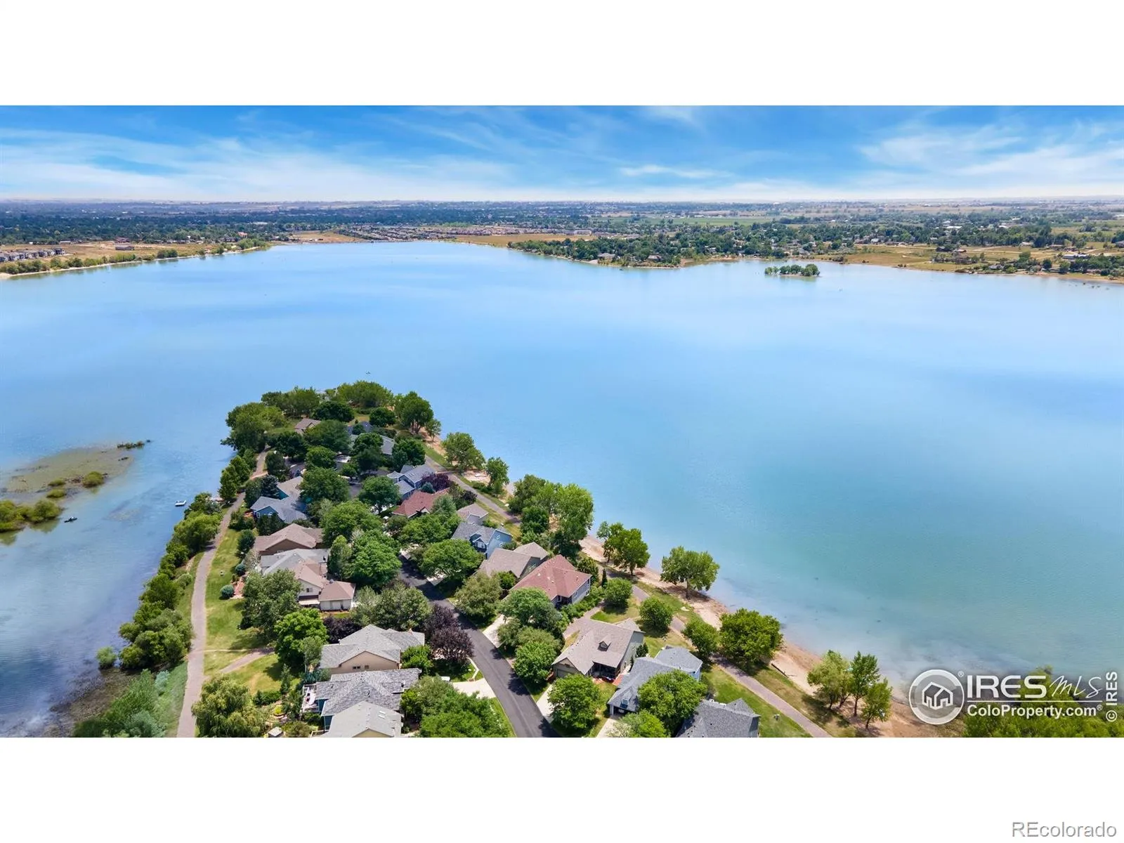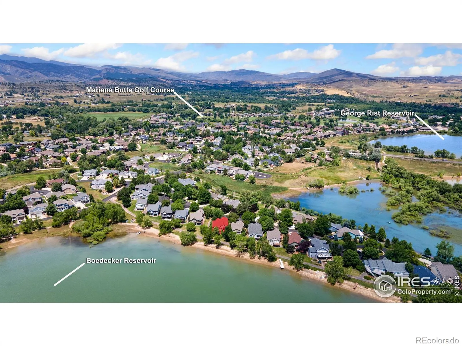 The seller shares: “Oh how we loved our lakefront home. Casual dining on the deck, enjoying peaceful water views, watching wildlife cross the lake, and hosting memorable holiday gatherings made this a special place to live. The builder, who originally planned the home for personal use, selected this lot for its exceptional views within the development.” Welcome to this exceptional custom built ranch-style patio home perfectly situated on the shores of Boedecker Reservoir in the highly sought-after Mariana Cove neighborhood. This spacious and beautifully maintained home has been freshly painted throughout and features brand new carpet, gleaming hardwood floors and a whole house vacuum system offering a move-in ready opportunity. The beautiful custom kitchen includes a large center island, copious amounts of cabinetry, and high-end SS appliances-all set up for the gourmet chef! The kitchen effortlessly connects to the dining and living areas, highlighted by custom built-ins and a welcoming fireplace framed by expansive windows showcasing the amazing lake views. The dining area opens to a large composite deck overlooking the water. The main level also includes a generous primary suite with a luxurious five-piece bathroom and a spacious double walk-in closet, along with a flex room that can be used as a formal dining room or a study, laundry room, and another bed and full bath. The finished walk-out basement offers more space featuring a large rec room with built in office area, a wet bar, 2 bedrooms, a 3/4 bath, a wine cellar, and a large storage area. From this level, you can enjoy easy access to the beautifully landscaped backyard and the reservoir. This home offers direct access to nearby walking trails and is just minutes from the Mariana Butte Golf Course. The Loveland bike path, with its 26 miles of connected trails, is also close. Combining relaxed lakeside living with thoughtful design and a prime location, this property captures the best of Colorado living.