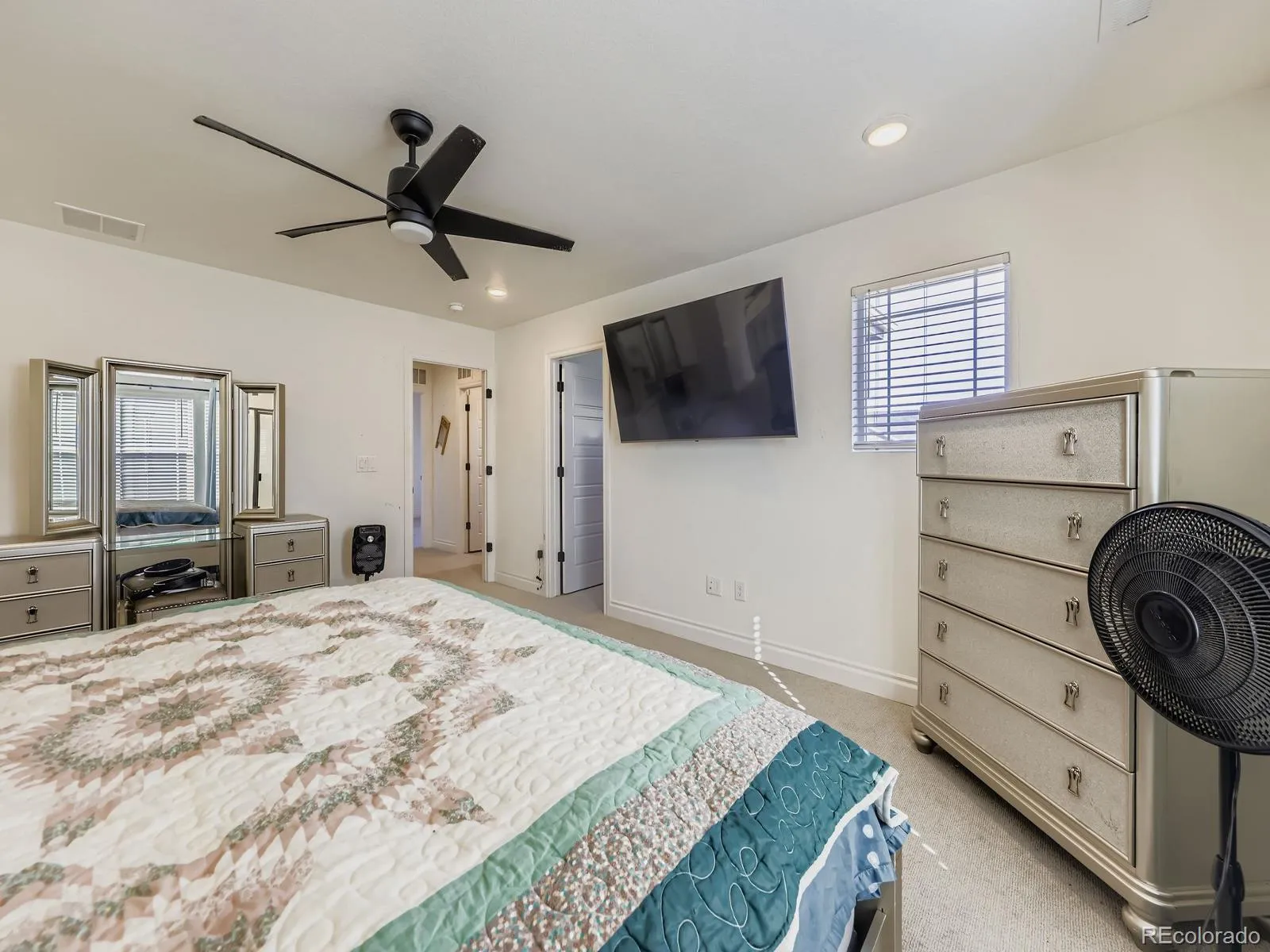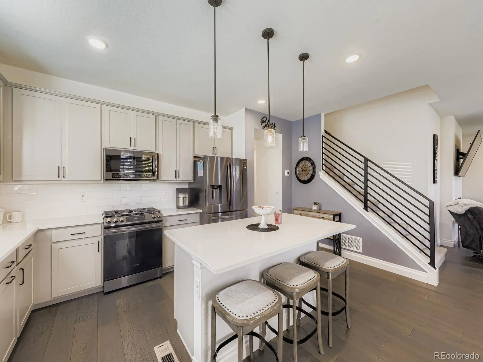 Discover contemporary living at its finest in this stunning 3-bedroom, 3-bath single-family home in Commerce City, ideally located near Buffalo Run Golf Course and a tranquil greenbelt. Built in 2020, this nearly 2,000 sq. ft. home showcases modern design, thoughtful layout, and premium builder finishes throughout. Step inside to find soaring 10-foot ceilings and an open-concept floor plan filled with natural light. The chef’s kitchen is beautifully appointed with quartz countertops, sleek black stainless steel appliances, and a spacious island perfect for cooking, entertaining, or casual dining. The main level offers seamless flow between the kitchen, dining, and living areas, creating a welcoming atmosphere for gatherings. Upstairs, the private primary suite features a walk-in closet and spa-like bathroom, while two additional bedrooms, a full bath, and a versatile loft provide plenty of space for family, guests, or a home office. Enjoy peaceful evenings on the covered front porch or take advantage of nearby parks, trails, and open spaces that enhance the neighborhood’s charm. With its stylish finishes, modern comfort, and prime location, this home perfectly blends convenience and sophistication.