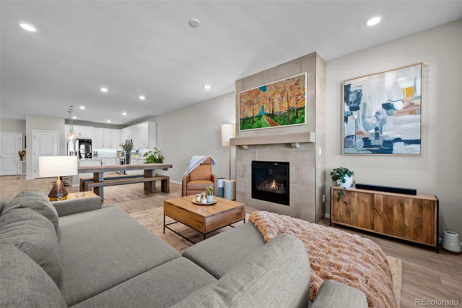 As you enter the home from the charming front porch, you’re welcomed into a bright, open concept living space featuring high ceilings, beautiful plank flooring, and an abundance of natural light. The chef’s kitchen features quartz countertops, sleek cabinetry, and a spacious island, ideal for both everyday living and entertaining. Flowing effortlessly into the dining area and inviting living room with a cozy gas fireplace, this space is designed for comfort, style, and ease.