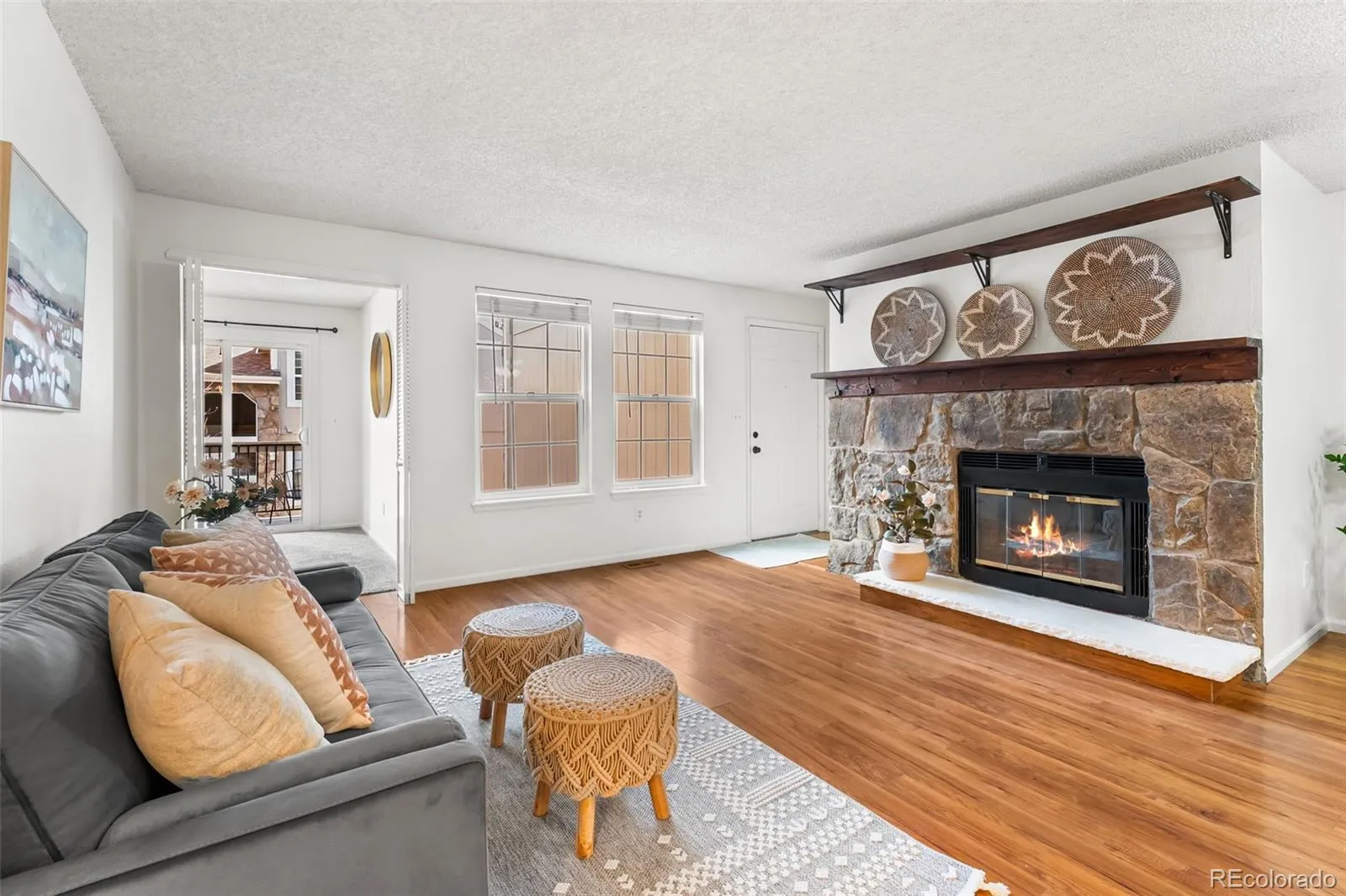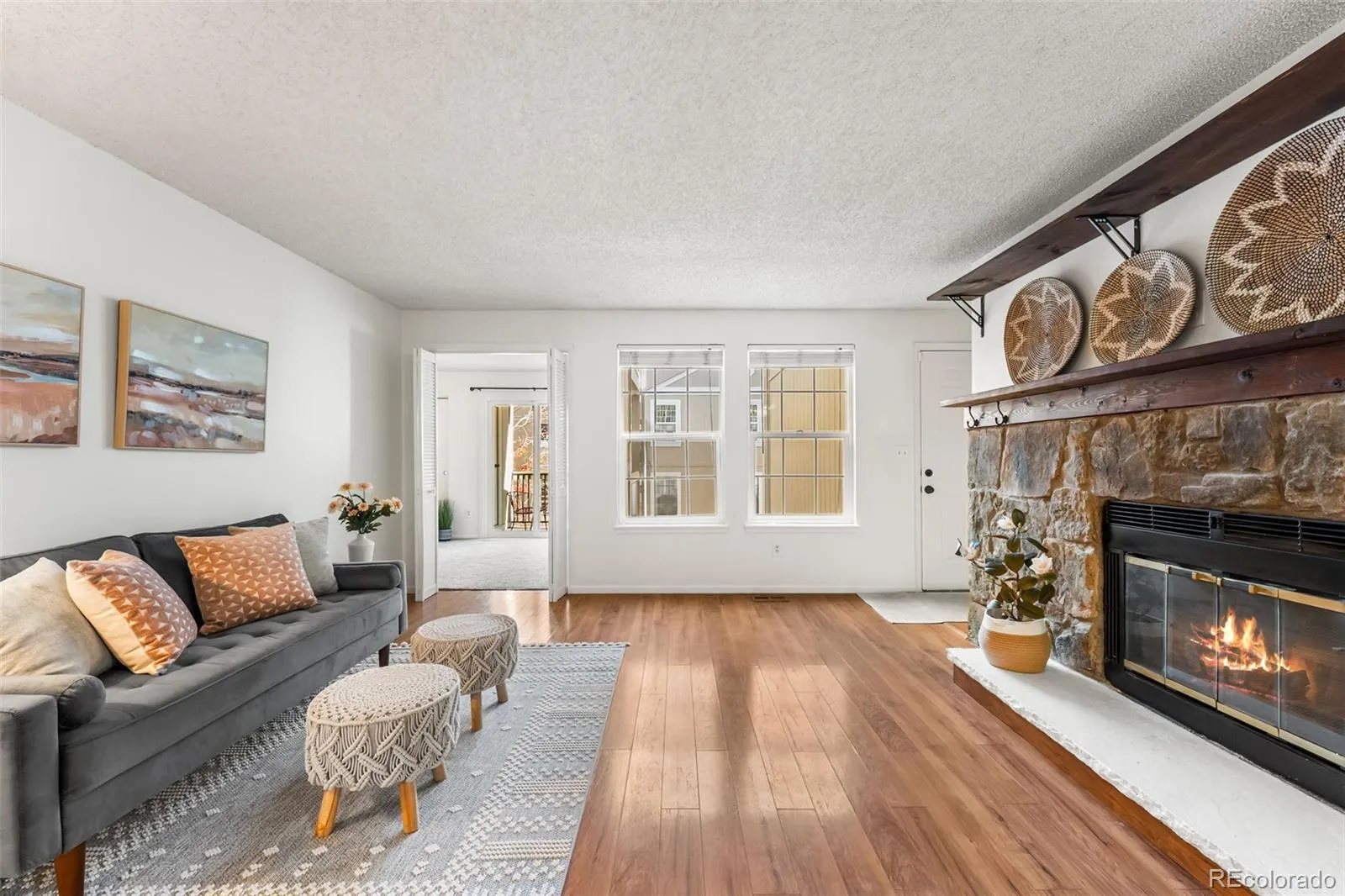Inside, you’ll find thoughtful updates throughout, including fresh professional interior paint, brand new carpet, and a modernized kitchen featuring new stainless-steel appliances. The open-concept layout creates a natural flow from the living room to the dining area, centered around a cozy fireplace that’s perfect for cool Colorado evenings. Step outside to your private patio and enjoy serene views of the pool area — an ideal spot for morning coffee or a quiet unwind after the day.