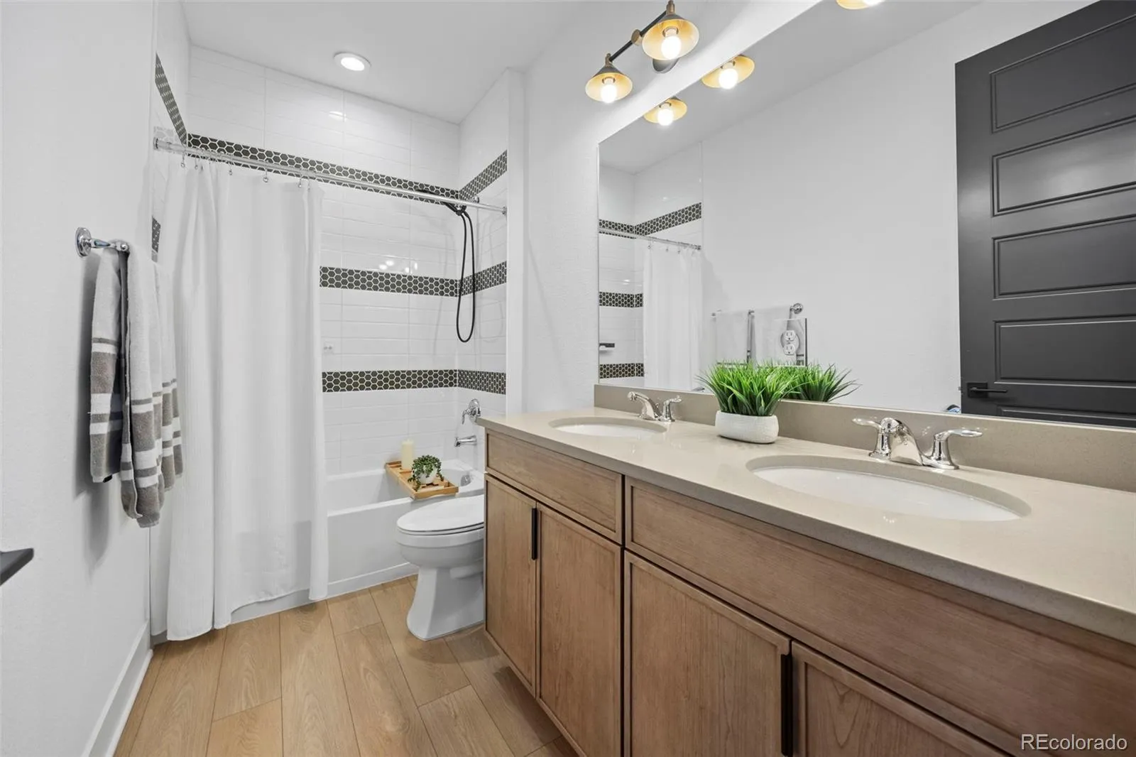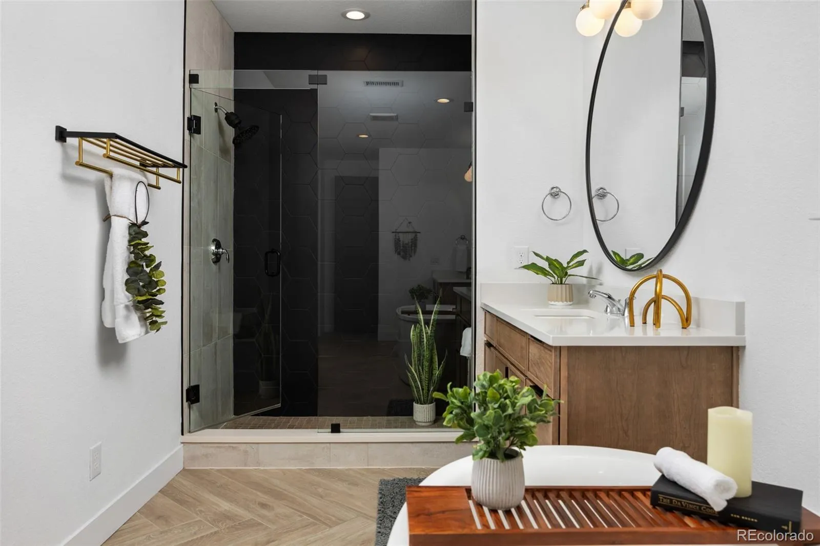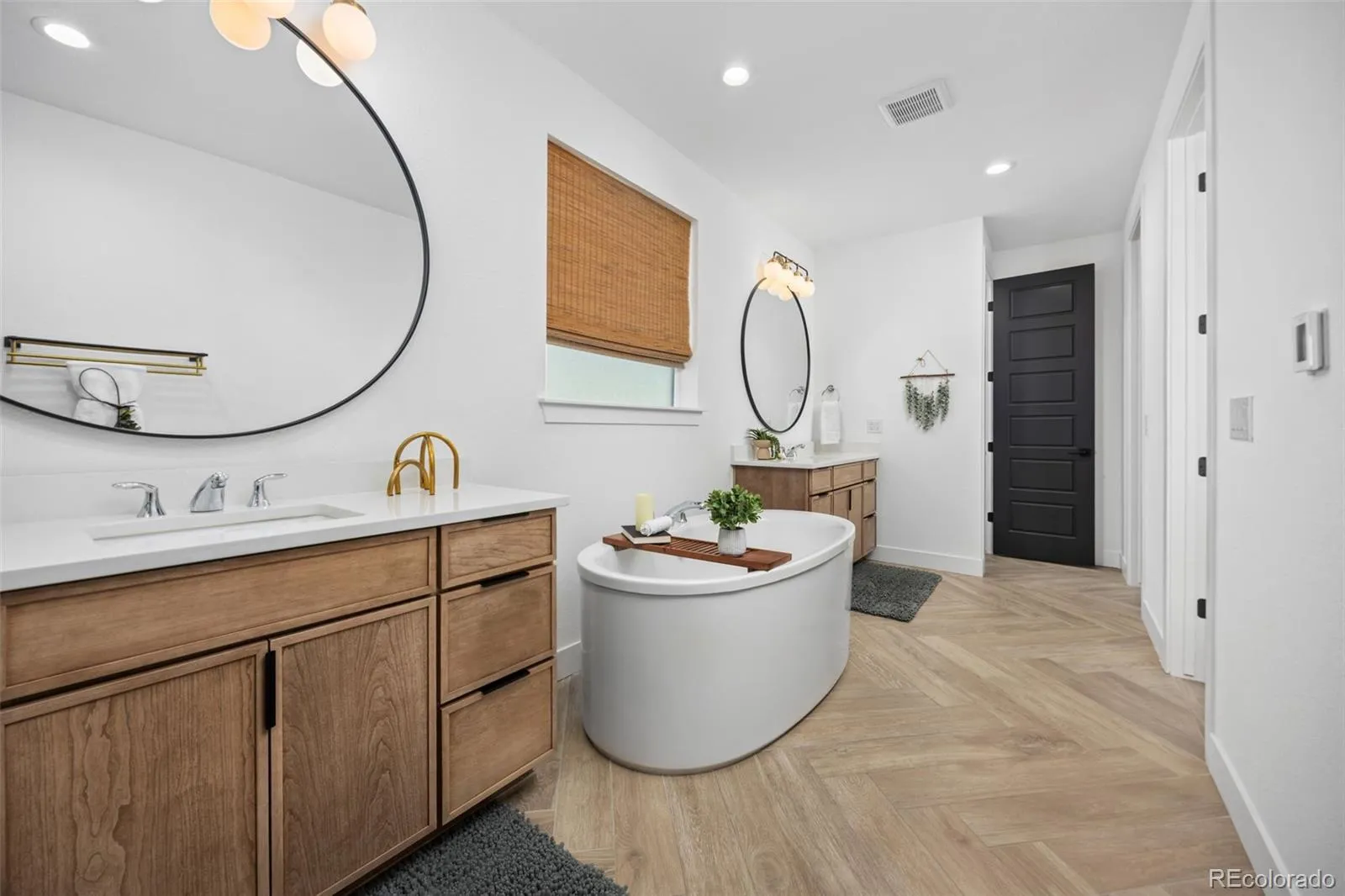 If you’re looking for a retreat to live in then step into this Primary Bathroom! Complete with Heated Herringbone Wood Tile Floors, large shower with dual shower-heads, a bench & designer tile, dual vanities, free-standing soaking tub, enclosed water-closet with outlet for a heated toilet seat or bidet & access to your rather large walk-in closet featuring custom closet system.