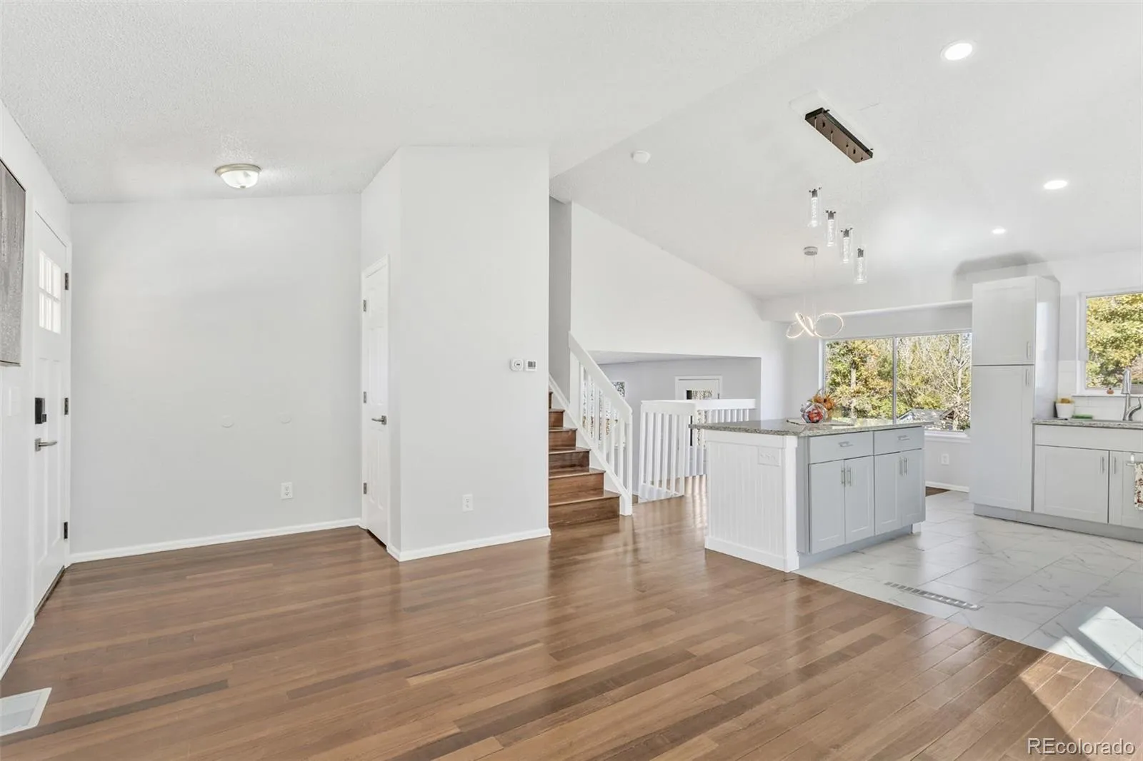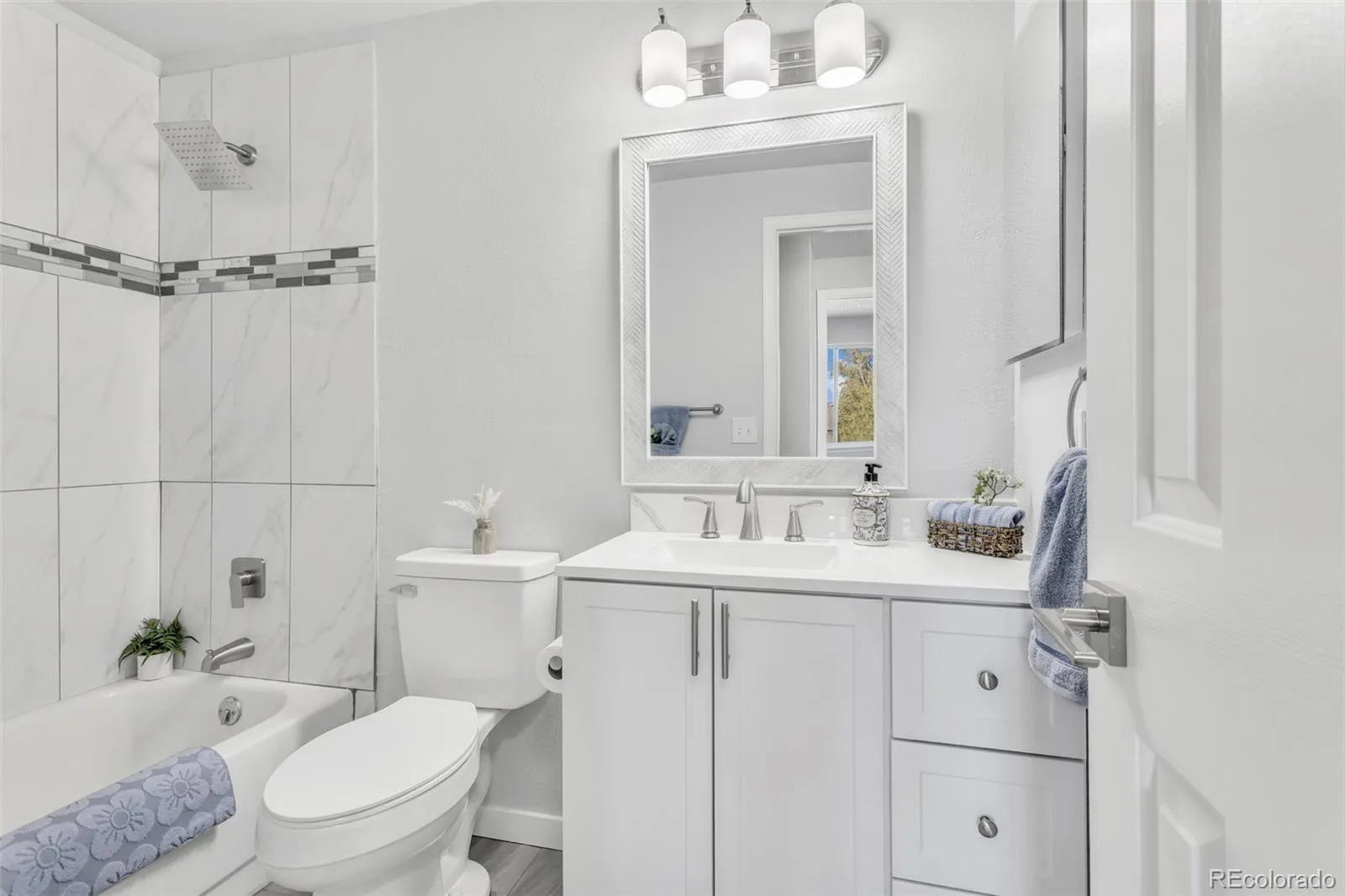 Come and discover a remarkable 4 bedroom house in Centennial that I’m confident will capture your imagination. This home is meticulously reimagined with charm and upgrades! From the moment you arrive, you’ll be struck by its curb appeal as it is situated on an expansive, unique shaped parcel— larger than most in the area. A charming al fresco nook graces the front entry that is perfect for savoring afternoons with a cool beverage in hand. Step inside, & prepare to be enchanted by an interior designed for modern living and entertaining. The sun-drenched living room flows seamlessly into a gourmet kitchen that truly belongs on the pages of an design magazine. Kitchen boasts gleaming granite countertops, contemporary backsplash, and pristine Shaker cabinetry, all complemented with brand-new appliances. Adjacent to the kitchen, a dedicated dining space offers views of the backyard and a way to peek into the cozy lower-level family room. Journeying downstairs, you’ll discover a supremely comfortable 16×12 lower-level family room, ideal for lively game days. A convenient half-bath is perfectly situated near the garage entry.