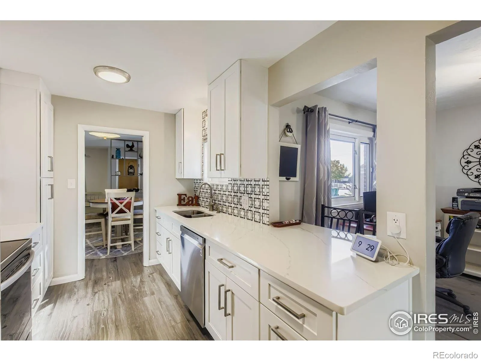 PRIDE IN OWNERSHIP! This classic brick ranch home in the heart of Eaton is fully remodeled and move-in ready! Walkable to Eaton schools. NO HOA! NEW Driveway. NEW backyard patio concrete. NEWER roof and gutters. Upgraded electrical and added can lighting throughout both floors. New Quartz countertops, fresh cabinets, sink, backsplash, and stainless steel appliances with this breakfast serve style window kitchen! Barstool seating option at breakfast serve kitchen island. LARGE pantry space. Turn the upper office space into a LARGER dining room. 2 Dining room option! Second living room or sunroom possibility off the back of the home. OVERSIZED 2 car garage with tall ceilings for storage room! NEW WOOD front door and barn doors. Newer upstairs windows! Enjoy a new main-floor primary suite with tile shower and walk-in closet. COVERED Patio (with gas line for grill), plus an extra carport and alley access. Wainscot ceiling basement. Tile laundry with folding area. Shed included. Modern comfort meets timeless charm-don’t miss it!