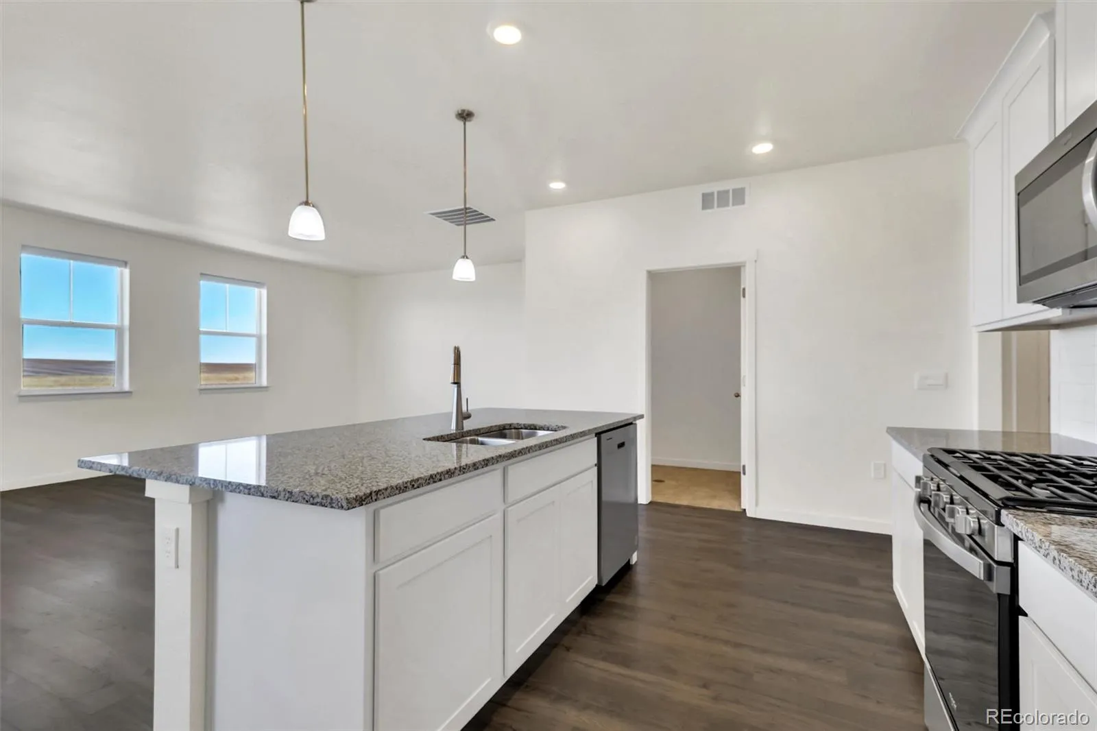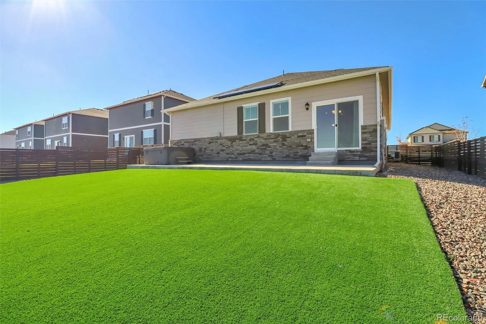 Welcome to this beautifully maintained 3-bedroom, 2-bath ranch-style DR Horton Newcastle floorplan offering modern comfort and energy-efficient living in the vibrant Harmony community in Aurora. This 1659 SF ranch style home optimizes living space and makes entertaining a joy with an open-concept kitchen overlooking the living area, dining area, and back patio. A stylish kitchen with white cabinets and stainless steel appliances, a large center island, granite countertops, lots of cabinet space, and a walk-in pantry are perfect for everyday living and entertaining. The private primary suite includes an ensuite, spacious bathroom with dual vanities, large shower, and walk-in closet with shelving. Two additional bedrooms with closets offer flexibility for guests, family, or a home office. Enjoy a convenient laundry room off the kitchen area and a 2-car garage with additional storage space. A fully fenced backyard with an expanded patio and hot tub is perfect for relaxing outdoors as you look out over the undeveloped land to the east.