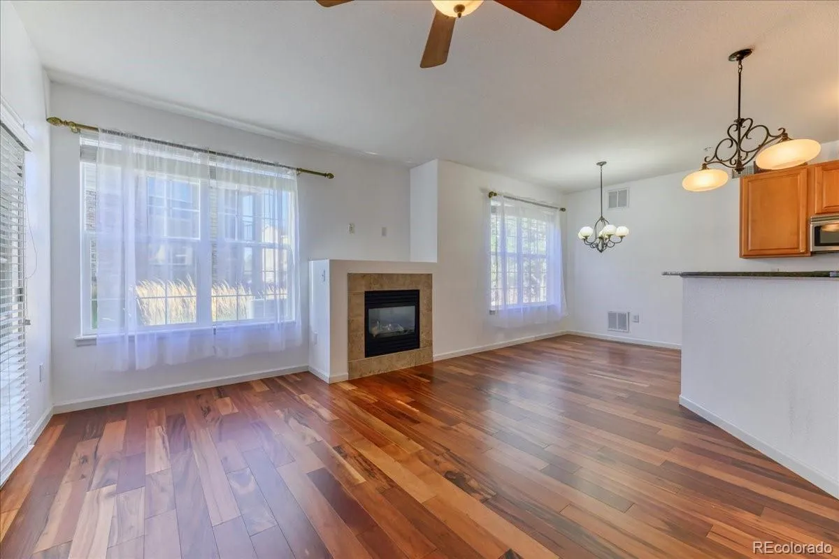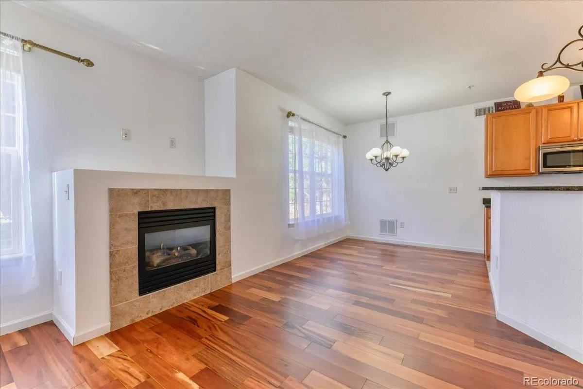 Experience effortless Colorado living in this beautifully updated condo in the sought-after Prairie Walk on Cherry Creek community. Designed for comfort and style, this ground-level residence offers an open-concept layout with recently refinished Brazilian Tigerwood floors, high ceilings, and an abundance of natural light. The spacious living room features a cozy gas fireplace and opens directly to one of two private patios—perfect for enjoying morning coffee or evening sunsets.