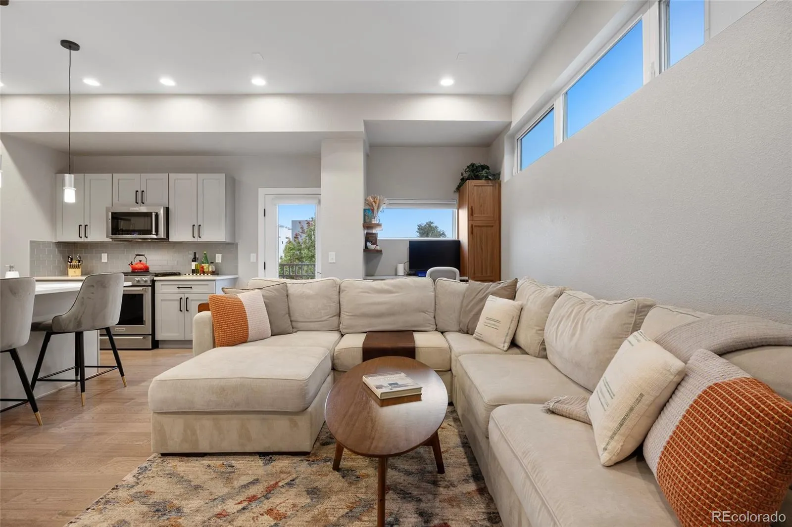 Welcome to this well designed townhouse, that offers the perfect opportunity for high level, exciting urban living. From the lovely street level front porch and side attached garage, come inside to a tiled Foyer and large windowed storage closet that can double as a home office, up the stairs to a spacious and light Great Room, offering a perfect opportunity to relax, or entertain. The upgraded gourmet kitchen is the perfect place to make delicious family meals or entertain elegantly with Kitchen Aid stainless appliances, gas range, extensive cabinetry, sparkling quartz countertops and island. A built in desk against the wall is a dedicated work space, and a powder room is included here for more convenience. Step outside to the second floor balcony for a beautiful view, fresh air, or to grill on the gas cooker. Enjoy meals in the dining area or on the balcony where you watch the active neighborhood. Upstairs you’ll find the primary bedroom with an ensuite bath, double sinks, a designer walk in closet and large windows and another balcony with stunning views. The guest bedroom also has an ensuite full bathroom. The laundry with washer dryer is conveniently behind the sliding barn doors and on the same floor as the bedrooms.
