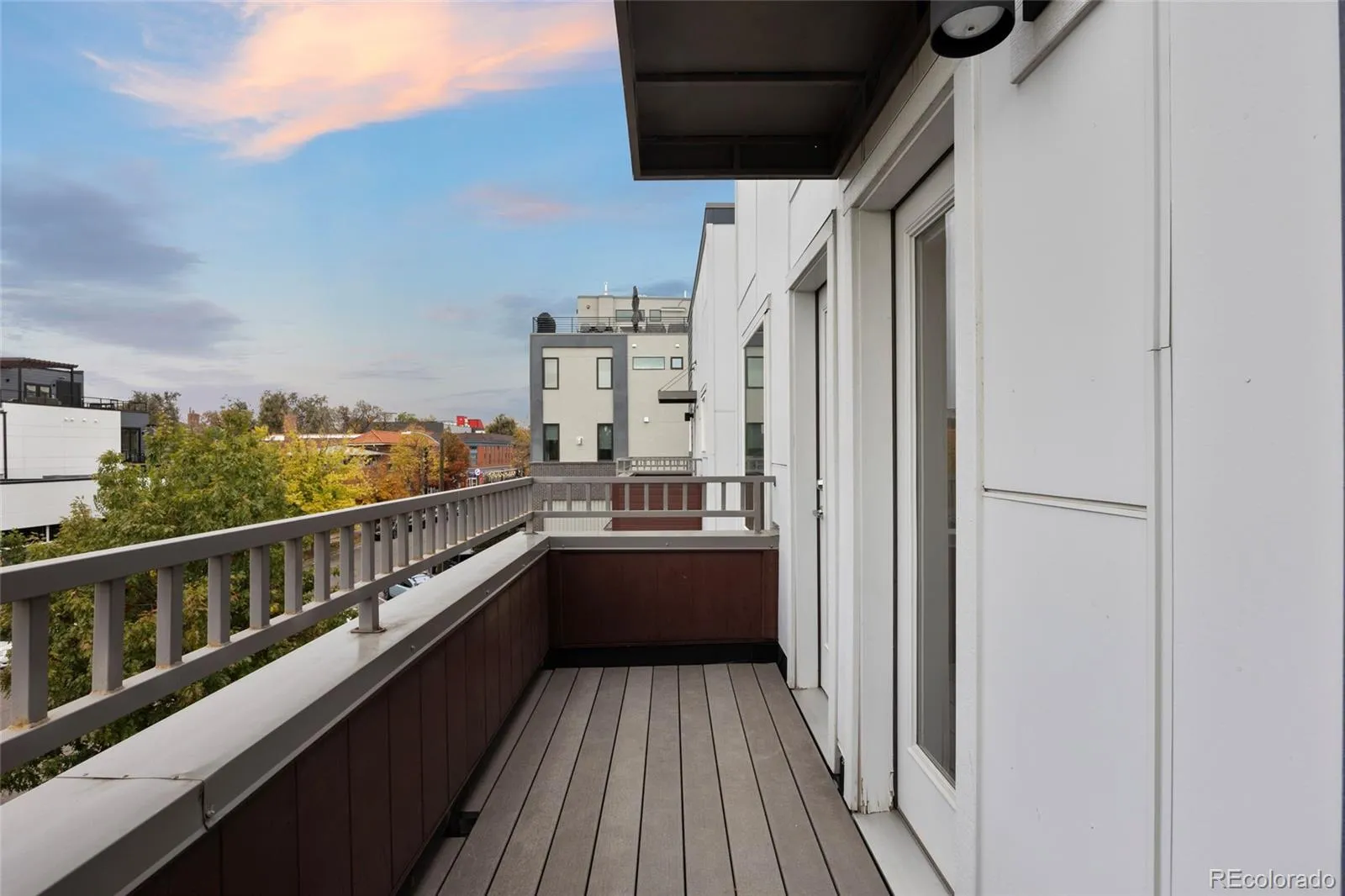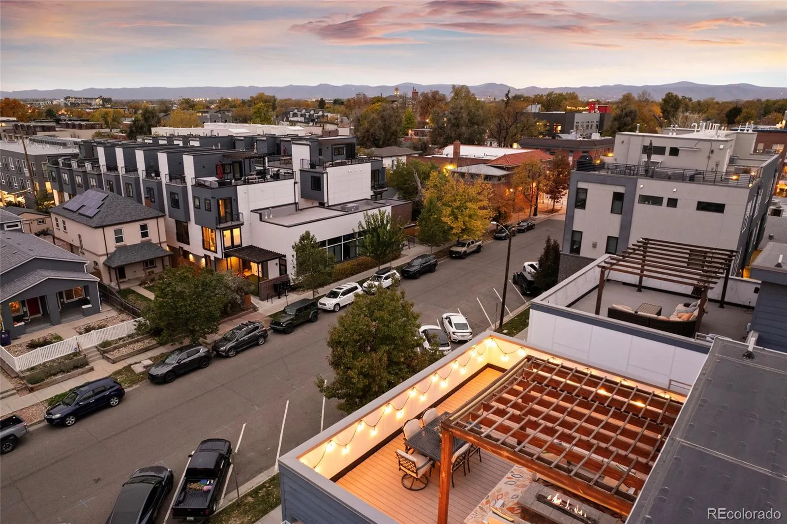 Now for a real urban delight. Up the stairs, and you won’t believe the outdoor living room on the rooftop deck! Here you are offered unbelievably beautiful views of the city, of the mountains, of Mile High stadium. The stylish patio furniture and the gas firepit could be included. Enjoy morning coffee, cocktails at dusk, or in any weather or anytime of the day, as there is a pull out tented roof under the pergola, and this is the place to enjoy fireworks over the city in the summer.