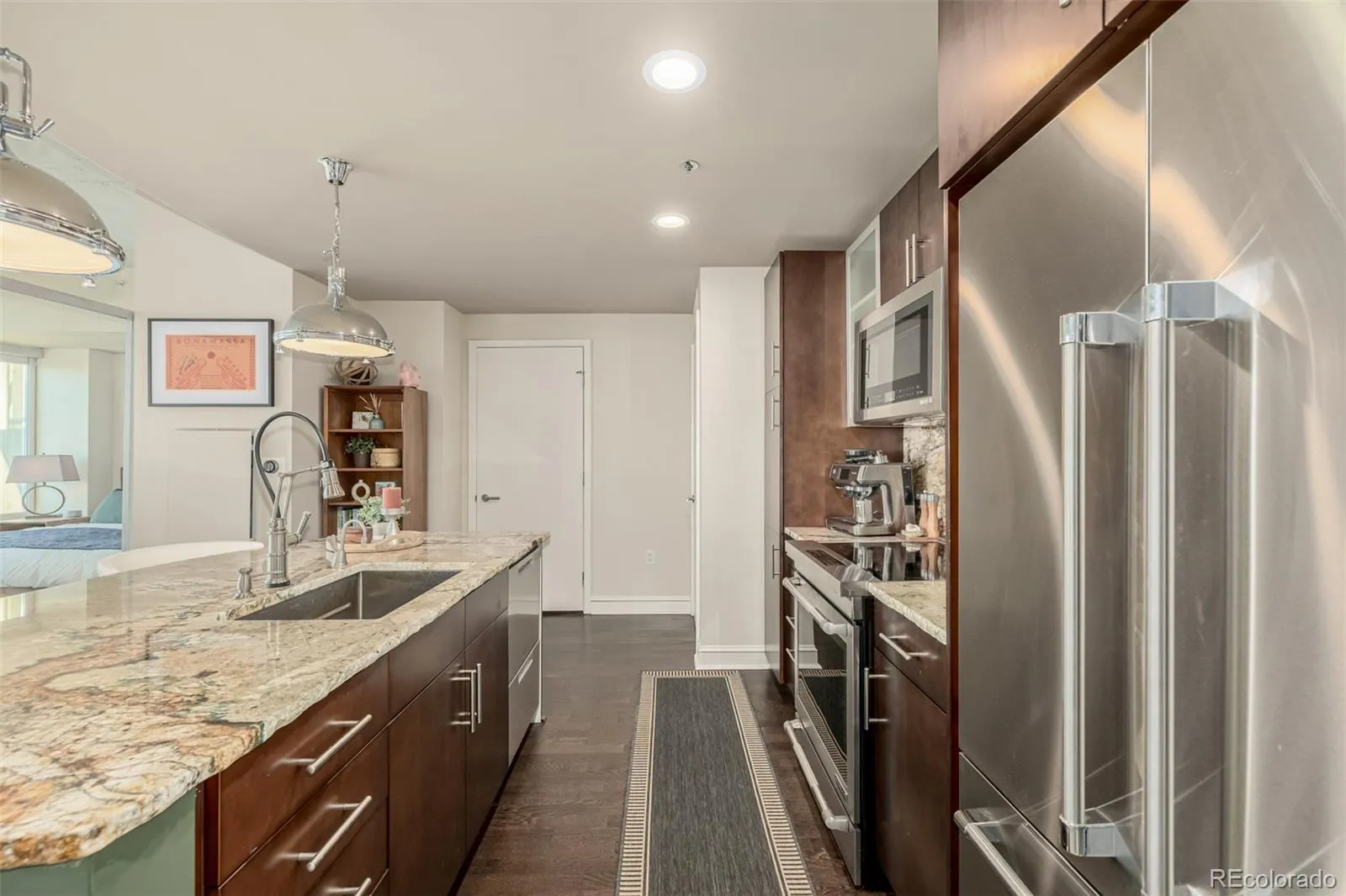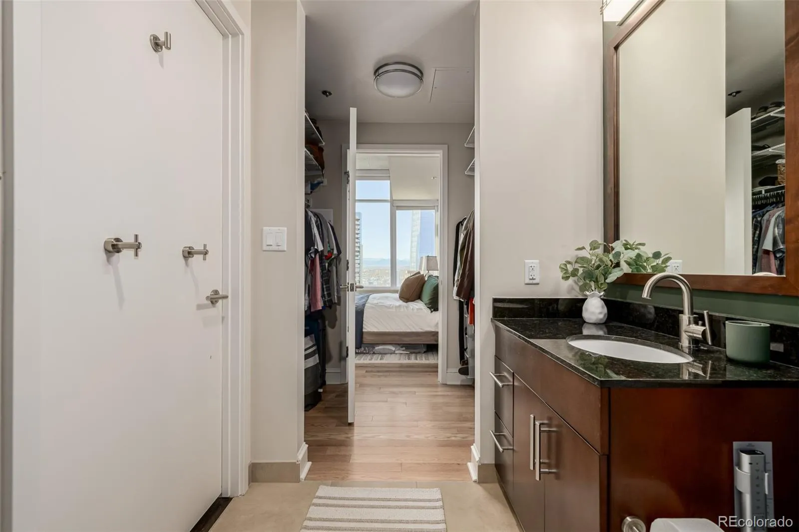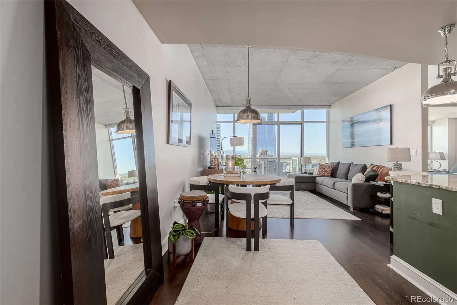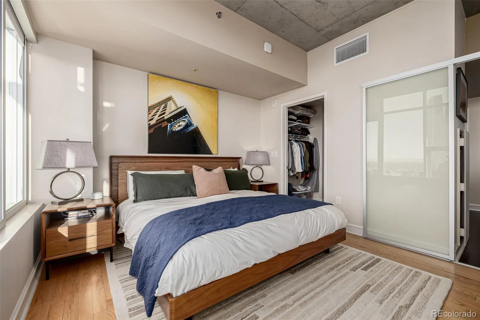 Experience elevated city living in this stunning 1 bedroom/1bathroom condo with incredible skyline views! The welcoming entrance foyer opens to a sophisticated interior featuring high ceilings, engineered hardwood floors, and floor-to-ceiling glass that floods the home with natural light. Enjoy the automatic blinds throughout this stunning residence. The open kitchen is a chef’s delight with custom granite counters, upgraded stainless steel appliances, and a breakfast bar island perfect for casual dining or entertaining. Bright bedroom offers a serene retreat with a walk-in closet, while the bathroom showcases a glass-enclosed tub/shower combo and modern finishes. A stacked washer and dryer adds everyday convenience. The charming balcony is perfect for enjoying fresh air and amazing mountains/city views. This condo also includes a reserved deeded parking space (desirably located on level 2) and access to resort-style amenities such as a pool, hot tub, club room, movie theater and gym. The location is unbeatable! The building sits within walking distance to 16th Street Mall, DCPA, Sculpture Park on Speer and all the amazing restaurants on Larimer Square. One amazing perk of owning this unit – enjoy access to the penthouse SkyClub lounge high atop the 42-story SPIRE.