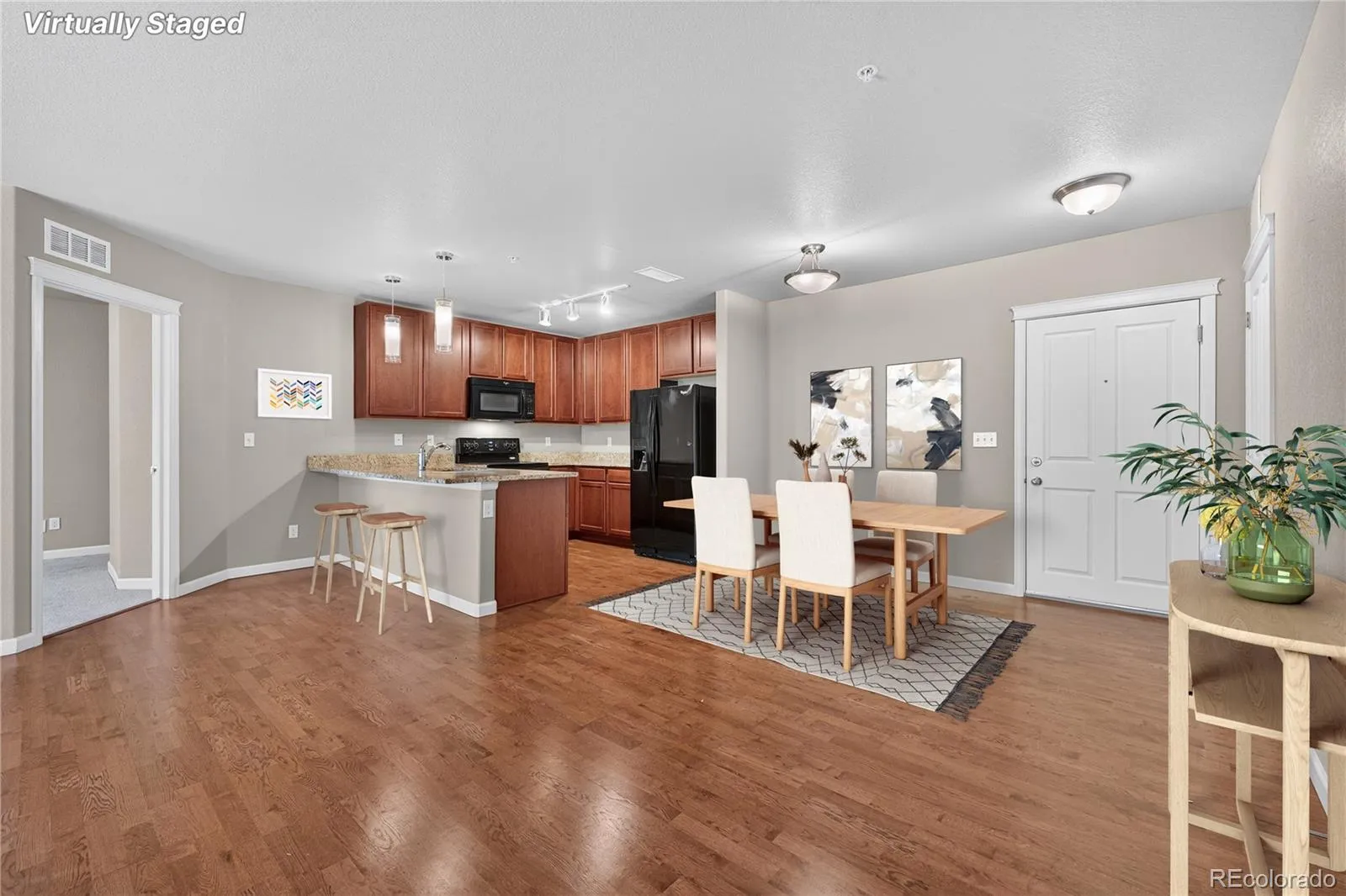 Experience effortless, low-maintenance living in this bright and open Highlands Ranch condo, perfectly designed for comfort and convenience. Sunlight fills the open-concept layout, highlighting a spacious kitchen and breakfast nook with sleek granite countertops that make casual meals and entertaining a pleasure. The spacious living room is anchored by a cozy gas fireplace and opens to a large balcony, offering a relaxing space to enjoy fresh air or host friends. The primary suite provides a private retreat with a walk-in closet and ensuite bath, while a versatile second bedroom can serve as a guest room, home office, or hobby space. A full-size laundry room located just off the entry enhances daily convenience. Residents benefit from four recreation centers featuring pools, gyms, courts, and a variety of activities, as well as underground parking, secure storage, and comprehensive maintenance including snow removal, water, and trash service. The community is surrounded by miles of trails, scenic parks, and open spaces, offering endless opportunities for walking, biking, or enjoying the outdoors. With quick access to C-470, medical centers, ski resorts, shopping, and dining, this condo blends modern comfort with an active, vibrant lifestyle. From everyday ease to abundant recreational options, it’s a place designed to make every day enjoyable.