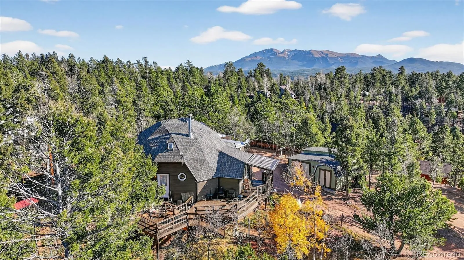 Unique Geodesic Dome Cabin with Stunning Pikes Peak Views! Discover this beautifully upgraded geodesic dome cabin on two lots, offering breathtaking views of Pikes Peak and the surrounding forest. Perfectly tucked away in Teller County, this hidden gem borders Pike National Forest for added privacy and endless outdoor recreation. Inside, you’ll love the newly remodeled kitchen featuring granite countertops, LED lighting, and a five-burner stove. Comfort meets efficiency with radiant in-floor heating, a reverse osmosis water filtration system, and a layout designed for everyday living or entertaining. A bonus area off the dining room offers a versatile extra space. The home offers two primary suites—one on each level—each with its own bath, multiple skylights ideal for stargazing in your own living room and you can enjoy watching wildlife from your front porch. Step outside to enjoy a brand-new deck (installed September 2025), a wrap-around porch, and a circular driveway with extra parking and RV space. The property also includes access to a whimsical earth ship sauna, the perfect retreat after a day of exploring. This property blends organic modern design with Colorado mountain charm, combining cedar, log, and adobe construction. Whether you’re looking for a year-round residence, a vacation getaway, or a turnkey Airbnb/VRBO investment, this home delivers unmatched versatility—no HOA and no city short-term rental restrictions. Just 10 minutes from Woodland Park, this rare find offers the ultimate Colorado lifestyle with hiking, biking, ATVing, and snowmobiling right from your doorstep. Schedule your showing today and experience mountain living at its finest!