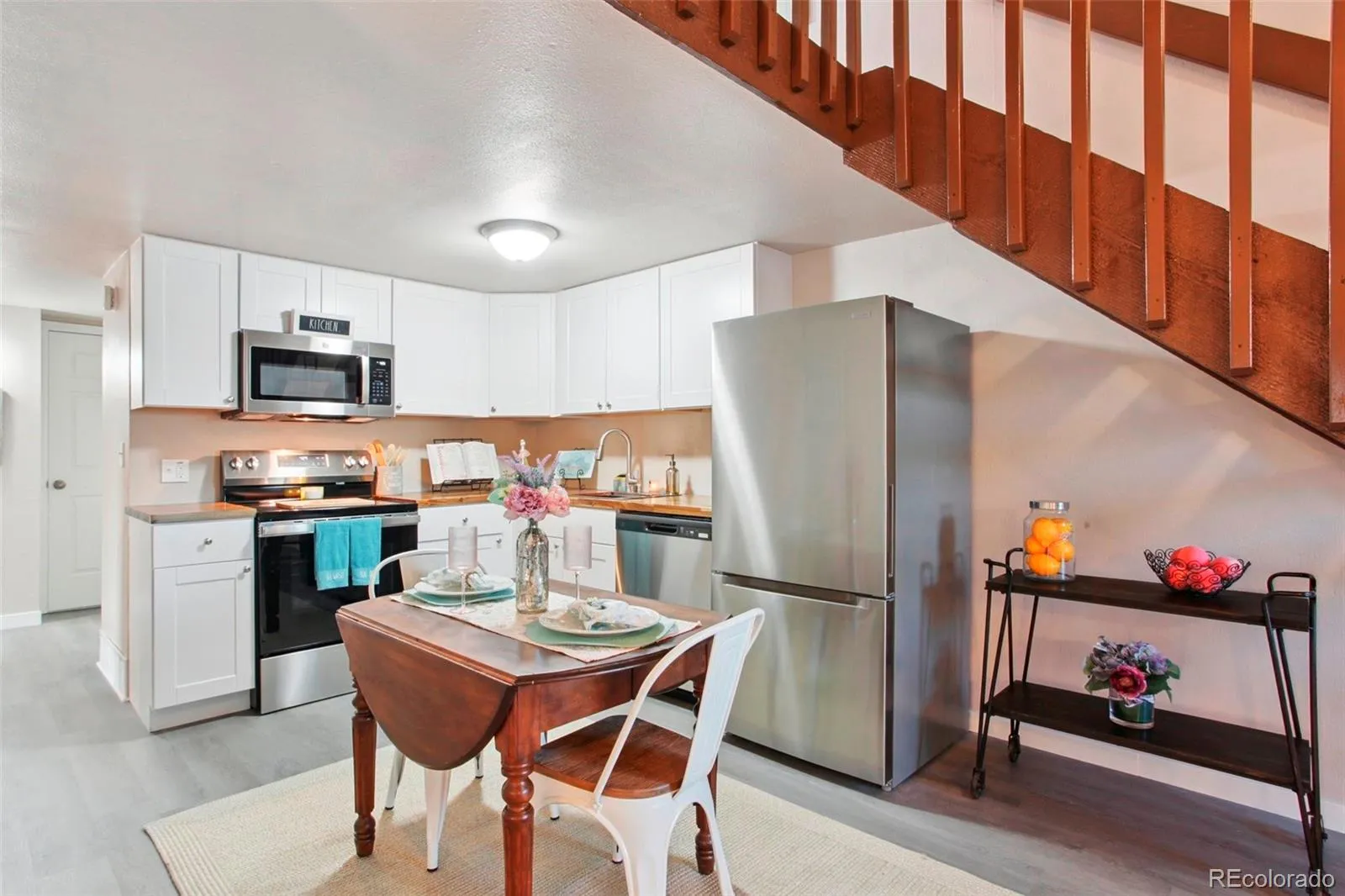 • Updated kitchen with white shaker cabinets, butcher block countertops, and all new stainless steel appliances (fridge, microwave, dishwasher, range)