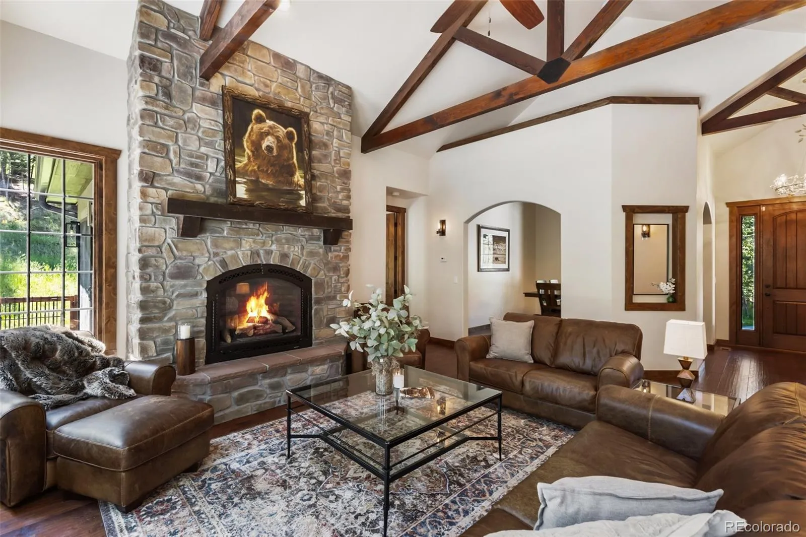 Luxury Living in Prestigious Neighborhood This exquisite residence is located in one of the area’s most sought-after neighborhoods, offering a perfect blend of timeless design and modern comfort. From the moment you arrive, the upgraded Windsor Alder wood windows with bronze-clad exteriors and rich architectural details set the tone for refined living. Inside, the main living area features custom-engineered floating wood flooring, vaulted ceilings with striking timber trusses, and three elegant Heat-N-Glow fireplaces. The gourmet kitchen flows seamlessly into the great room, creating an ideal space for entertaining or relaxing. Retreat to the oversized master suite with a private laundry in the expansive walk-in closet, while guests enjoy the privacy of additional well-appointed bedrooms and living areas. With two furnaces for separate heating zones, comfort is ensured year-round. The home also boasts a 22 x 34 insulated and heated three-car garage, perfect for vehicles, storage, or a workshop. Outdoors, enjoy a spacious composite deck with Pagoda and drop down to second deck. Beautifully landscaped surroundings in this exclusive community. Furnishings can be purchased or negotiated. This residence is more than a home—it’s a statement of luxury and lifestyle.