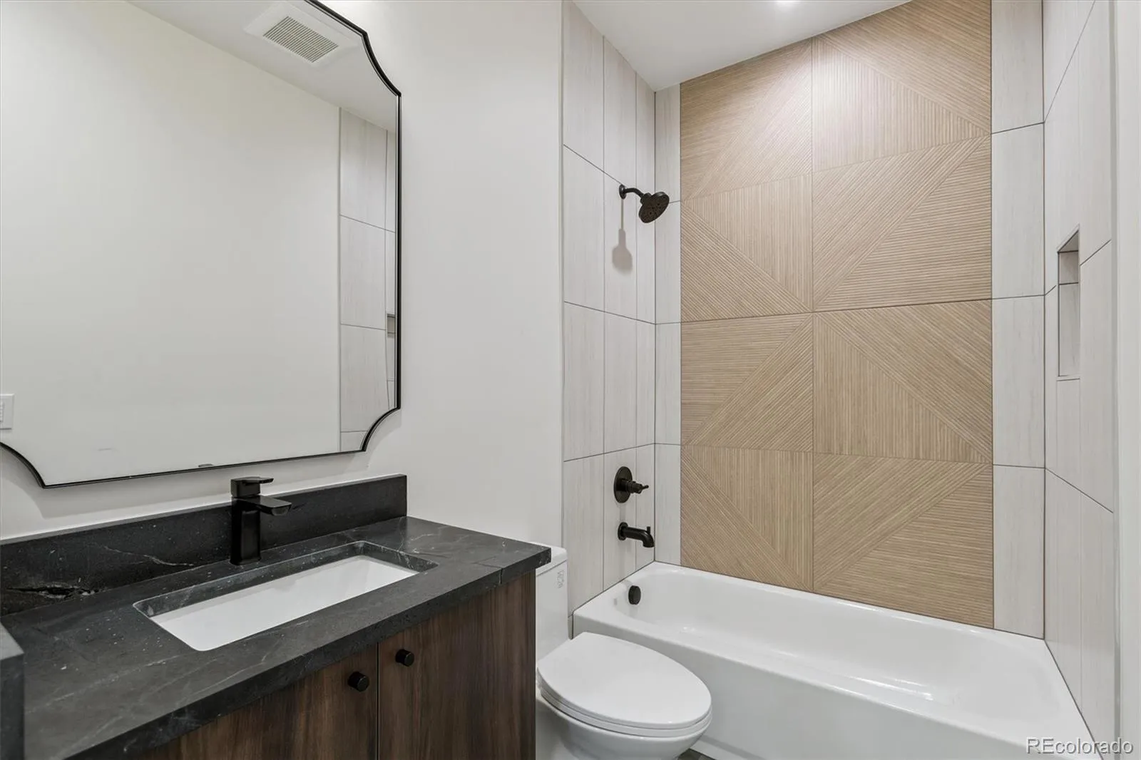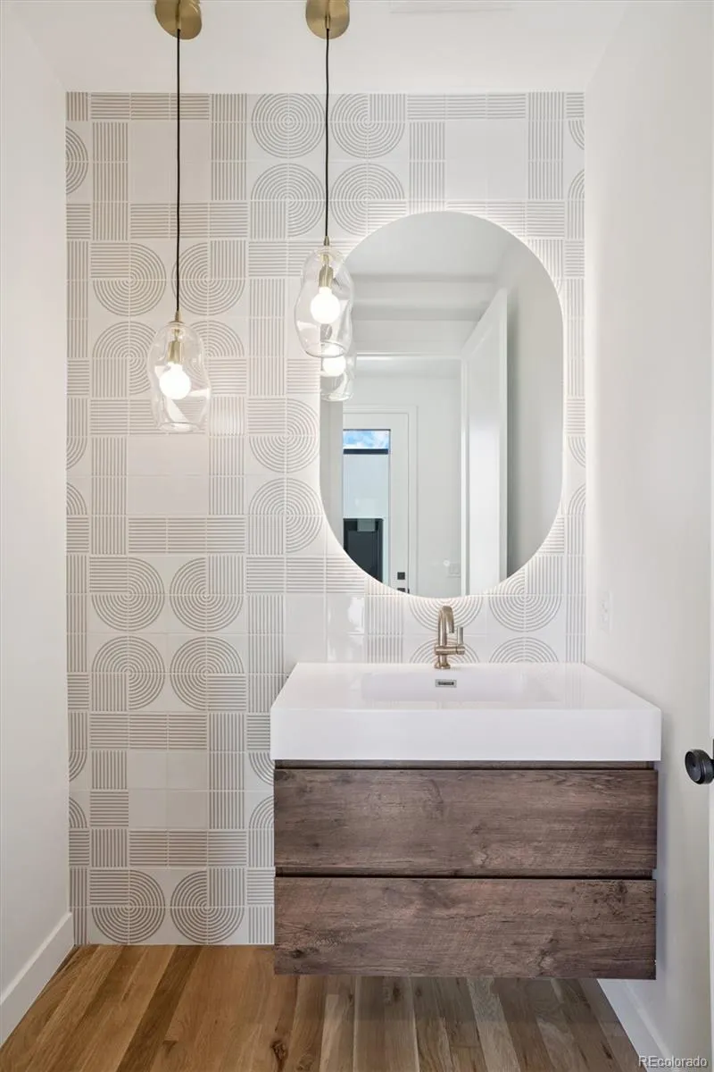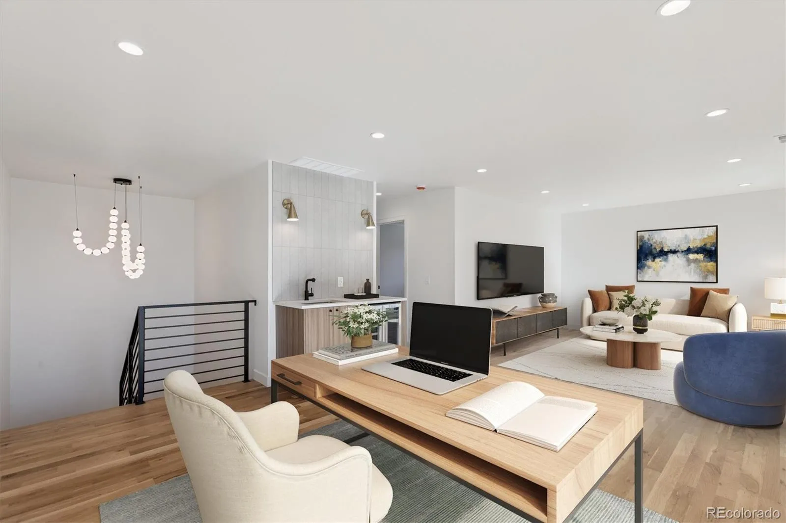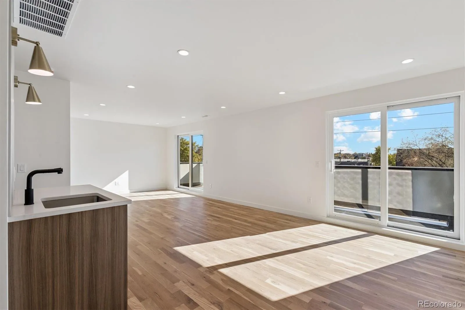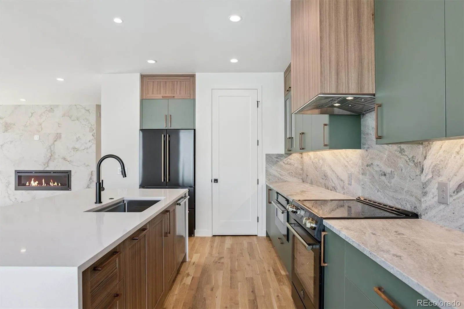 Where contemporary design meets Colorado lifestyle — this home defines elevated urban living. Flowing like a single-family residence, this thoughtfully designed half duplex delivers 3,520 sq ft of sophisticated style. The open-concept main level showcases a designer kitchen with imported stone countertops, moody black-and-gold appliances, walk-in pantry, and sleek slab backsplash. Real hardwood floors set a refined tone while a modern linear fireplace and statement lighting create a warm, inviting space. Every finish feels intentional — blending architectural edge with a softer, designer-curated aesthetic rarely found in new construction. Up the striking steel-and-wood monorail staircase, three of the five bedrooms sit on one level, including a primary suite with a spa-inspired bath featuring heated floors, a fluted soaking tub and dual vanity. The third level offers incredible flexibility with an additional private bedroom, extra-large bonus room, wet bar w beverage fridge, full bath, and rooftop deck. The finished basement impresses with 9-ft ceilings, a spacious recreation room, custom wet bar, and private guest suite with full bath. Outdoor living shines with a large, private backyard with south sun exposure. Direct access to the 2-car garage, EV-ready (220 V). Built to Denver’s newest Green Code, this all-electric home offers lower bills, cleaner air, and superior efficiency. Eco features – EcoBee thermostat, Ring doorbell, WiFi-enabled heat pumps, programmable lighting & fireplace, UV Windows. No HOA. Party Wall Agreement. Buyer to verify taxes & square footage. Schedule your private showing today — exceptional homes like this are rare.