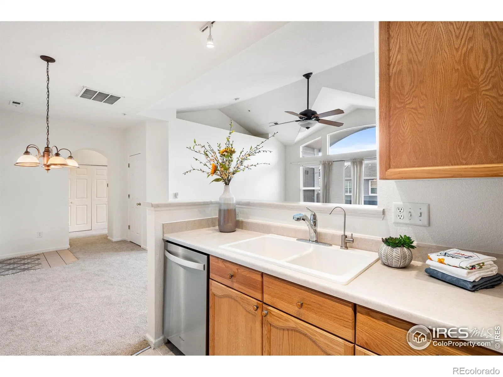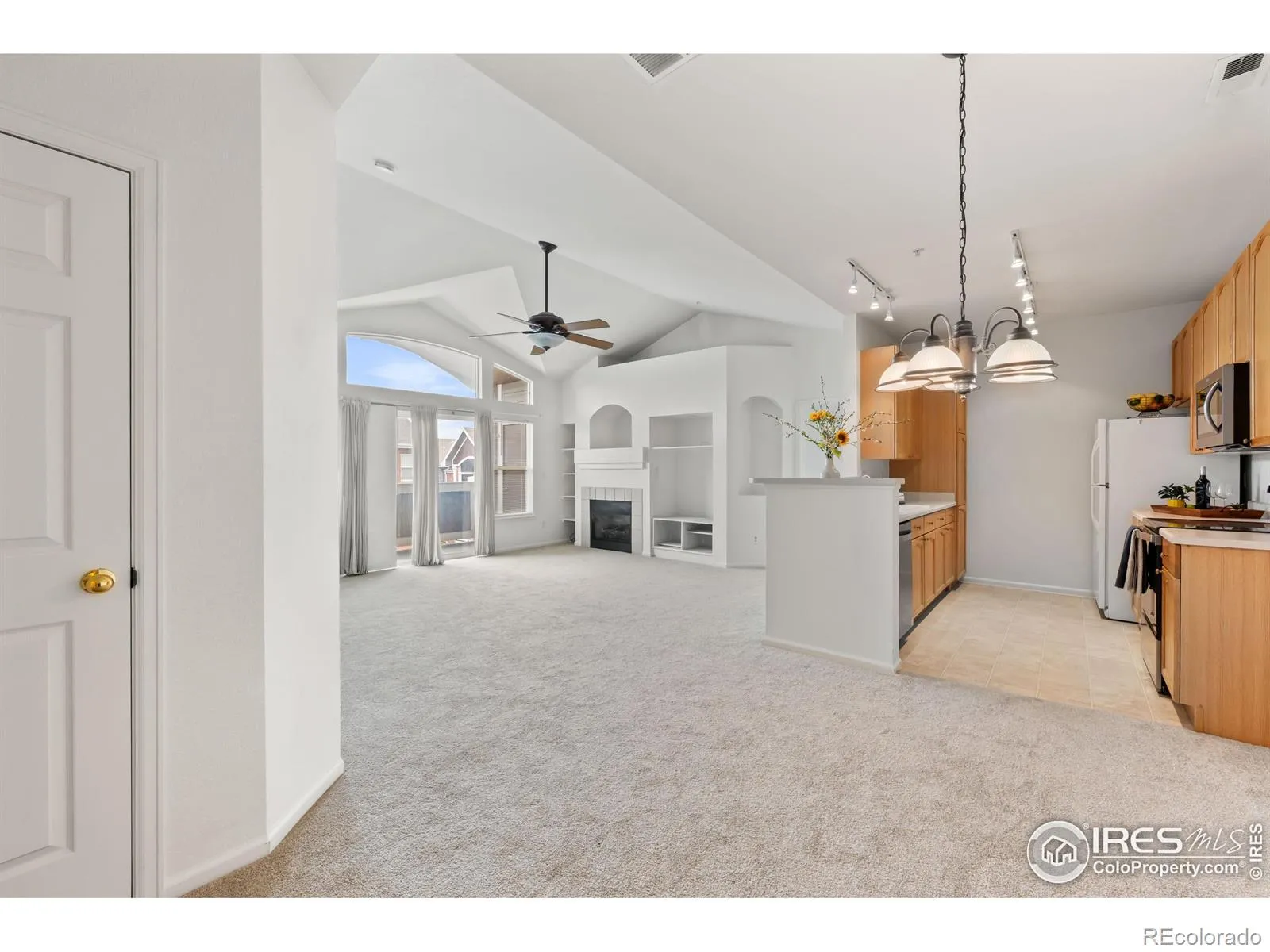 BRIGHT AND LIGHT top floor unit in popular Cherry Grove WITH A GARAGE and extra parking! This EXCEPTIONAL 2 bedroom, 2 bathroom condo is in immaculate condition and ready for immediate occupancy. Huge vaulted ceilings, large windows and sliding glass door provide TONS of light. Living room has plush carpet, ceiling fan, fireplace, built-in shelves and private balcony with large storage closet. Spotless kitchen, track lighting and separate dining room with chandelier. Great floorplan with divided bedrooms and bathrooms, excellent for privacy. The primary bedroom has tasteful paint color, Large walk-in closet and a bathroom with a large soaker tub. Full second bathroom, large laundry closet with washer, dryer and shelving. This unit is comfortable, convenient, in a clean complex with many amenities and is VERY close to the light rail.