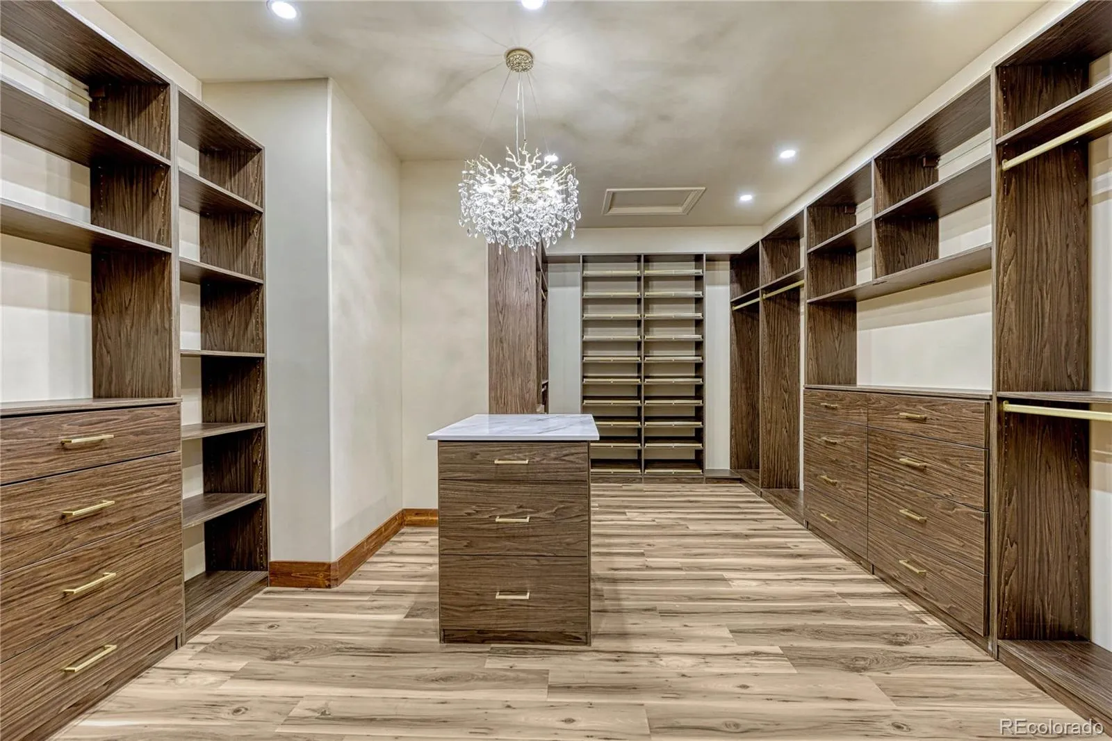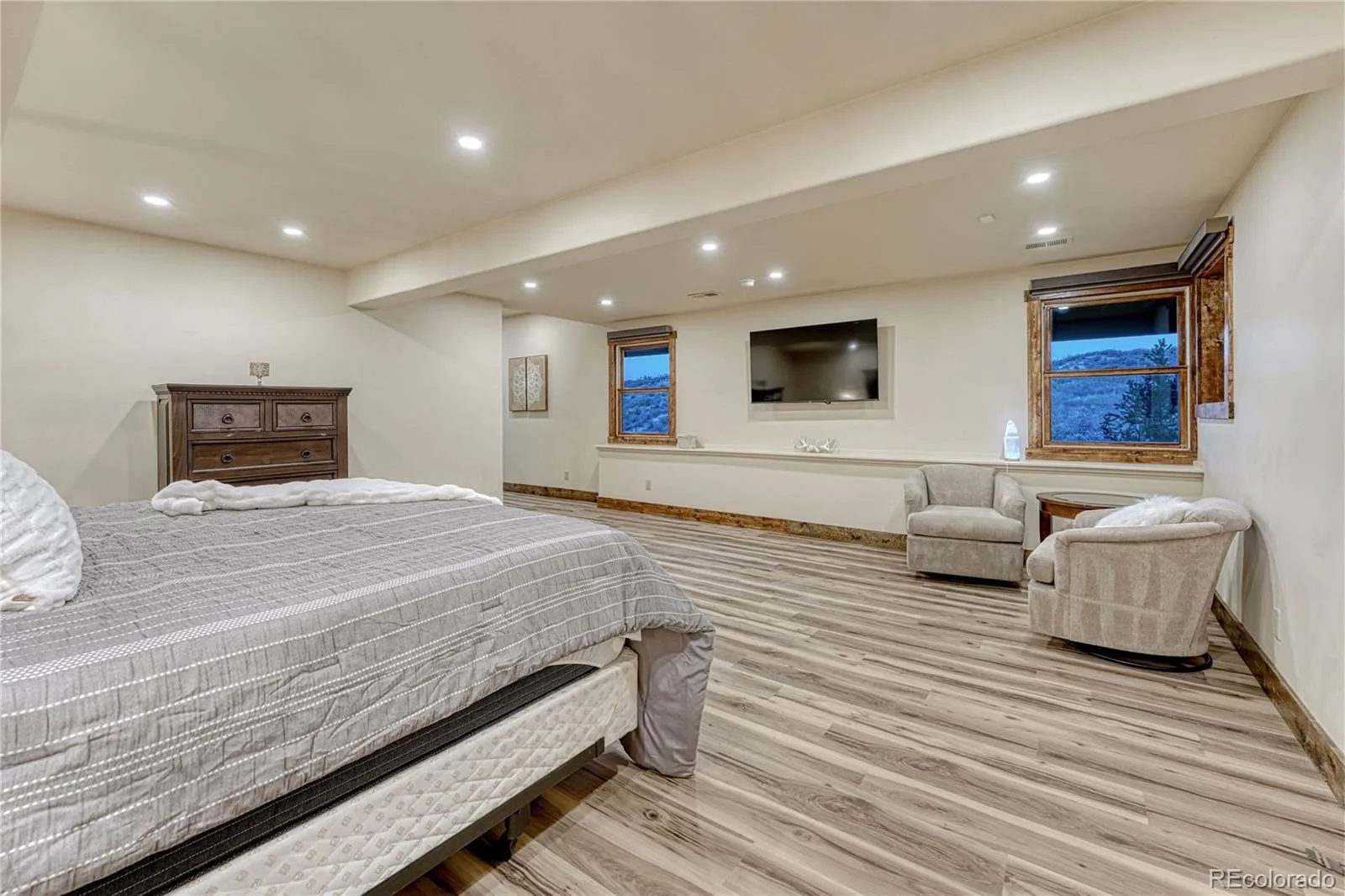 Main level primary bedroom has a vaulted ceiling, double glass doors that walks out to the wrap around covered/uncovered deck on 3 sides of the home. Primary bathroom is equally as impressive with two toilet rooms, slab tile floors, walls, & wainscot, glass shower enclosure, deep soaking tub, and an oversized walk-in closet with built-in shelves, dressers, and chandelier. Basement has 2 bedrooms, 2 full bathrooms, large game room, wet bar, and walks out to the new lower level deck. One of the bedrooms could be a 2nd primary bedroom due to the design, size, walk-in closet, and full bathroom.