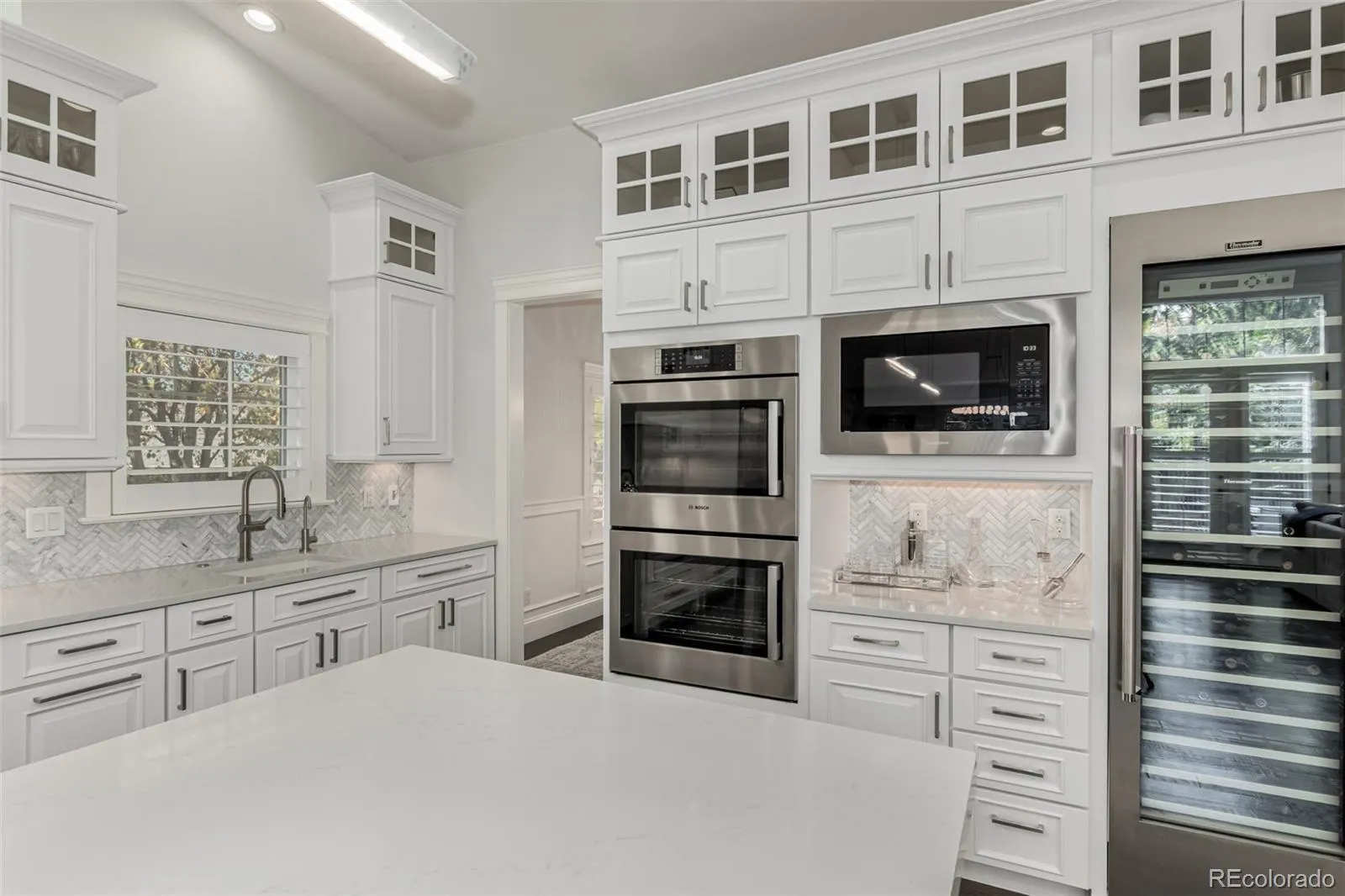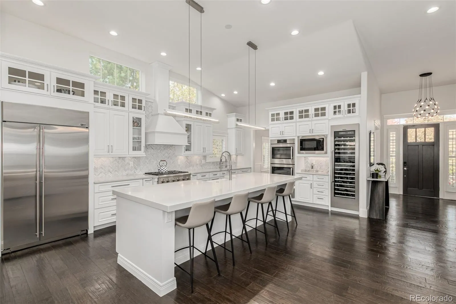 The gourmet kitchen is a showstopper, featuring quartz countertops, herringbone tile backsplash, ample cabinetry, pendant lighting, a cozy breakfast nook, top of the line appliances including a Thermadoor wine refrigerator, and a large center island with breakfast bar—a true chef’s dream.