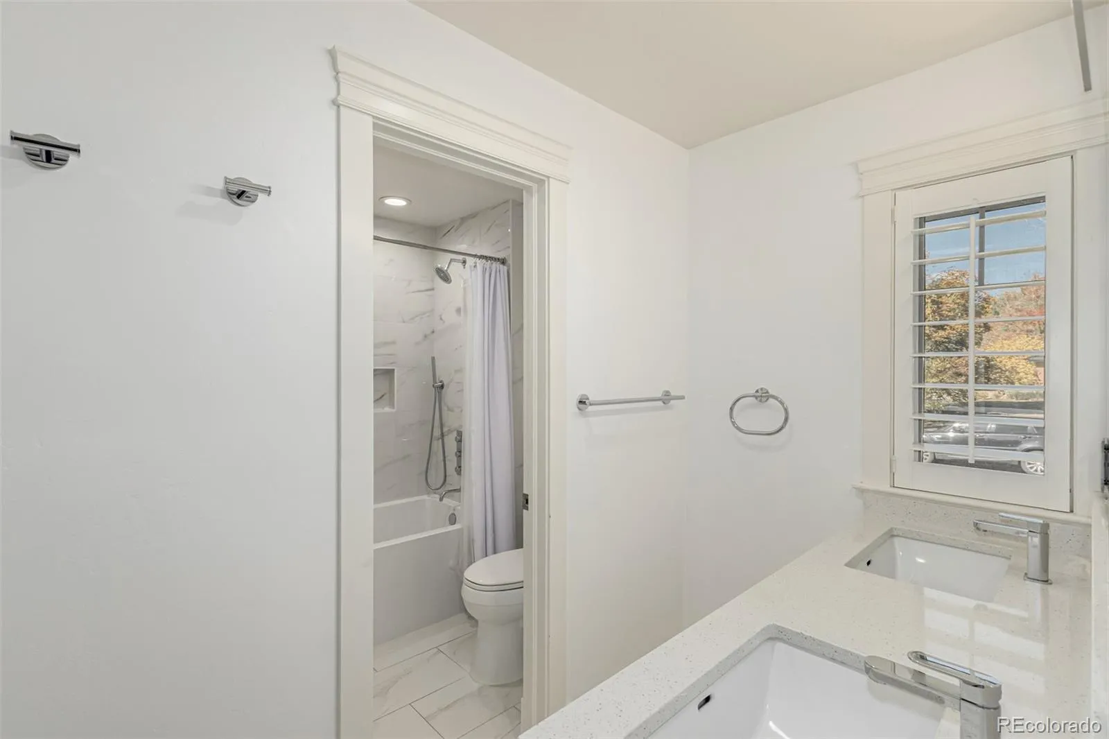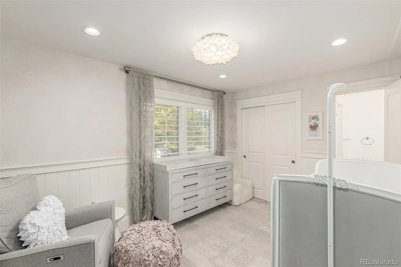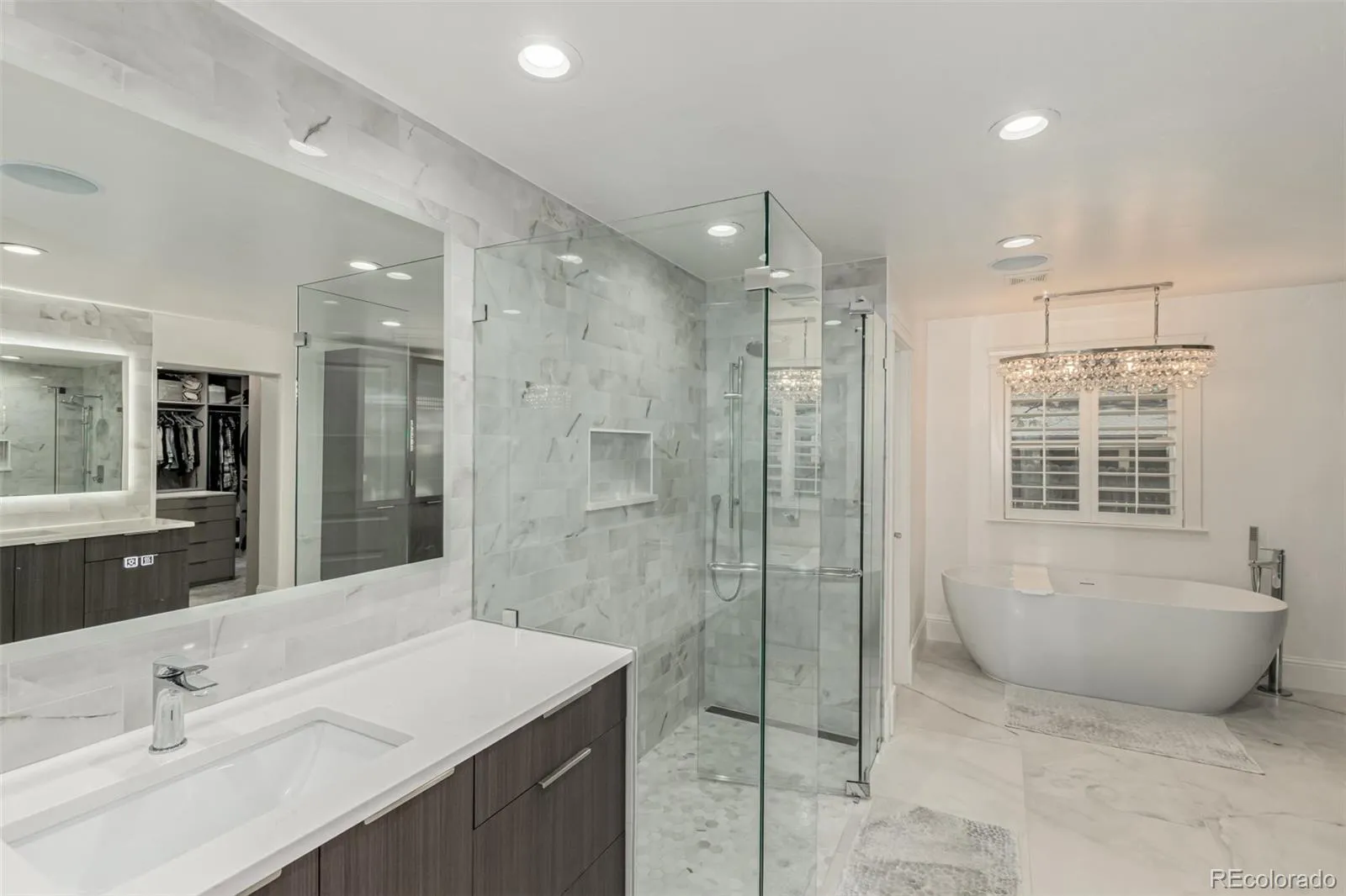 Retreat to the luxurious primary suite, offering plush carpet, a spacious and newly remodeled walk-in closet, and a stunning en-suite bath complete with dual vanities and high-end finishes.