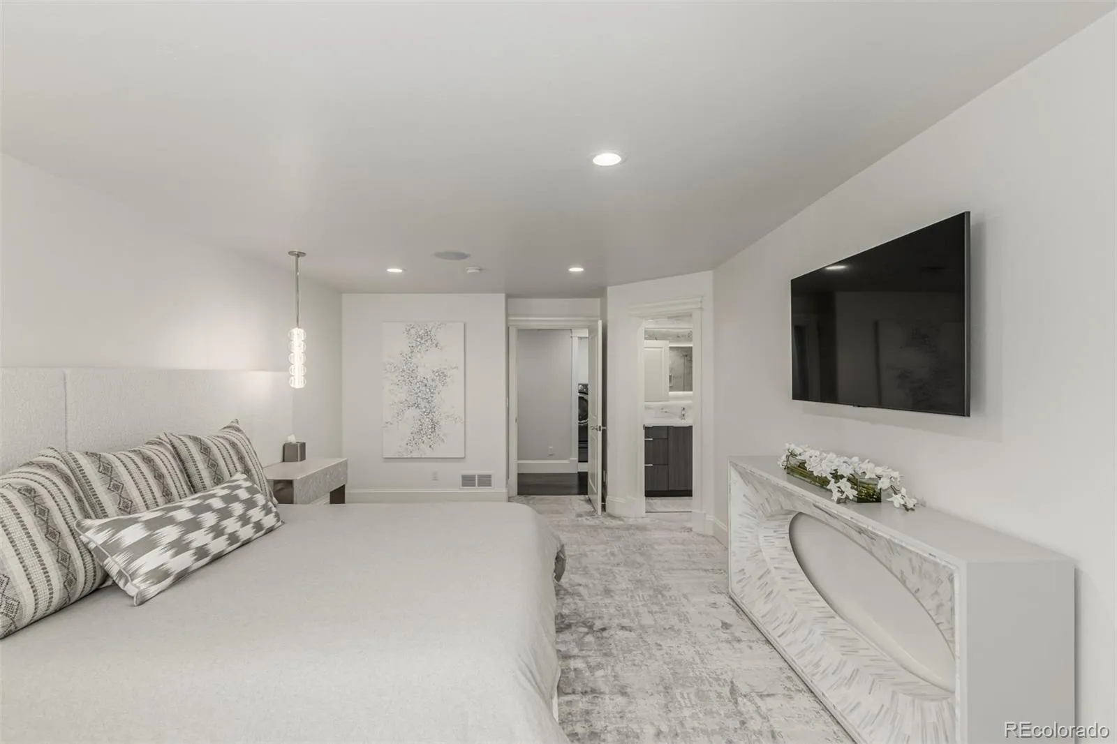Retreat to the luxurious primary suite, offering plush carpet, a spacious and newly remodeled walk-in closet, and a stunning en-suite bath complete with dual vanities and high-end finishes.