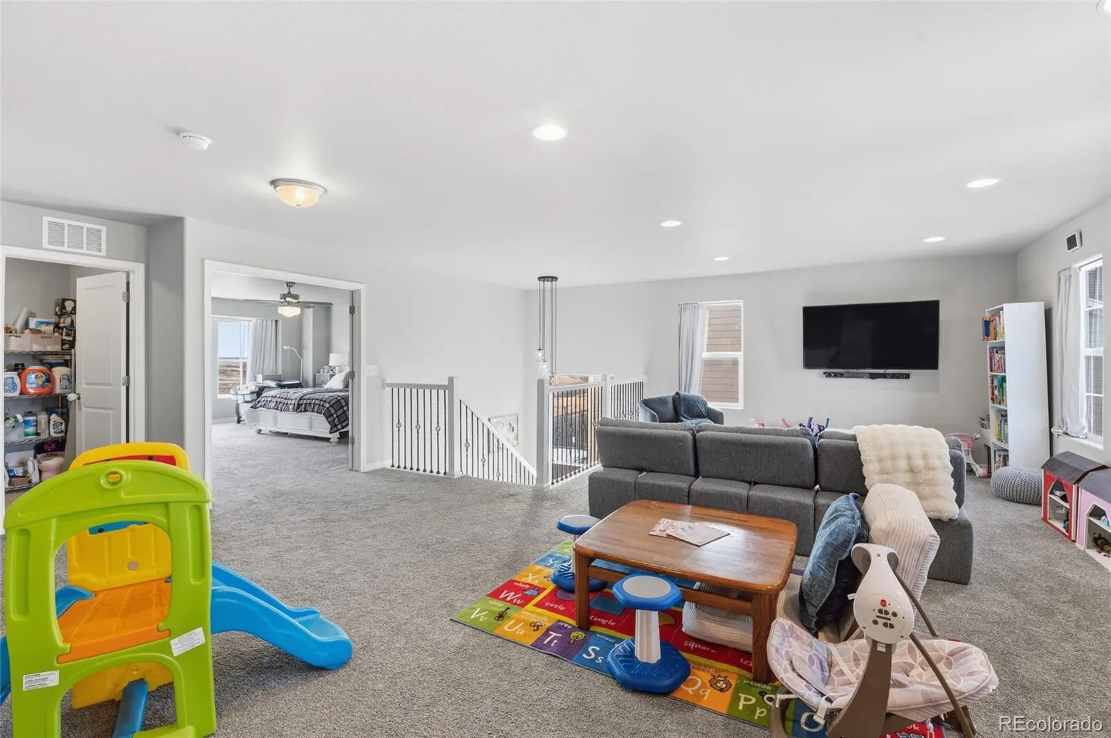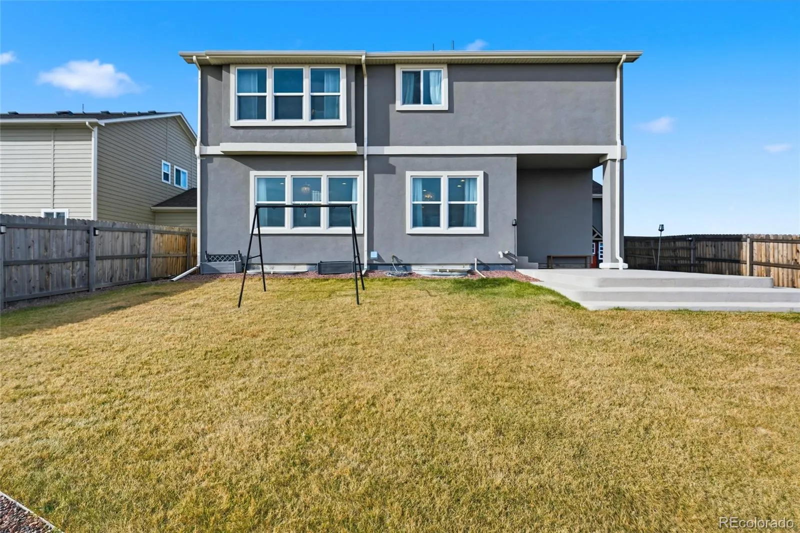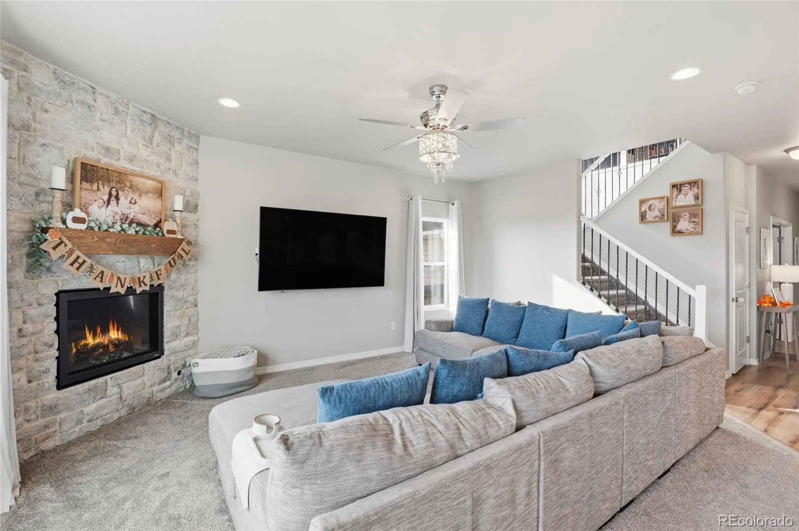 Welcome to this beautiful gem perfectly situated on a private end lot in a peaceful cul-de-sac. This remarkable property backs to open space, offering exceptional privacy, while mountain views from the front add to its Colorado charm. Enjoy serene surroundings with no homes to be built directly behind or across the green space, plus mountain views from the front, including a stunning view of Pikes Peak. Enjoy the quiet surroundings with minimal traffic and the friendly neighborhood atmosphere, complete with frequent community events and a nearby park and playground just steps away. Inside, you’ll find a light-filled, open layout that seamlessly connects the kitchen, dining, and living areas. The chef-worthy kitchen features abundant white cabinetry, double ovens, quartz countertops, a spacious pantry, and a large center island perfect for casual meals or gatherings. The cozy living room invites relaxation with its custom floor-to-ceiling stacked stone fireplace. A private main-level home office provides the perfect space for remote work or study. Upstairs, the home continues to impress with stunning Pikes Peak and mountain views. The expansive loft offers flexible space for a second living area or playroom, while three generously sized bedrooms each have walk-in closets. A thoughtfully placed upper-level laundry room adds to the home’s practical design. The newly finished basement features 9-foot ceilings—taller than most—and multiple egress windows for ample natural light. Currently set up as a professional-quality home gym, this space can easily be converted into a family room or recreation area. The basement also includes a full bedroom and bathroom, making it ideal for guests. The property includes an extra-deep four-car garage with custom overhead storage. This move-in-ready stunner offers a rare combination of tranquility, luxury, and community. Nestled in a quiet setting yet just minutes from modern amenities, this Sterling Ranch home truly has it all.