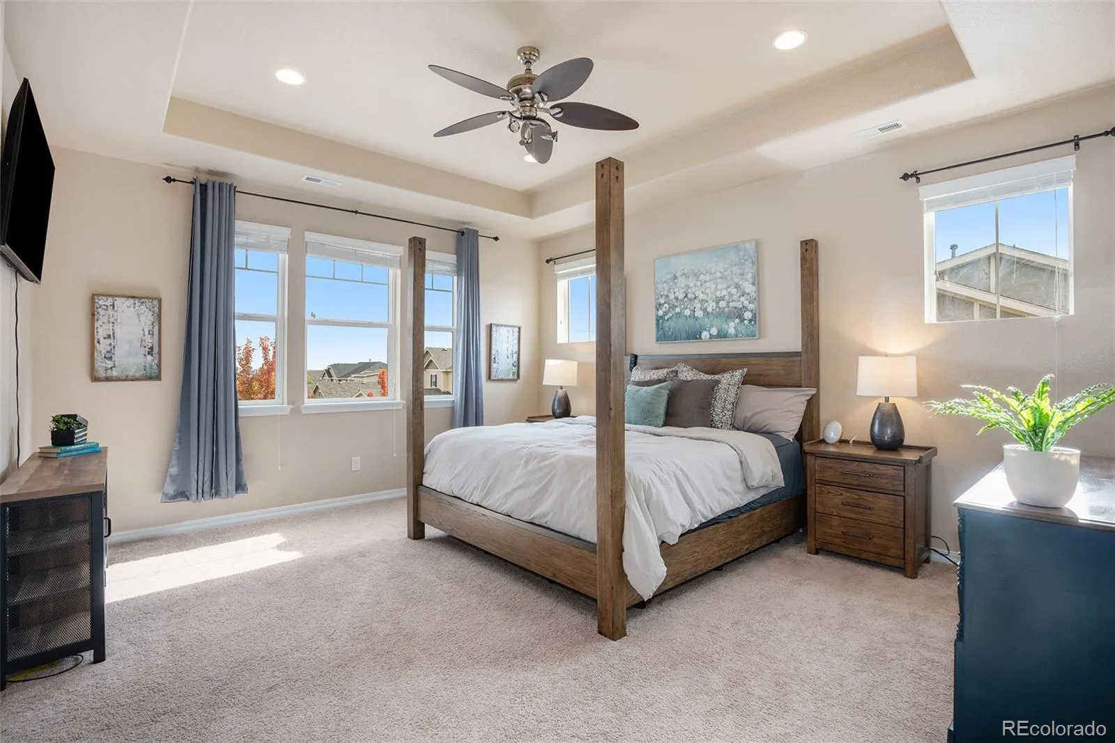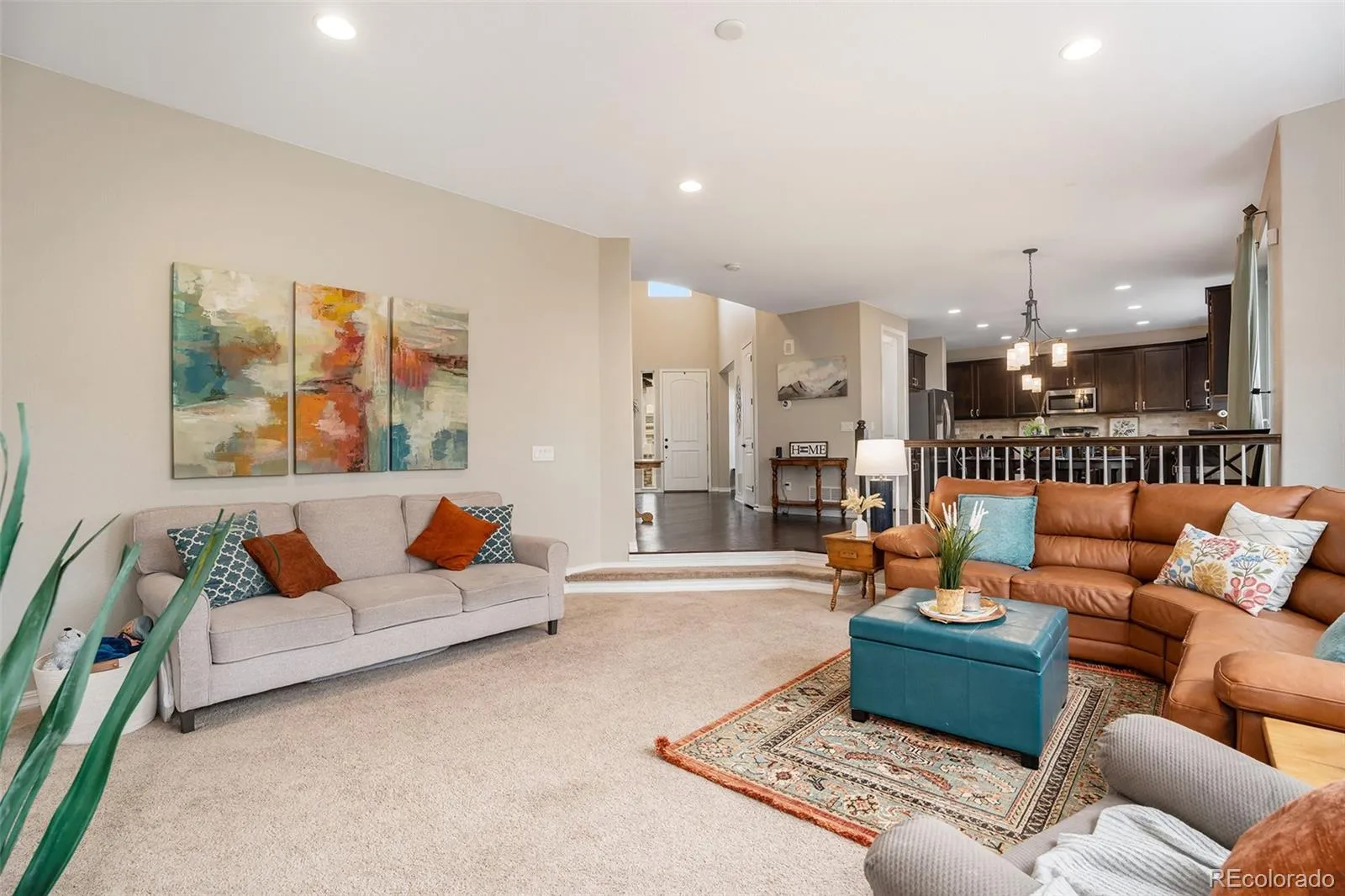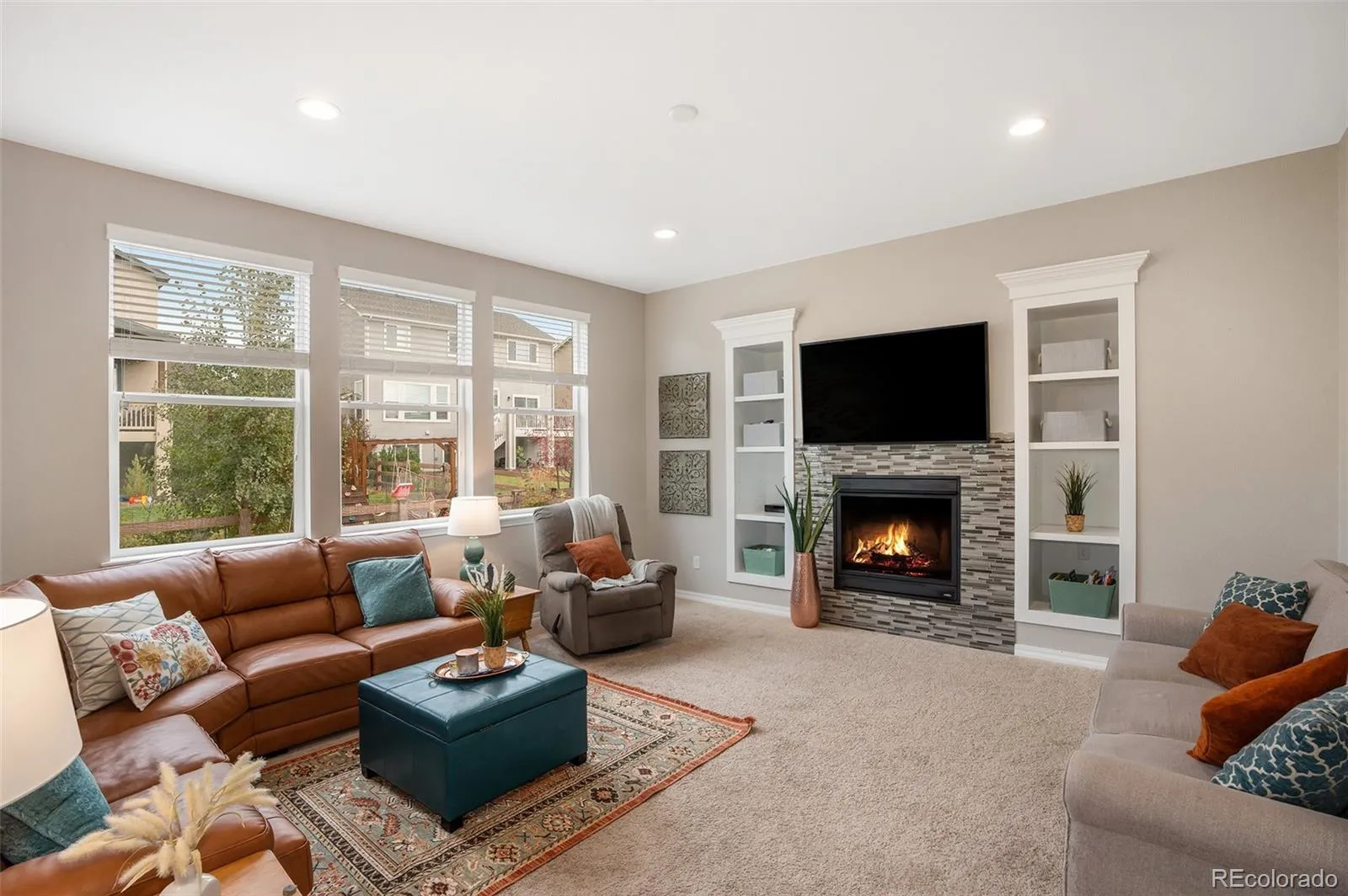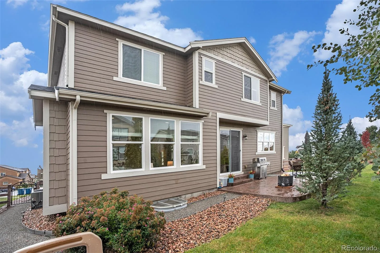 Don’t miss this must-see home located on a quiet cul-de-sac in the highly sought-after Wolf Ranch community! The moment you step inside, you are greeted with a grand entry, a sweeping staircase, and high ceilings, setting the tone for elegance and spacious living. Beautiful wood floors flow through the entry, kitchen, and dining areas, welcoming you into an open-concept great room that’s ideal for entertaining. The gourmet kitchen is a chef’s dream with granite countertops, a stylish tile backsplash, a gas range, a large kitchen island, pantry, and elegant 42” cabinetry with crown molding. The kitchen and nook flow right into the great room featuring a gas fireplace with tile surround. A large functional dining room, a main-level dedicated office, plus a mudroom with built-in shelves completes the main floor. Upstairs, you’ll find a luxurious primary suite with a 5-piece bath, double vanity, contemporary tile shower, soaking tub, and walk-in closet. Three additional spacious upper-level bedrooms, one with its own private bath and walk-in closet, and two sharing a Jack and Jill bath with individual vanities. An upper-level laundry with utility sink adds extra convenience. The finished basement offers 9’ ceilings, a stylish wet bar, a huge family/rec room wired for surround sound, an additional bedroom with walk-in closet and a full bath, perfect for entertaining or multi-generational living. Outside, relax and enjoy the mountain view from the stamped concrete patio with fenced yard, a 3 car tandem garage, plus a South facing driveway which allows for snow melt! The community features a pool and clubhouse, parks, and top-rated schools, so don’t miss your opportunity!
