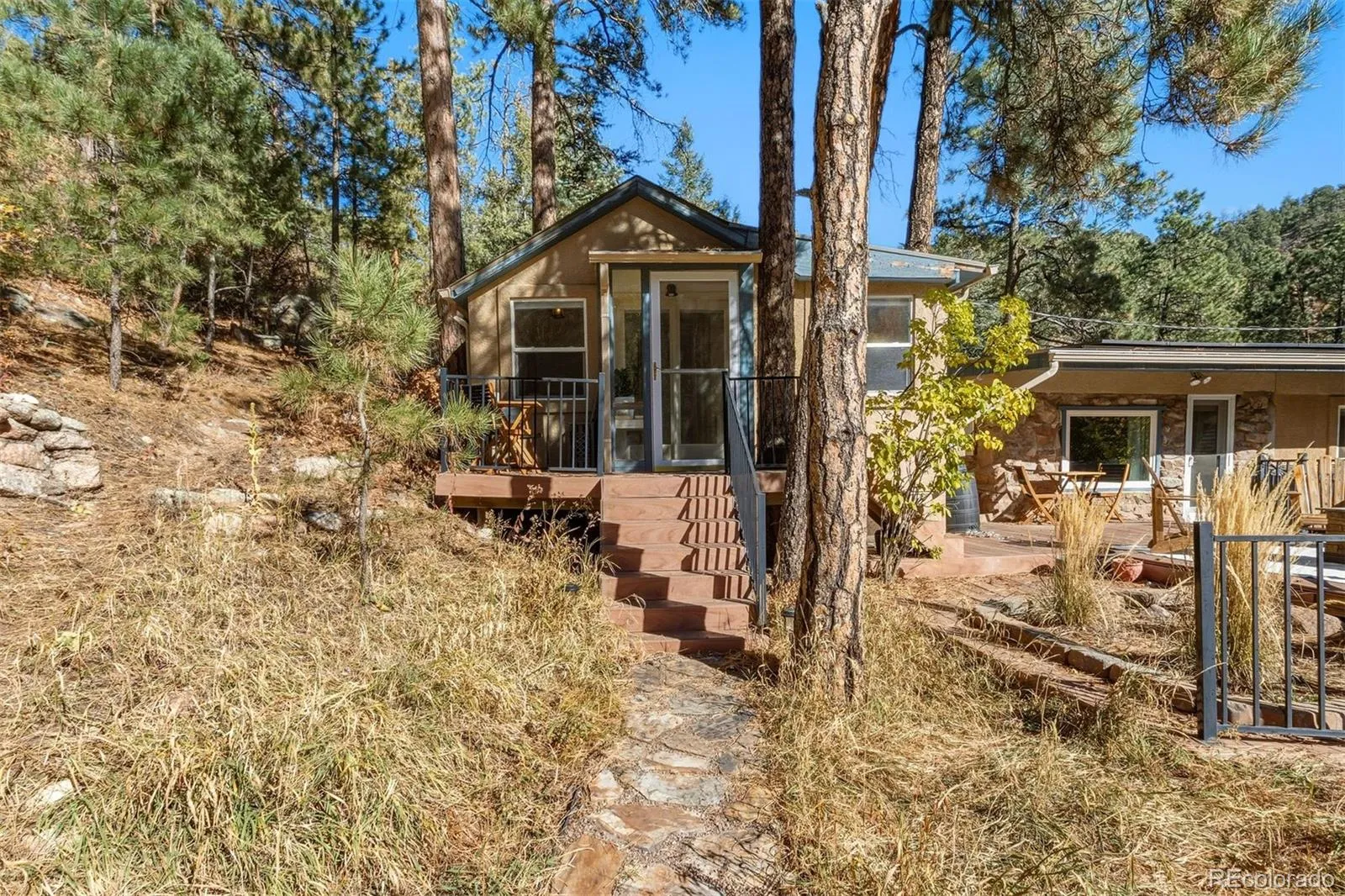 Nestled in a quiet canyon framed by towering pines, 1144 Rock Creek Canyon offers a rare blend of seclusion, natural beauty, and effortless convenience just minutes from Colorado Springs yet worlds away in feel. Set on over n acre with a seasonal brook and private forested views, this exceptional property features a thoughtfully updated 2,800 sq. ft. main home paired with a fully renovated ADU, creating unmatched flexibility for every lifestyle. Inside the main residence, sun-filled living and dining spaces connect seamlessly to the outdoors, while a bright year-round sunroom brings Colorado’s signature light into daily living. The well-designed kitchen anchors the home with both style and practicality. A newly completed 600 sq. ft. addition (2025) expands the possibilities a second living area, studio, gym, or retreat for modern living. With 3 bedrooms, 2 baths, and 2 private offices, the floor plan adapts beautifully for remote work, creative pursuits, or guest accommodations. Between the main home and ADU, a stunning rooftop patio becomes the centerpiece of the property an elevated outdoor haven perfect for entertaining or taking in panoramic mountain views. The renovated ADU offers its own kitchen, bath, and living area, making it ideal for extended family, guests, or reliable income potential. Located outside the city limits, the ADU allows for options and income. Located outside city limits for added privacy, yet close to the city, restaurants, trails, and conveniences, this sanctuary captures the best of Colorado living peaceful, versatile, and perfectly placed for every buyer seeking space and serenity without sacrificing access.